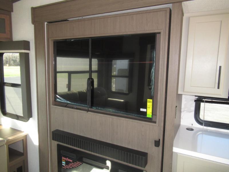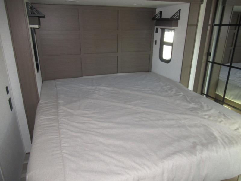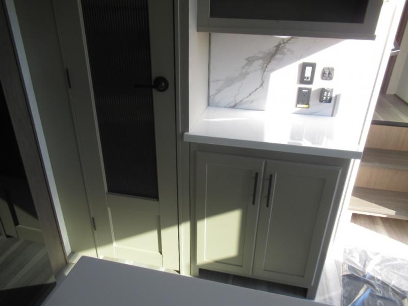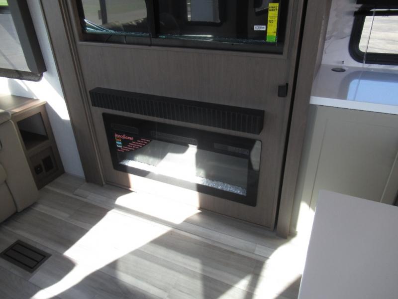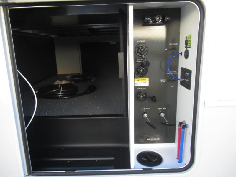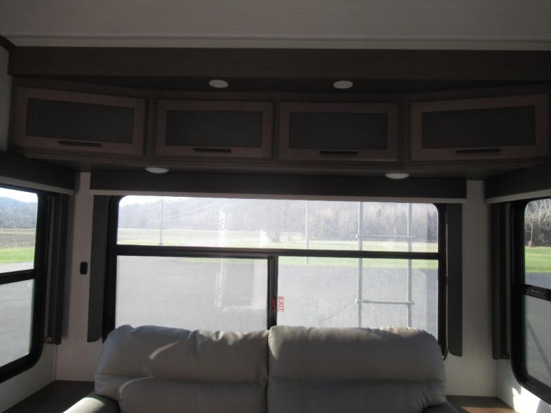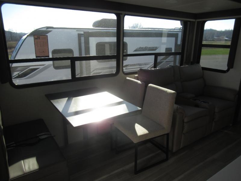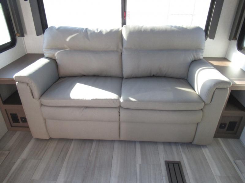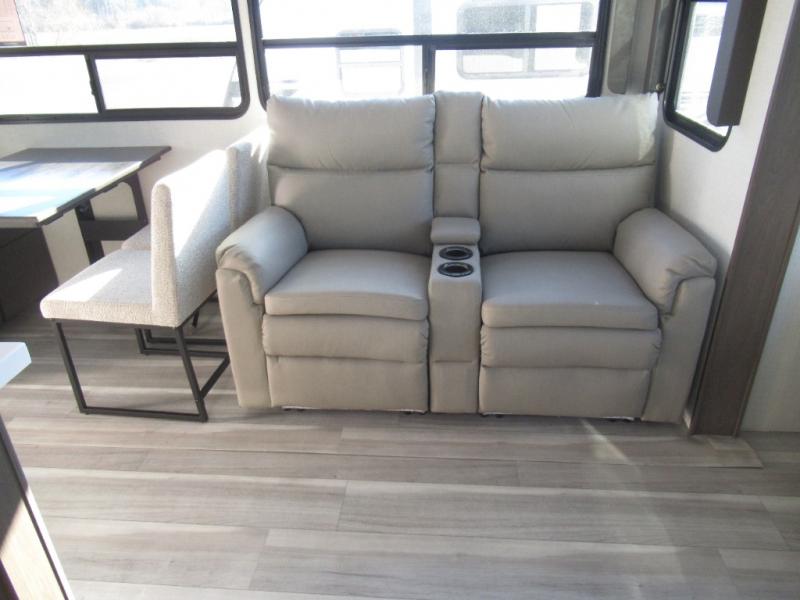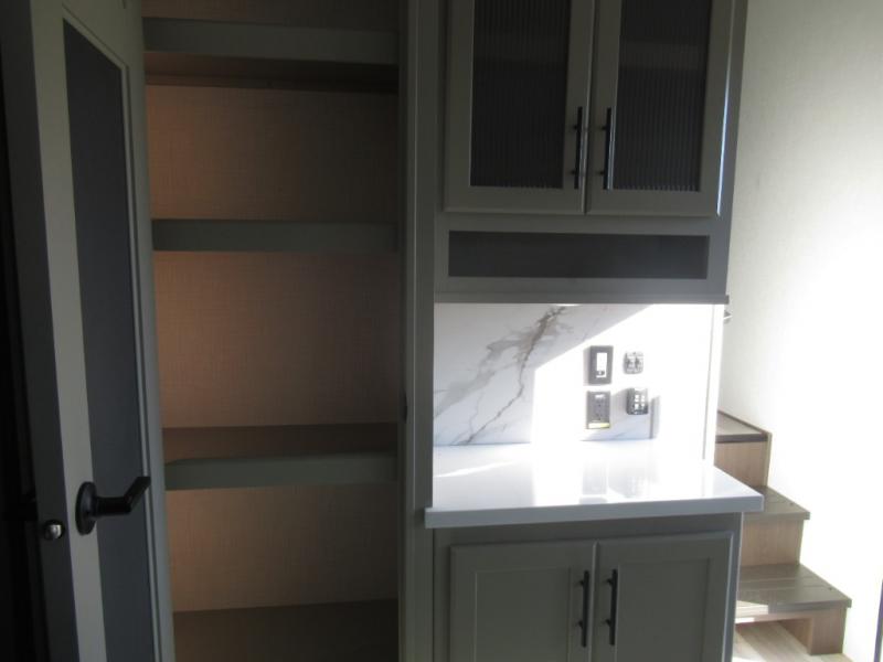 The dual opposing slides in the combined kitchen and living area will give you an open floorplan! You'll sleep on the queen-size bed in the front private bedroom, and there is under-bed storage, a full-height wardrobe, and a dresser with hidden storage for all of your personal belongings. As you spend time in the main living area, you'll appreciate having extra space thanks to the set of opposing slides, and the kitchen island will be easy to work around. You'll be able to relax on the tri-fold sleeper sofa and theater seating while you watch the LED HDTV with an pivoting entertainment door and hidden pantry. There is also a booth dinette with storage drawers, convenient shoe storage right as you enter the unit, and an exterior unobstructed pass-thru storage so nothing gets left behind.