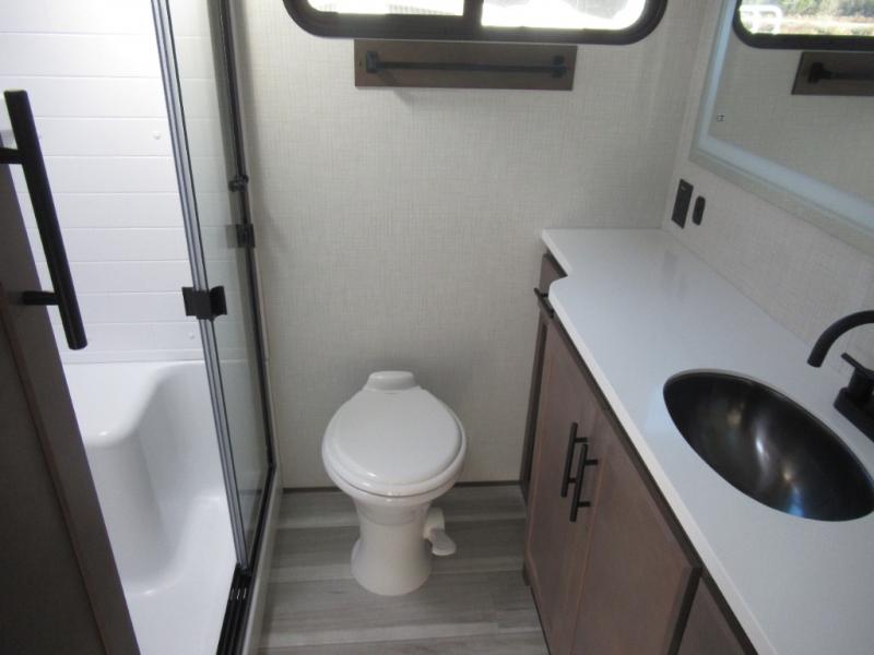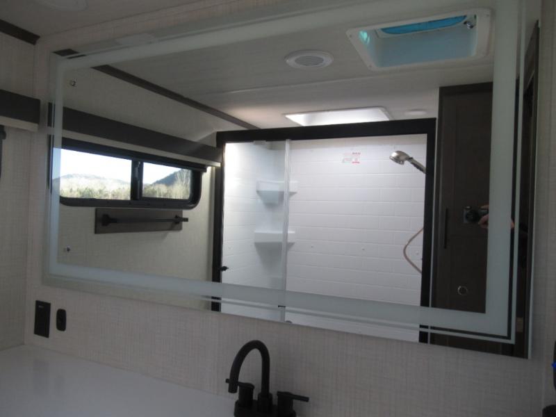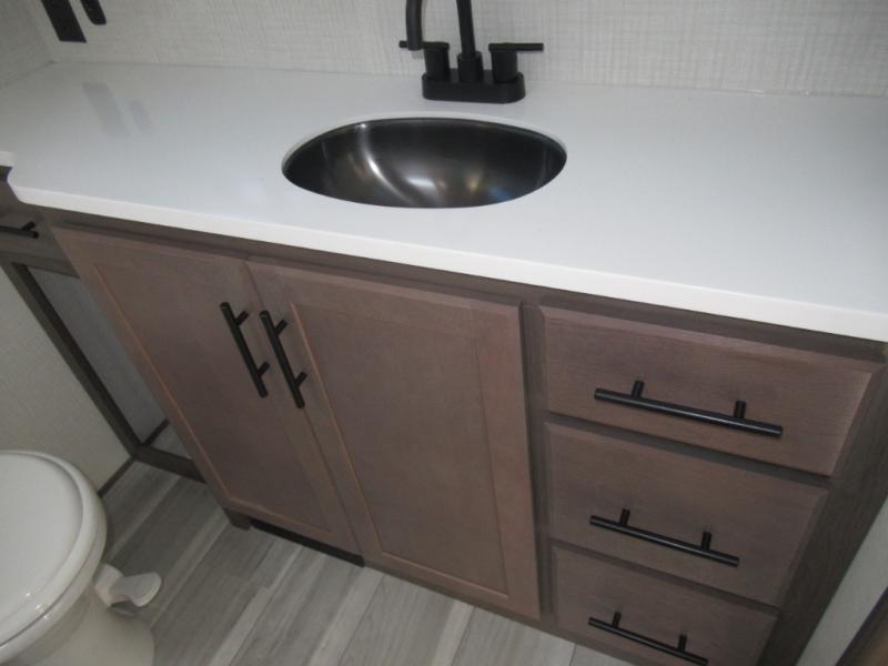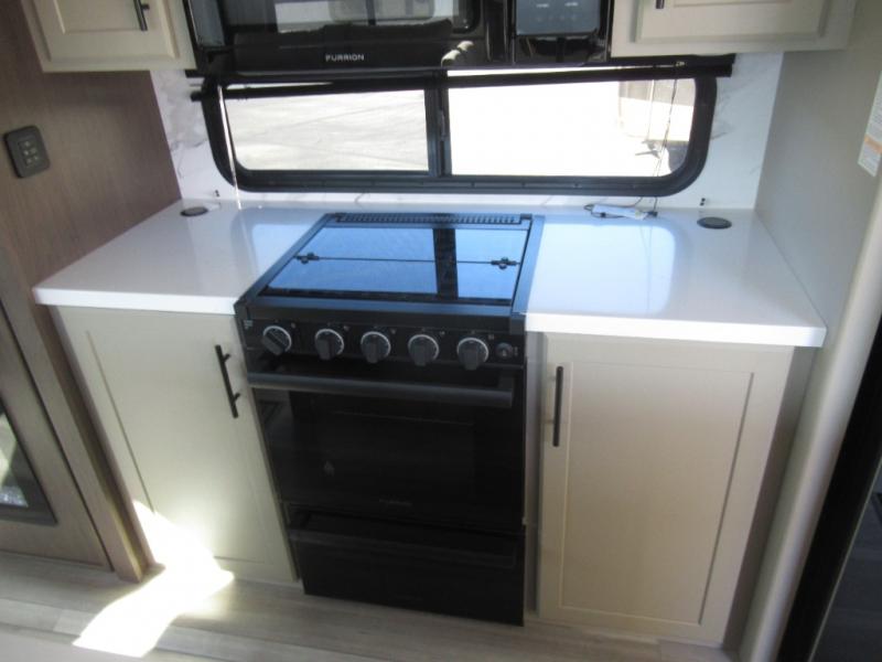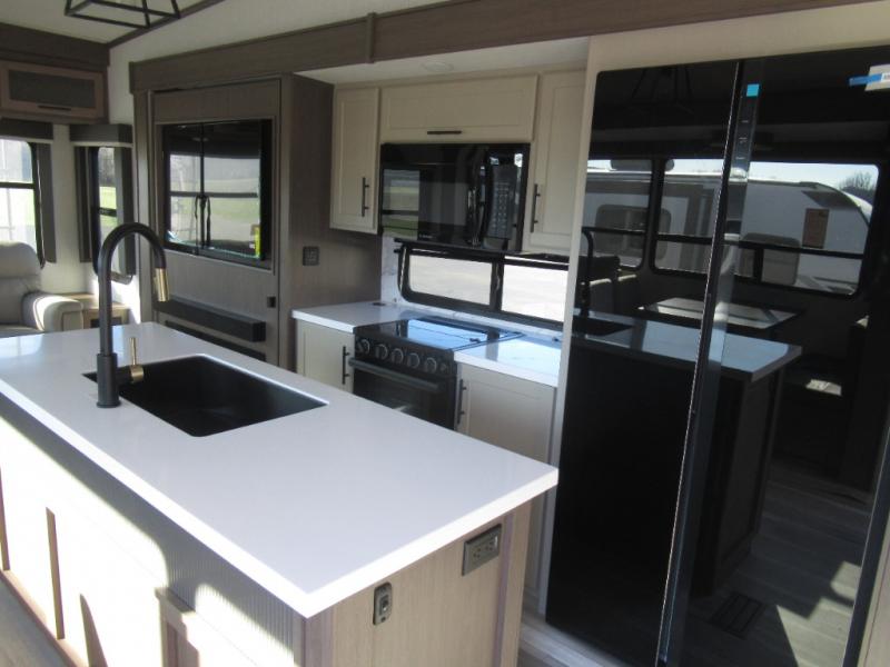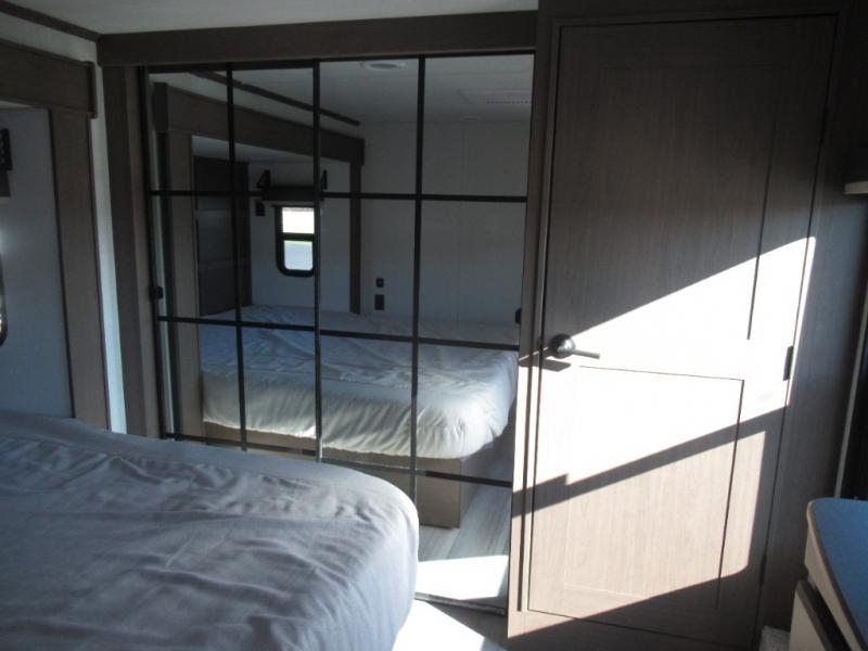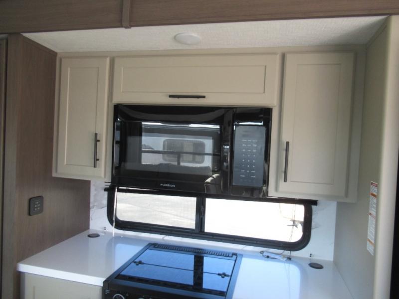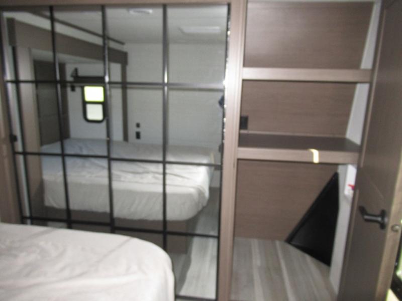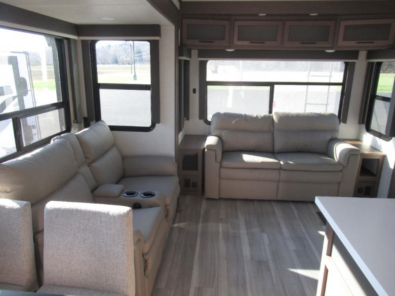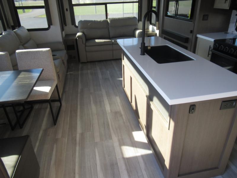 The dual opposing slides in the combined kitchen and living area will give you an open floorplan! You'll sleep on the queen-size bed in the front private bedroom, and there is under-bed storage, a full-height wardrobe, and a dresser with hidden storage for all of your personal belongings. As you spend time in the main living area, you'll appreciate having extra space thanks to the set of opposing slides, and the kitchen island will be easy to work around. You'll be able to relax on the tri-fold sleeper sofa and theater seating while you watch the LED HDTV with an pivoting entertainment door and hidden pantry. There is also a booth dinette with storage drawers, convenient shoe storage right as you enter the unit, and an exterior unobstructed pass-thru storage so nothing gets left behind.