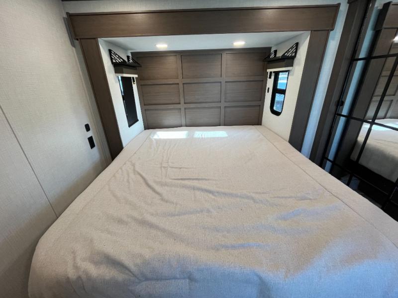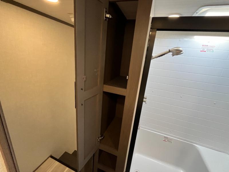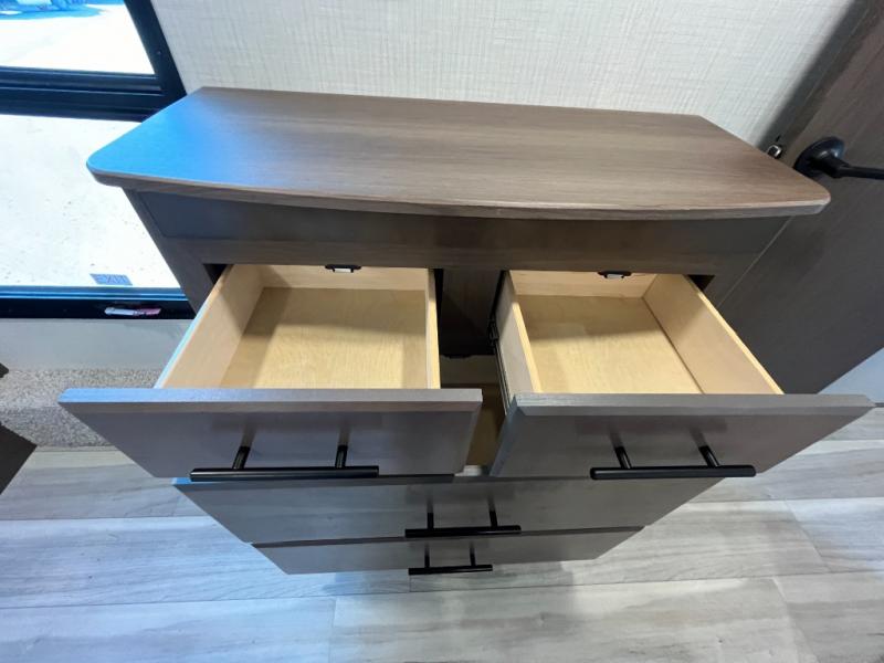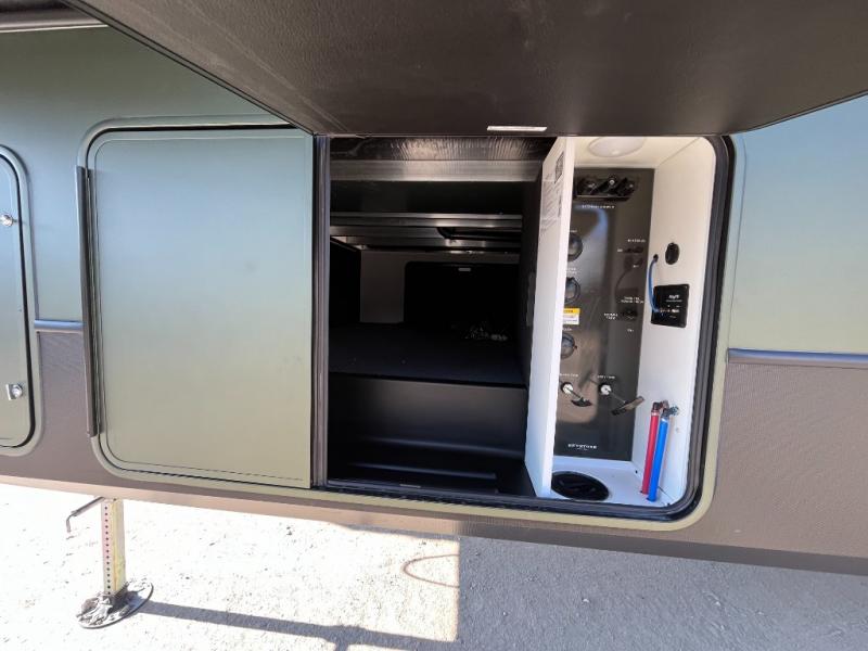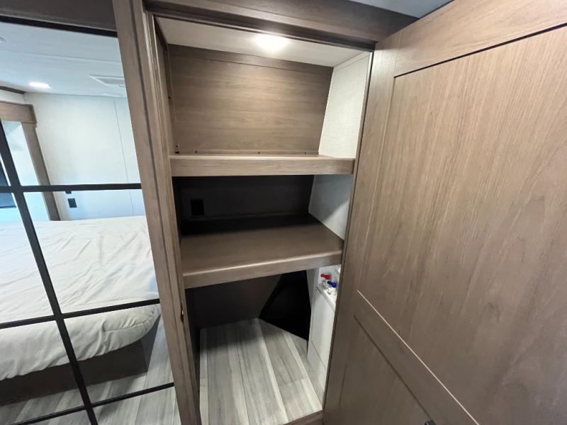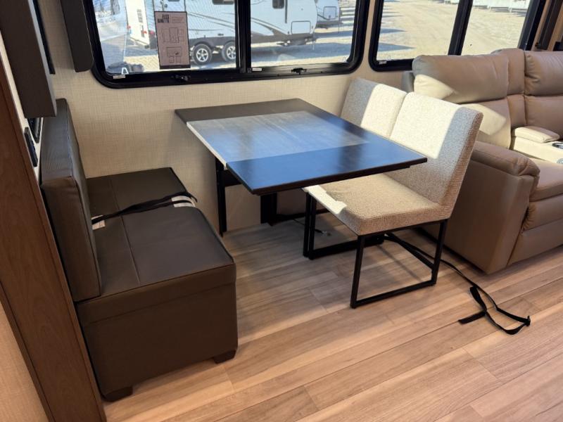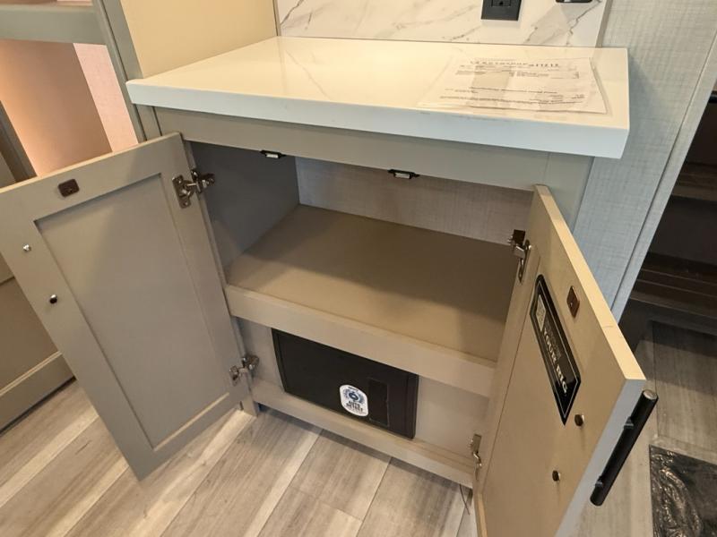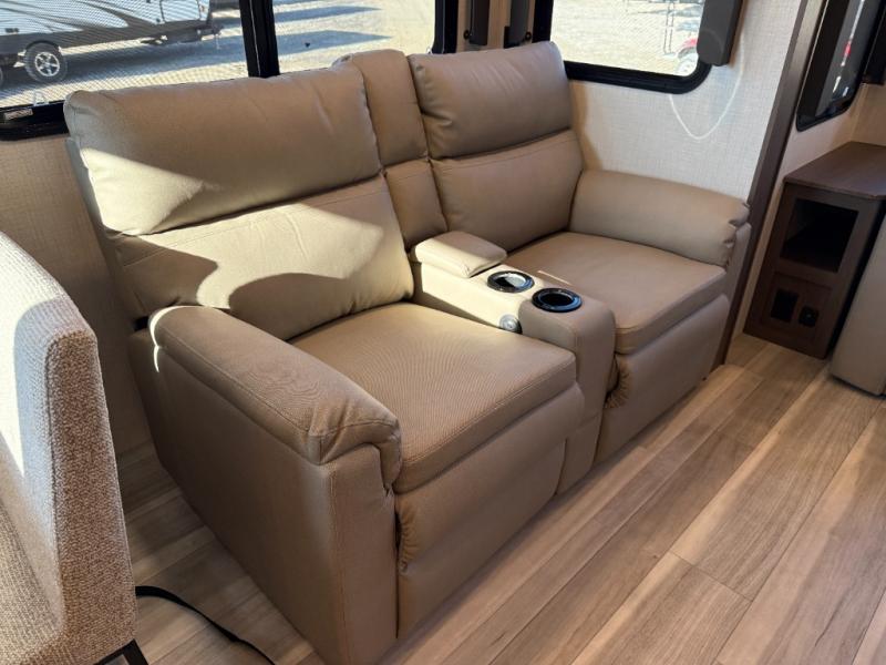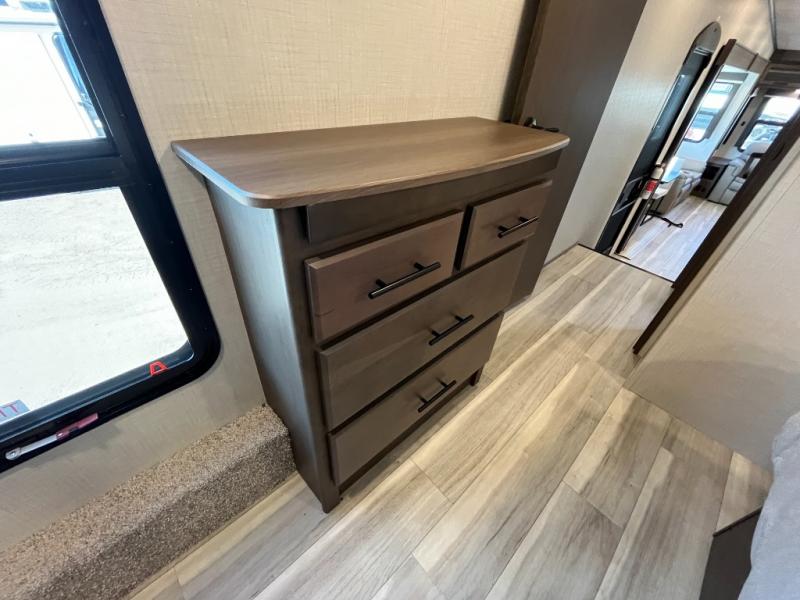 The dual opposing slides in the combined kitchen and living area will give you an open floorplan! You'll sleep on the queen-size bed in the front private bedroom, and there is under-bed storage, a full-height wardrobe, and a dresser with hidden storage for all of your personal belongings. As you spend time in the main living area, you'll appreciate having extra space thanks to the set of opposing slides, and the kitchen island will be easy to work around. You'll be able to relax on the tri-fold sleeper sofa and theater seating while you watch the LED HDTV with an pivoting entertainment door and hidden pantry. There is also a booth dinette with storage drawers, convenient shoe storage right as you enter the unit, and an exterior unobstructed pass-thru storage so nothing gets left behind.