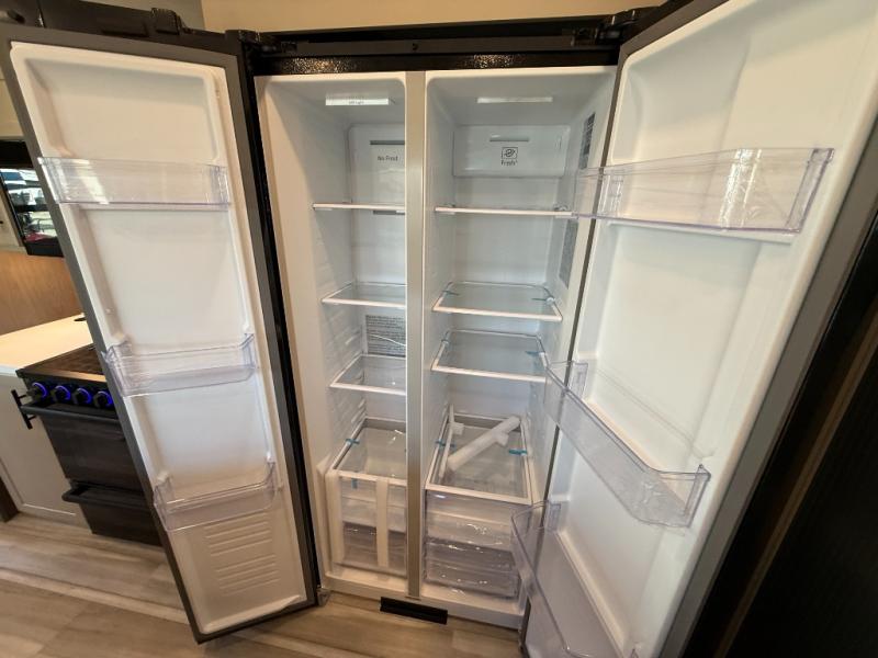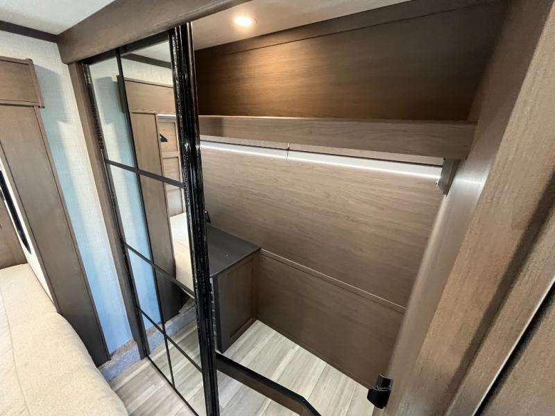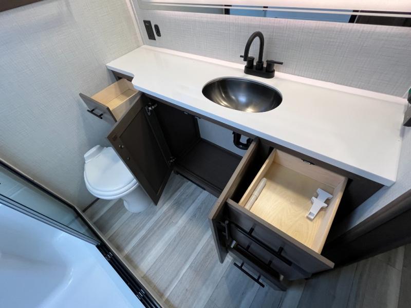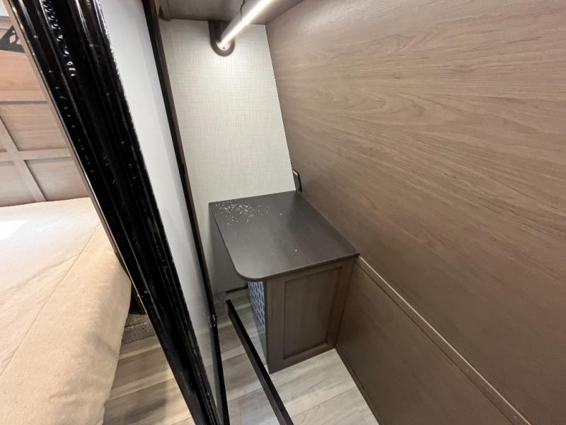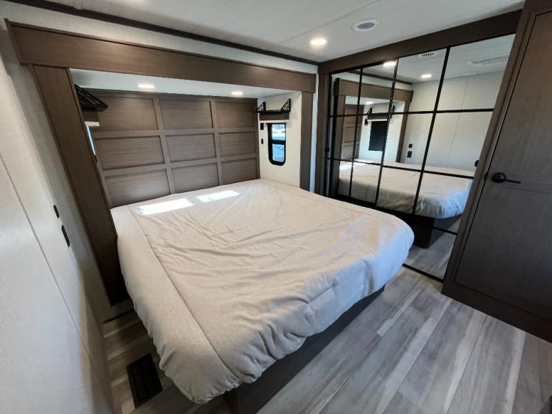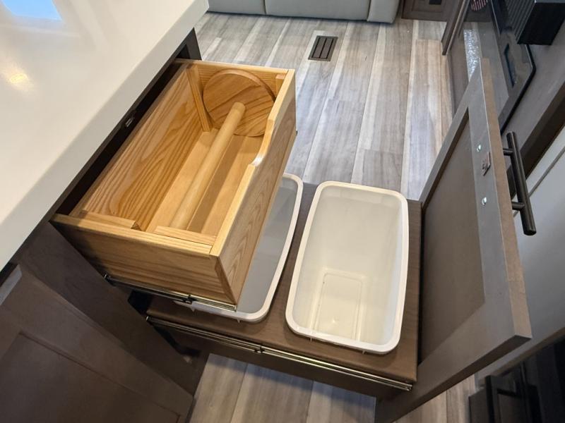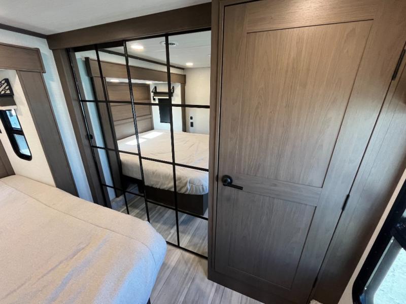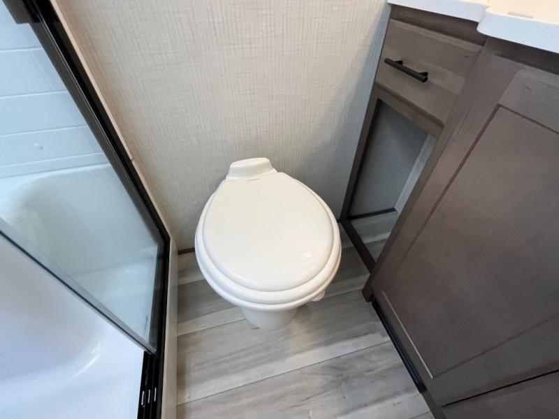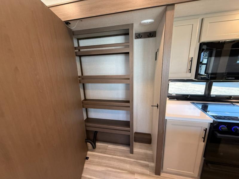 The dual opposing slides in the combined kitchen and living area will give you an open floorplan! You'll sleep on the queen-size bed in the front private bedroom, and there is under-bed storage, a full-height wardrobe, and a dresser with hidden storage for all of your personal belongings. As you spend time in the main living area, you'll appreciate having extra space thanks to the set of opposing slides, and the kitchen island will be easy to work around. You'll be able to relax on the tri-fold sleeper sofa and theater seating while you watch the LED HDTV with an pivoting entertainment door and hidden pantry. There is also a booth dinette with storage drawers, convenient shoe storage right as you enter the unit, and an exterior unobstructed pass-thru storage so nothing gets left behind.