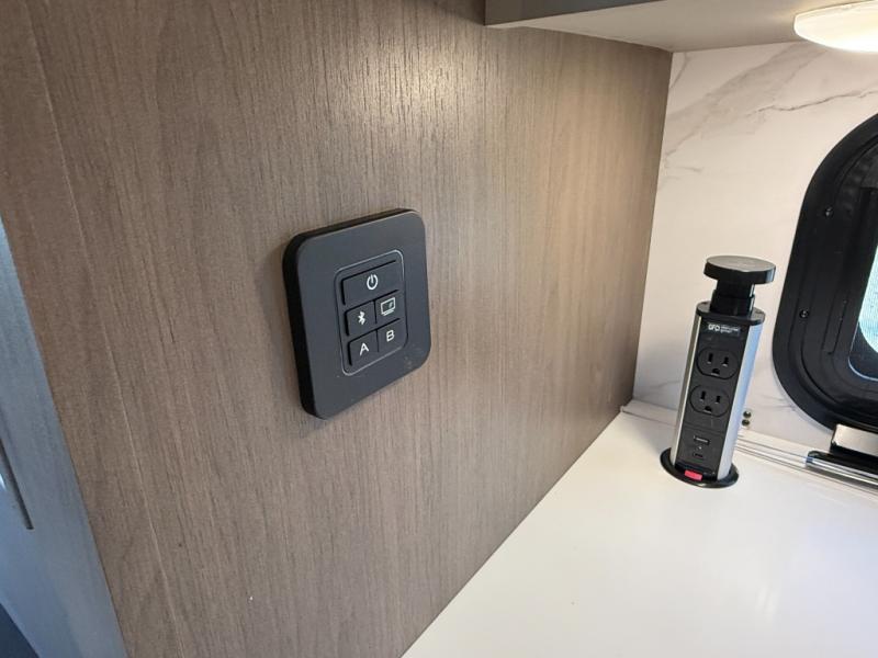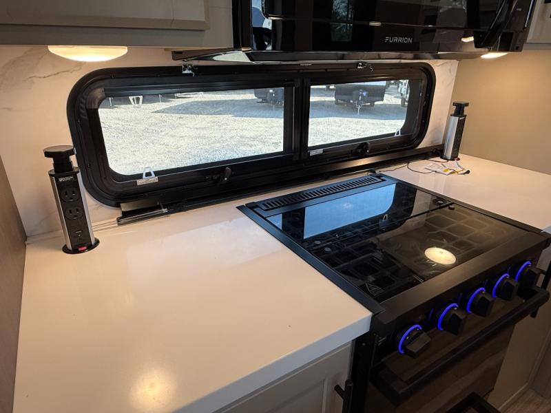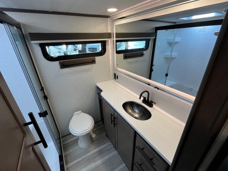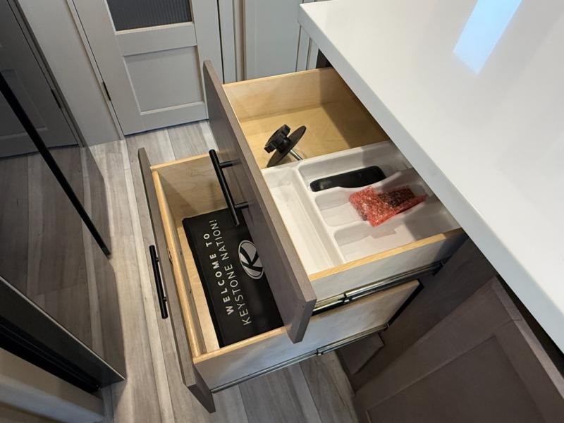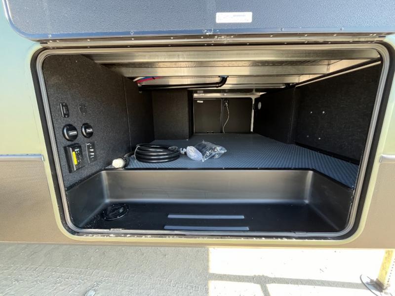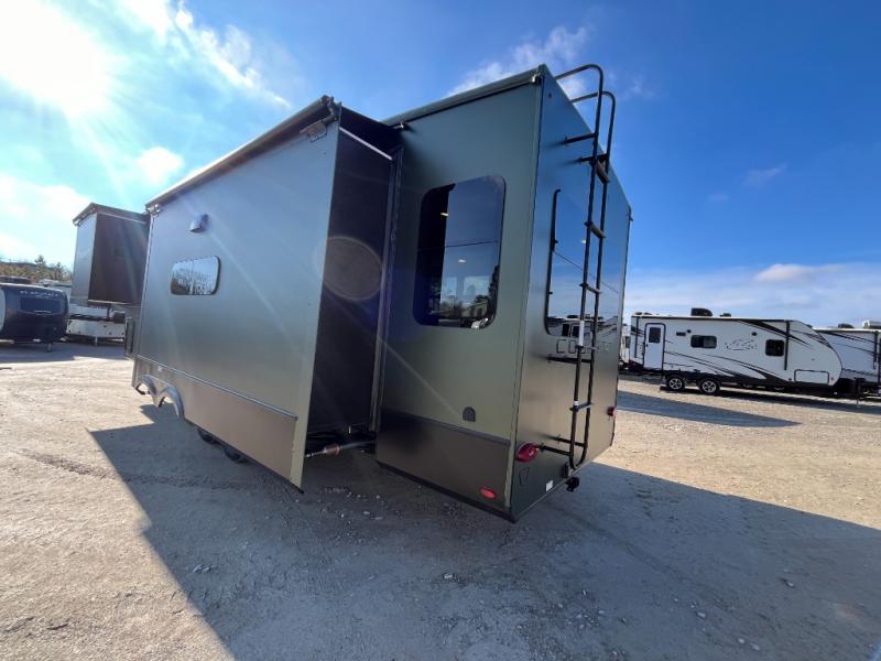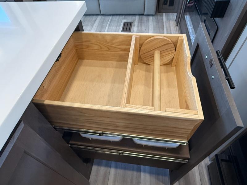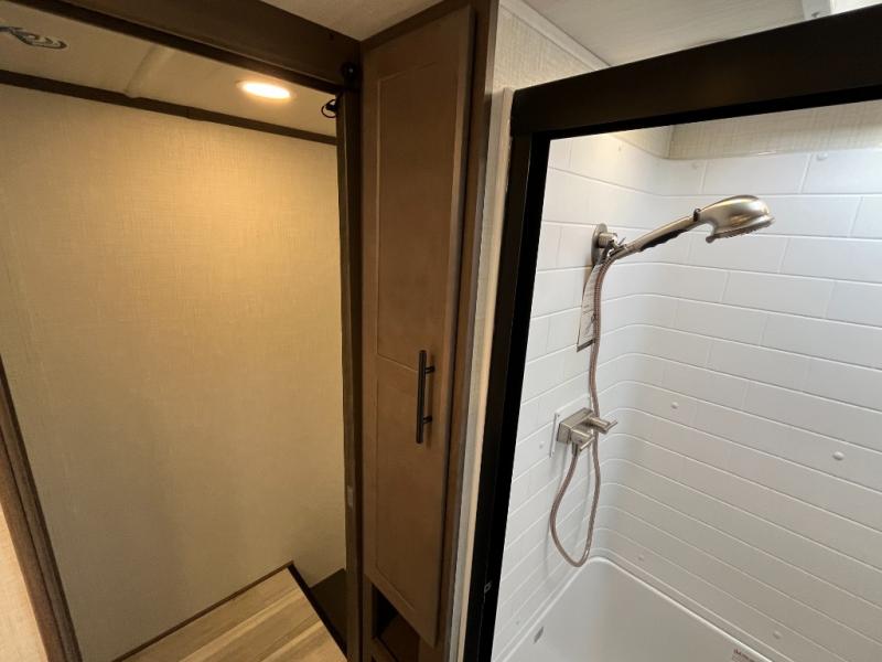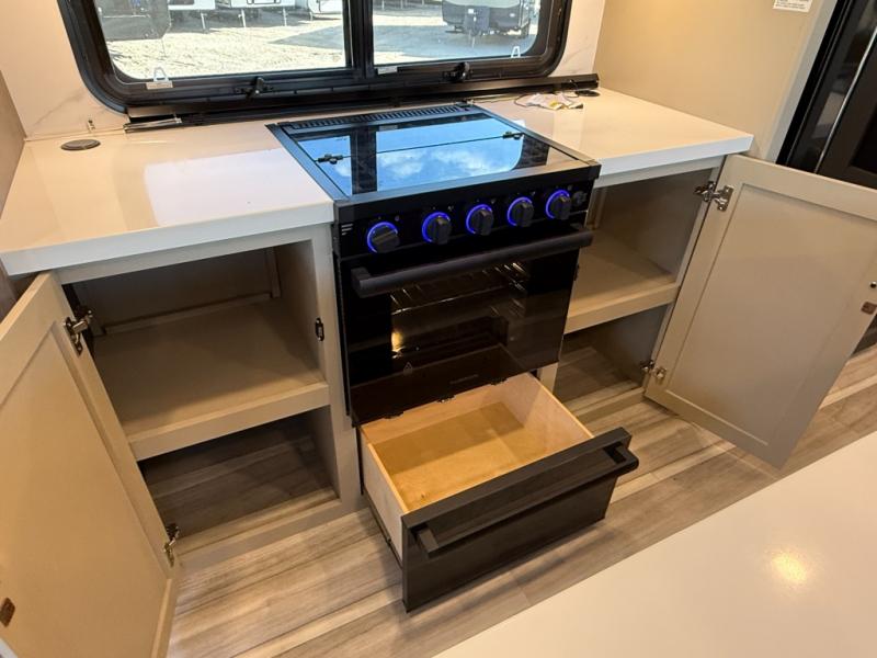 The dual opposing slides in the combined kitchen and living area will give you an open floorplan! You'll sleep on the queen-size bed in the front private bedroom, and there is under-bed storage, a full-height wardrobe, and a dresser with hidden storage for all of your personal belongings. As you spend time in the main living area, you'll appreciate having extra space thanks to the set of opposing slides, and the kitchen island will be easy to work around. You'll be able to relax on the tri-fold sleeper sofa and theater seating while you watch the LED HDTV with an pivoting entertainment door and hidden pantry. There is also a booth dinette with storage drawers, convenient shoe storage right as you enter the unit, and an exterior unobstructed pass-thru storage so nothing gets left behind.