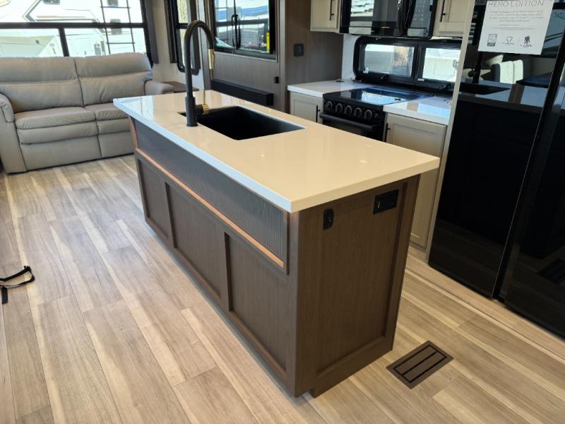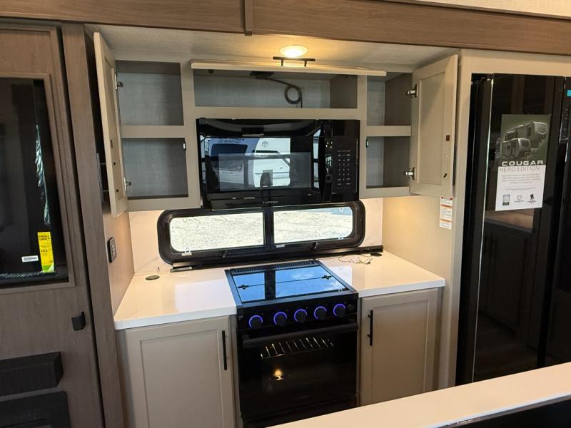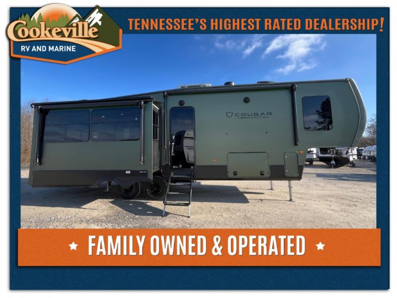 Spend more time having fun and less time worrying about your RV with the Keystone Cougar fifth wheel! These units have all that you will need for excellent vacations. The interior comes with 5/8" one-piece DynaSpan® flooring, tall slide outs for added comfort and head room, night roller shades throughout, and residential, shaker style hardwood cabinet doors and drawers. You will also enjoy decorative crown molding, a 5,500 BTU electric fireplace with thermostat control and remote, and a Max Air exhaust fan with rain sensor. The exterior is also fully outfitted with a convenience center, friction-hinge entry door, electric four-point auto leveling system, and slam-latch baggage doors. Each model is available with the optional Hero Edition. By choosing this edition, you can help support our nation's heros and their families by contributing to the Wounded Warrior Project. This optional package features an industry exclusive full-body paint matte finish, frameless windows, a glass entry door, blackout rims, and green LED exterior accent lighting; see dealer for more details!