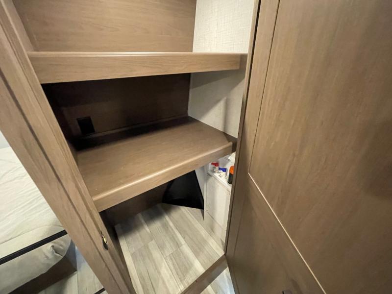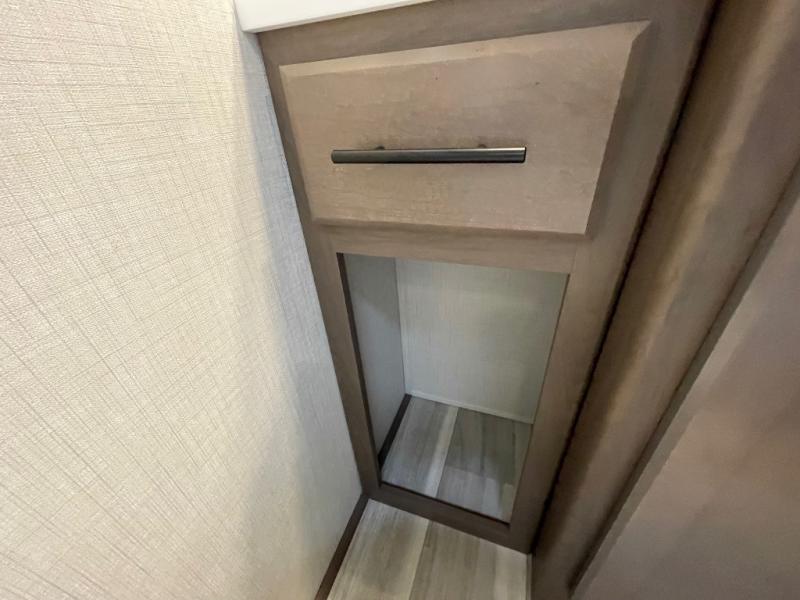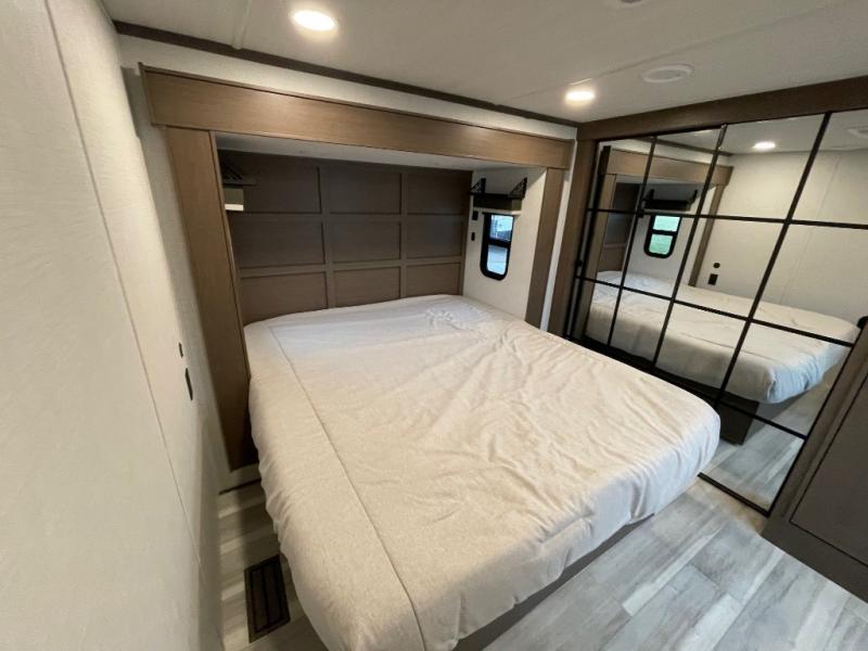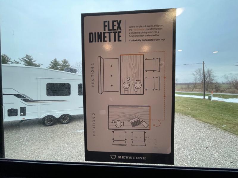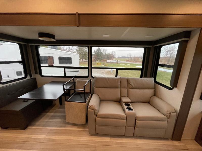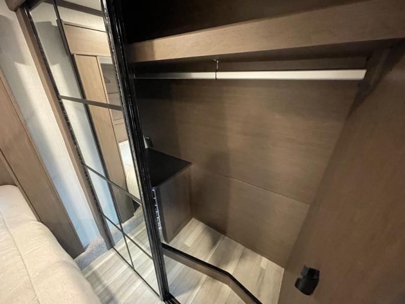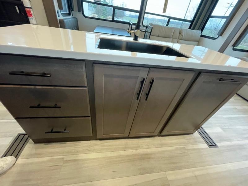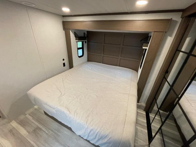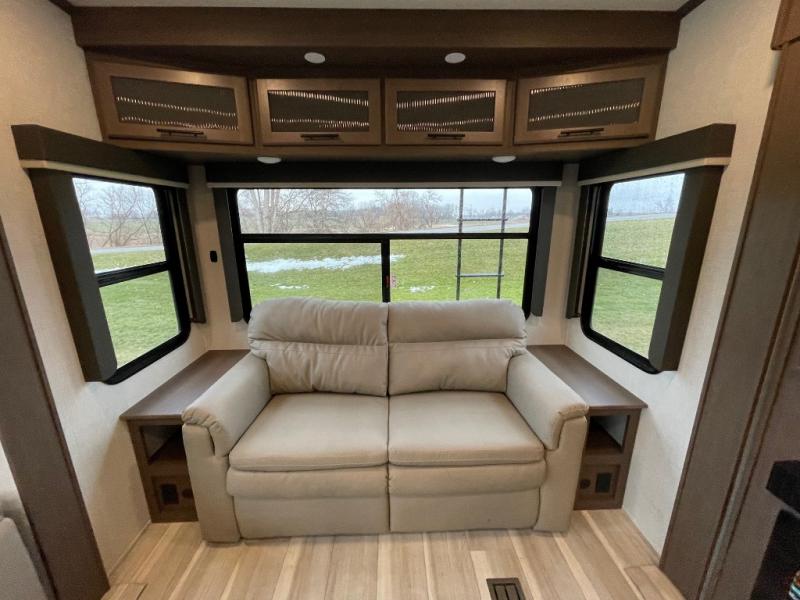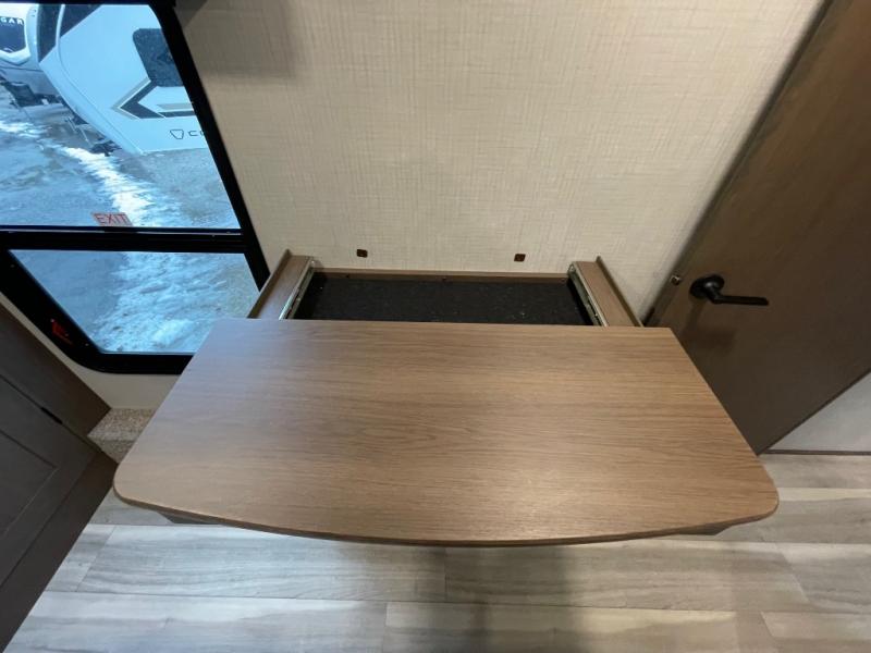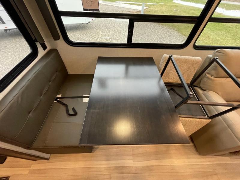 The dual opposing slides in the combined kitchen and living area will give you an open floorplan! You'll sleep on the queen-size bed in the front private bedroom, and there is under-bed storage, a full-height wardrobe, and a dresser with hidden storage for all of your personal belongings. As you spend time in the main living area, you'll appreciate having extra space thanks to the set of opposing slides, and the kitchen island will be easy to work around. You'll be able to relax on the tri-fold sleeper sofa and theater seating while you watch the LED HDTV with an pivoting entertainment door and hidden pantry. There is also a booth dinette with storage drawers, convenient shoe storage right as you enter the unit, and an exterior unobstructed pass-thru storage so nothing gets left behind.