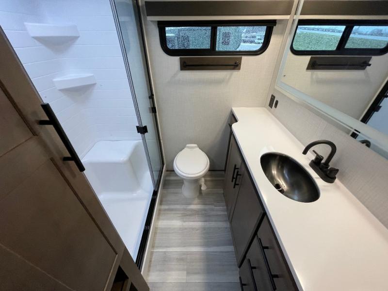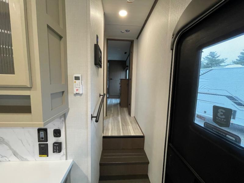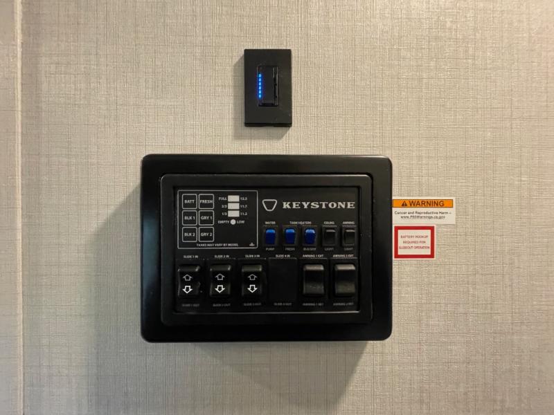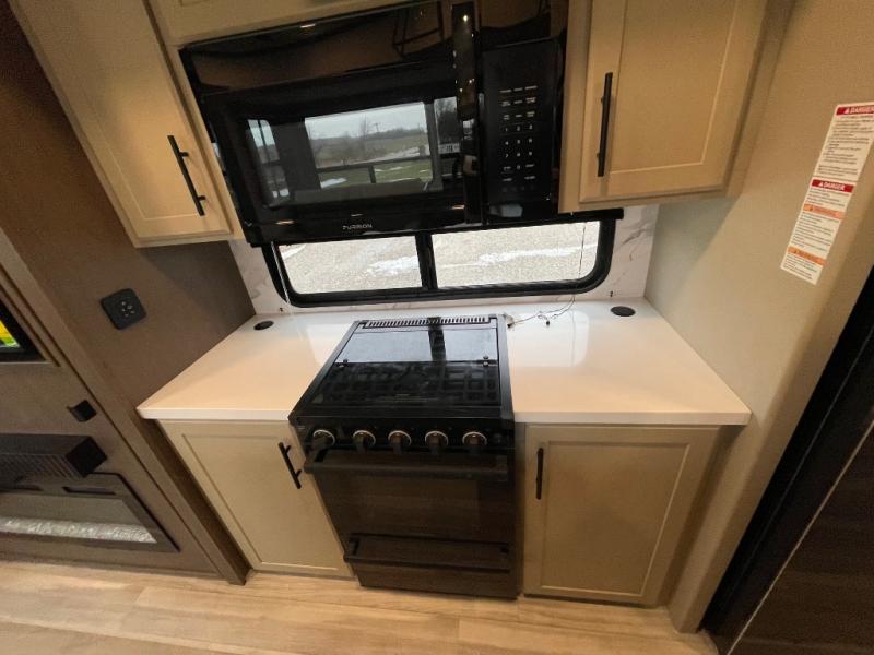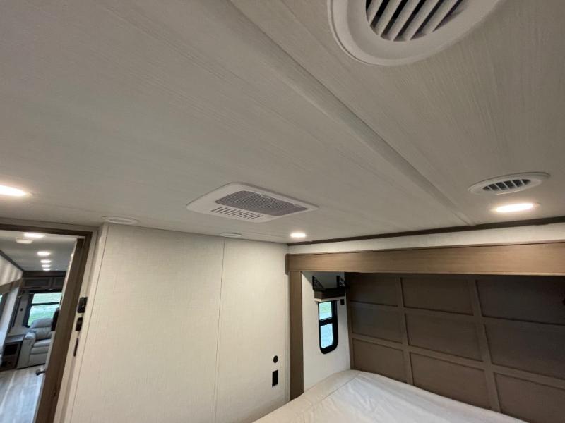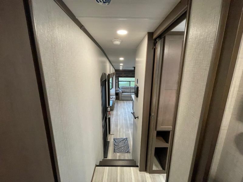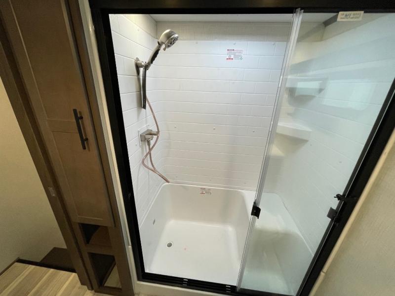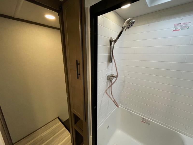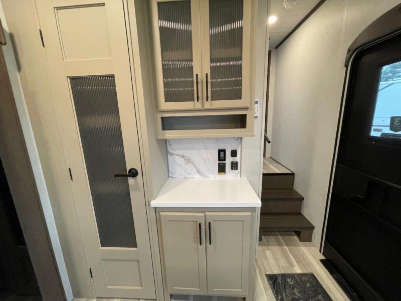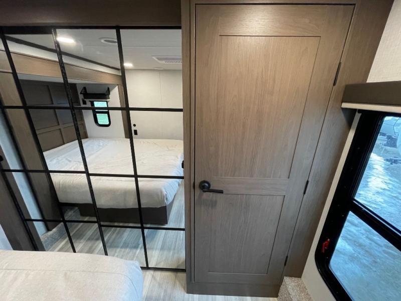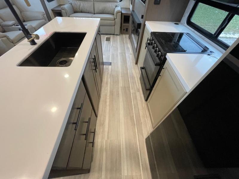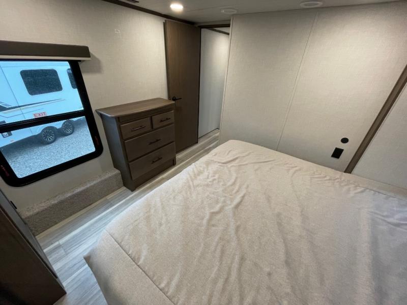 The dual opposing slides in the combined kitchen and living area will give you an open floorplan! You'll sleep on the queen-size bed in the front private bedroom, and there is under-bed storage, a full-height wardrobe, and a dresser with hidden storage for all of your personal belongings. As you spend time in the main living area, you'll appreciate having extra space thanks to the set of opposing slides, and the kitchen island will be easy to work around. You'll be able to relax on the tri-fold sleeper sofa and theater seating while you watch the LED HDTV with an pivoting entertainment door and hidden pantry. There is also a booth dinette with storage drawers, convenient shoe storage right as you enter the unit, and an exterior unobstructed pass-thru storage so nothing gets left behind.
