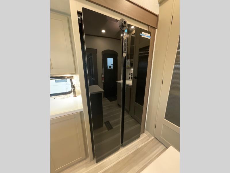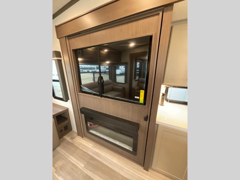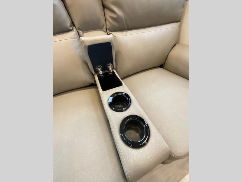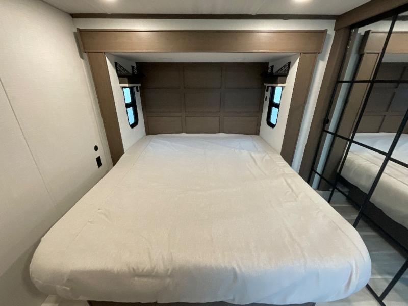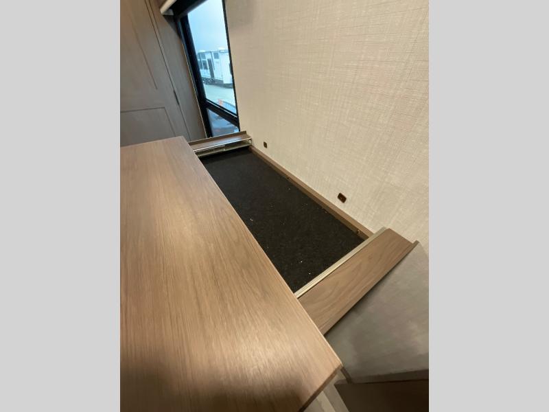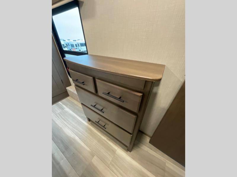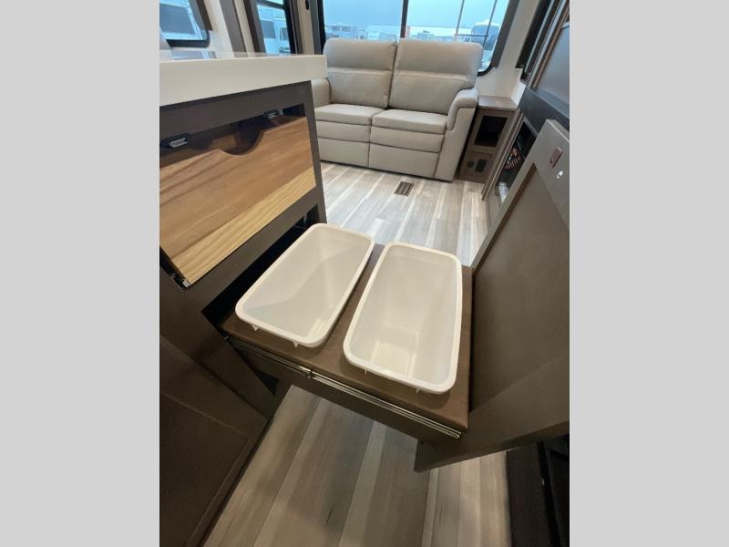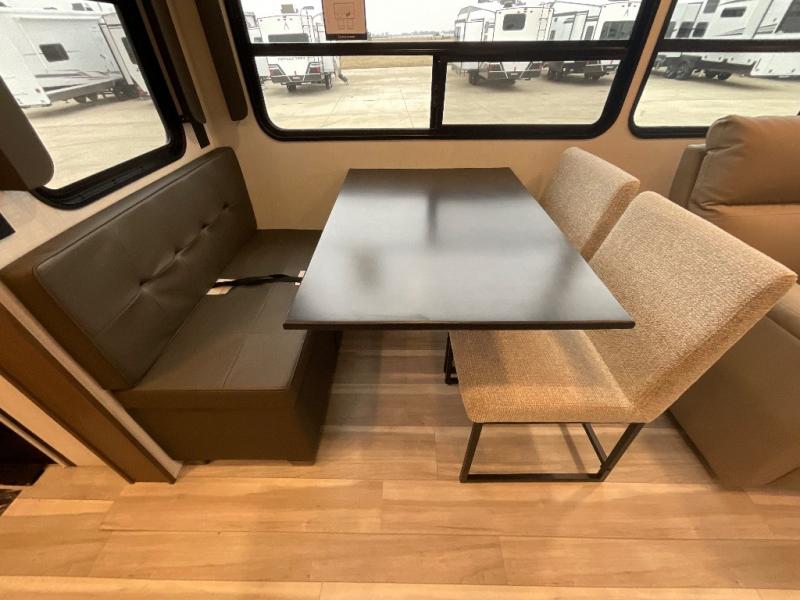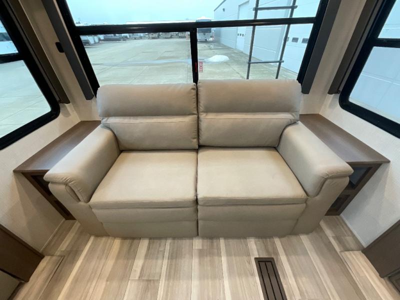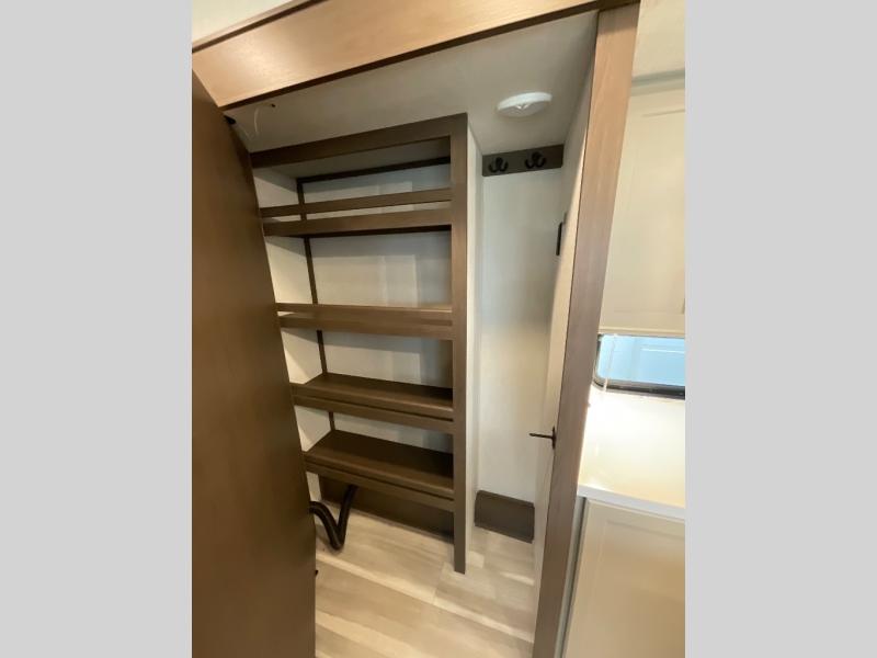 The dual opposing slides in the combined kitchen and living area will give you an open floorplan! You'll sleep on the queen-size bed in the front private bedroom, and there is under-bed storage, a full-height wardrobe, and a dresser with hidden storage for all of your personal belongings. As you spend time in the main living area, you'll appreciate having extra space thanks to the set of opposing slides, and the kitchen island will be easy to work around. You'll be able to relax on the tri-fold sleeper sofa and theater seating while you watch the LED HDTV with an pivoting entertainment door and hidden pantry. There is also a booth dinette with storage drawers, convenient shoe storage right as you enter the unit, and an exterior unobstructed pass-thru storage so nothing gets left behind.