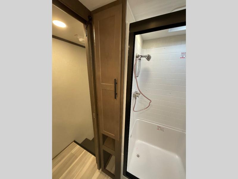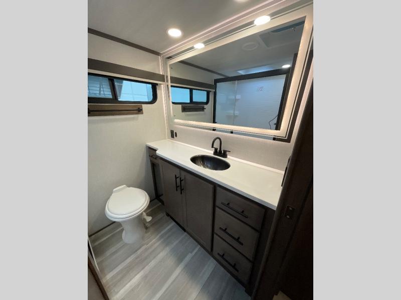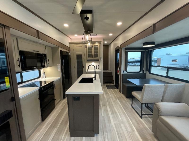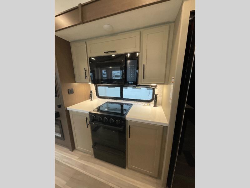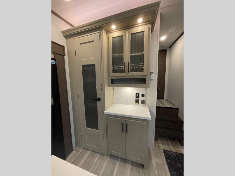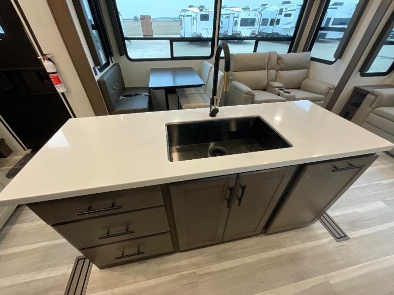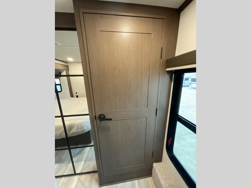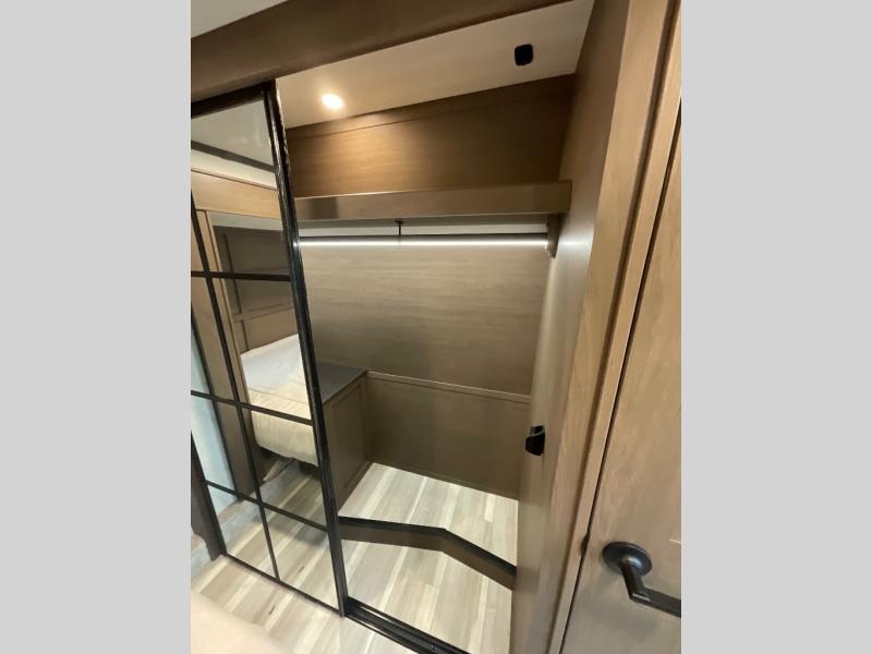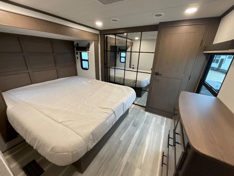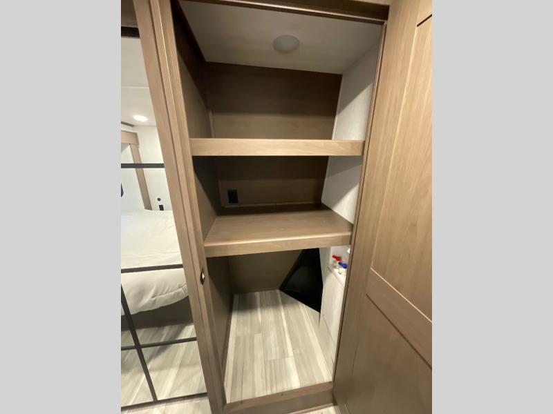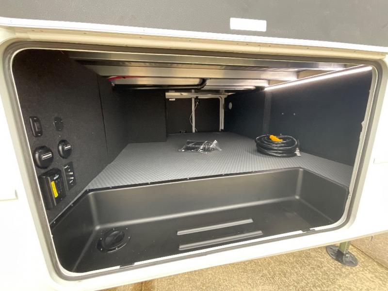 The dual opposing slides in the combined kitchen and living area will give you an open floorplan! You'll sleep on the queen-size bed in the front private bedroom, and there is under-bed storage, a full-height wardrobe, and a dresser with hidden storage for all of your personal belongings. As you spend time in the main living area, you'll appreciate having extra space thanks to the set of opposing slides, and the kitchen island will be easy to work around. You'll be able to relax on the tri-fold sleeper sofa and theater seating while you watch the LED HDTV with an pivoting entertainment door and hidden pantry. There is also a booth dinette with storage drawers, convenient shoe storage right as you enter the unit, and an exterior unobstructed pass-thru storage so nothing gets left behind.