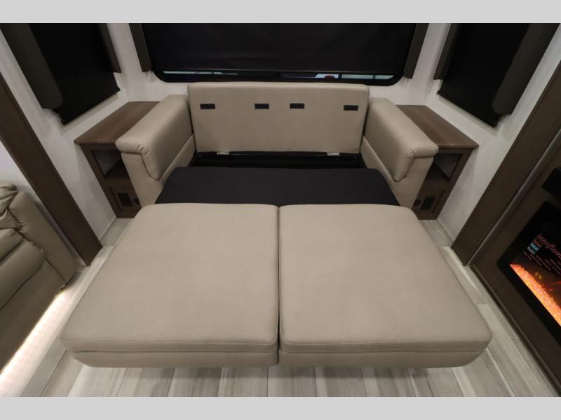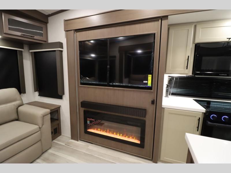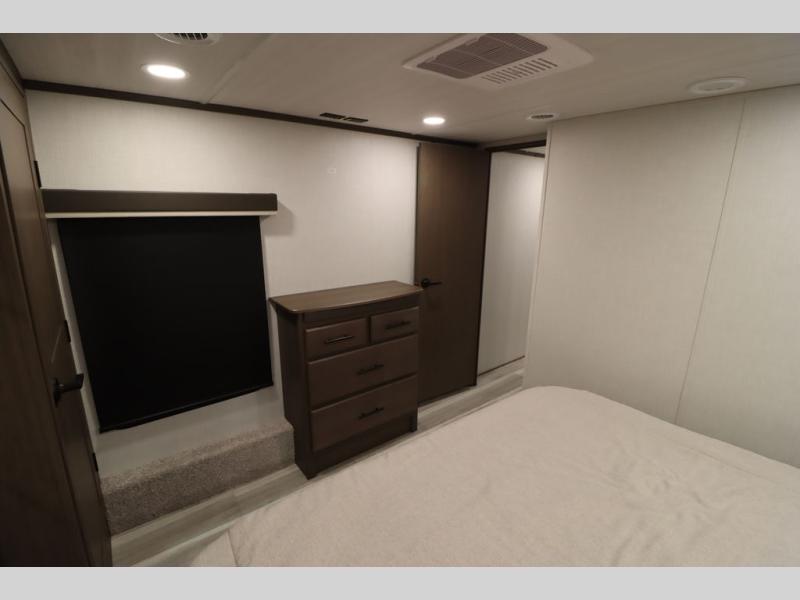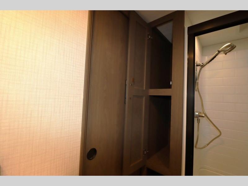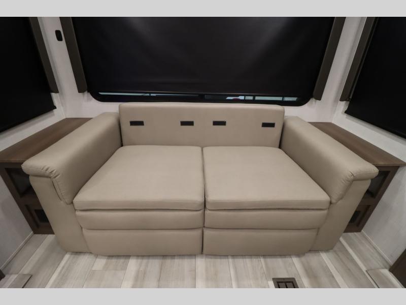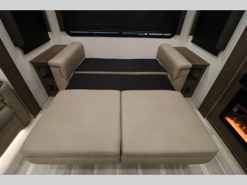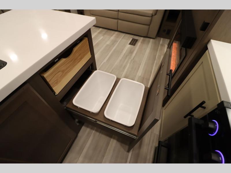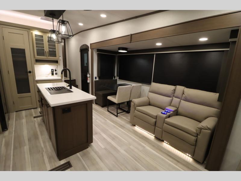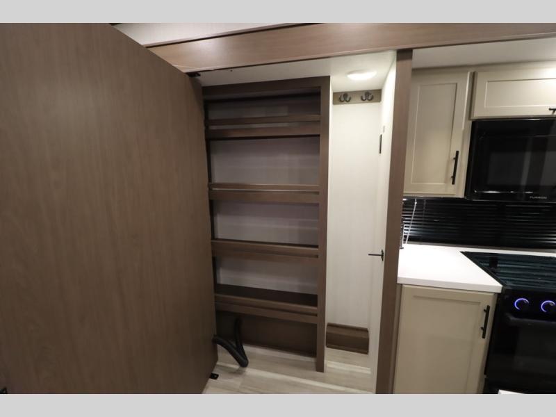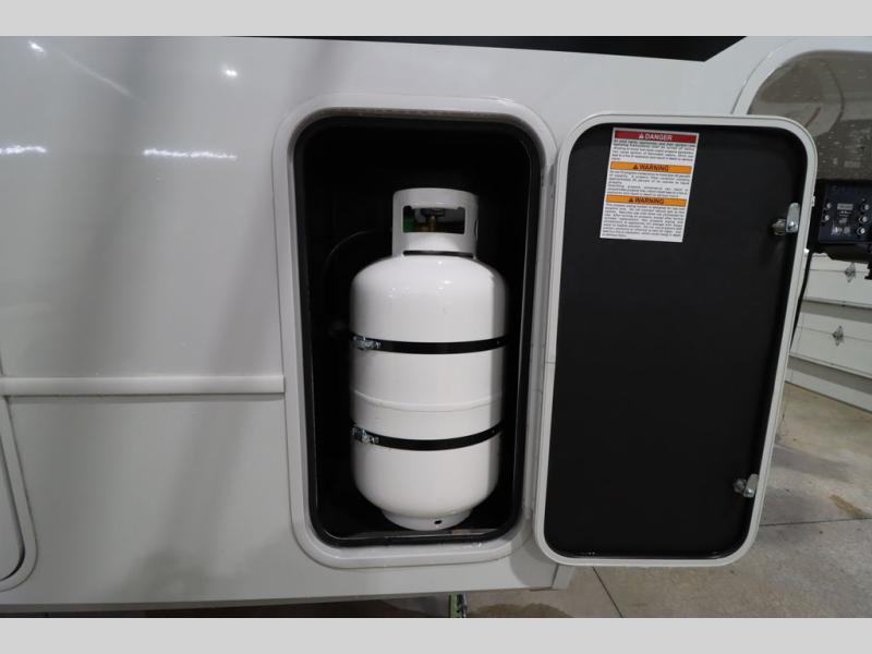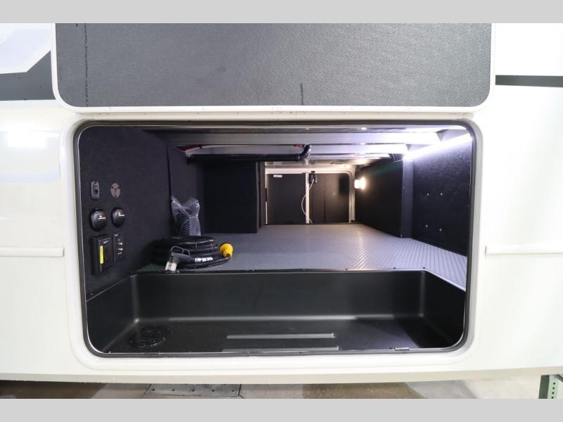 The dual opposing slides in the combined kitchen and living area will give you an open floorplan! You'll sleep on the queen-size bed in the front private bedroom, and there is under-bed storage, a full-height wardrobe, and a dresser with hidden storage for all of your personal belongings. As you spend time in the main living area, you'll appreciate having extra space thanks to the set of opposing slides, and the kitchen island will be easy to work around. You'll be able to relax on the tri-fold sleeper sofa and theater seating while you watch the LED HDTV with an pivoting entertainment door and hidden pantry. There is also a booth dinette with storage drawers, convenient shoe storage right as you enter the unit, and an exterior unobstructed pass-thru storage so nothing gets left behind.
