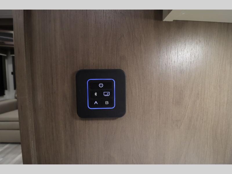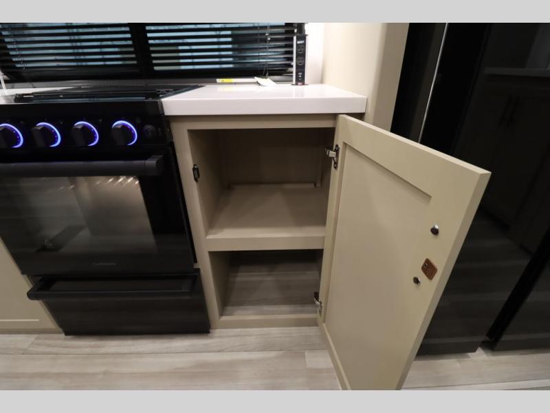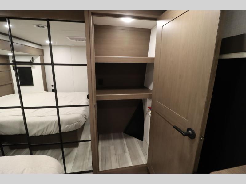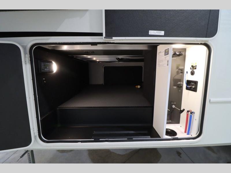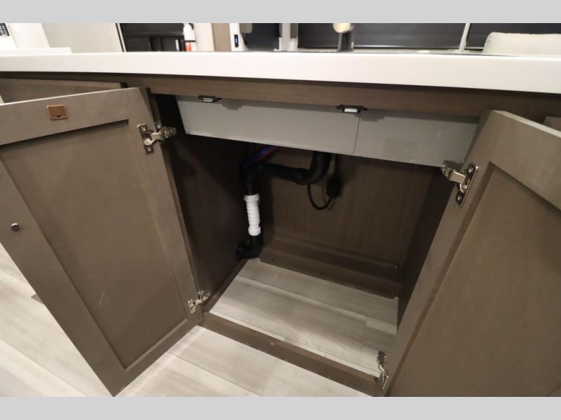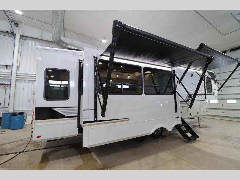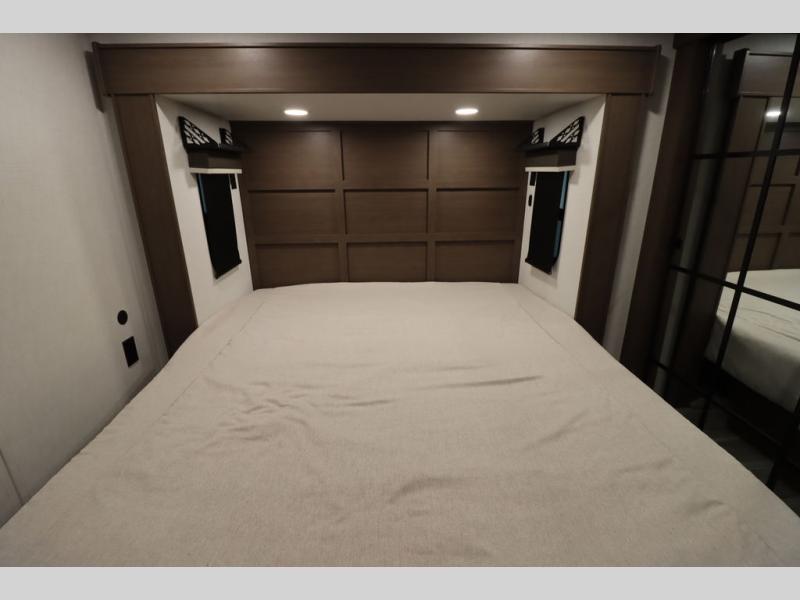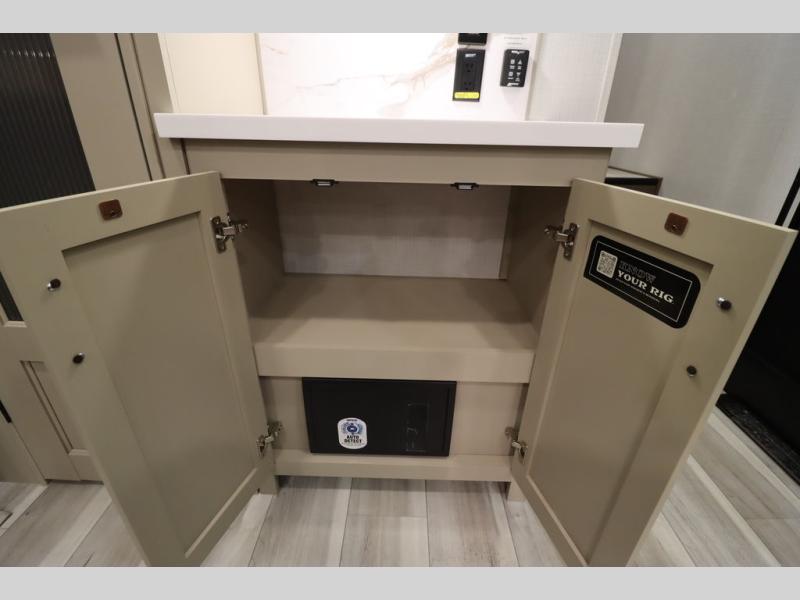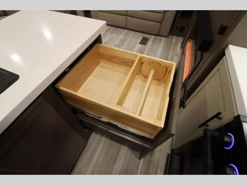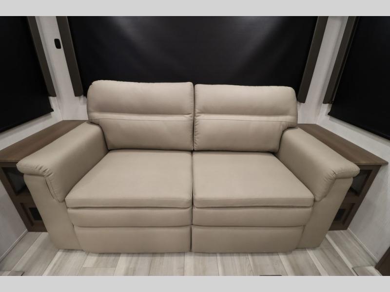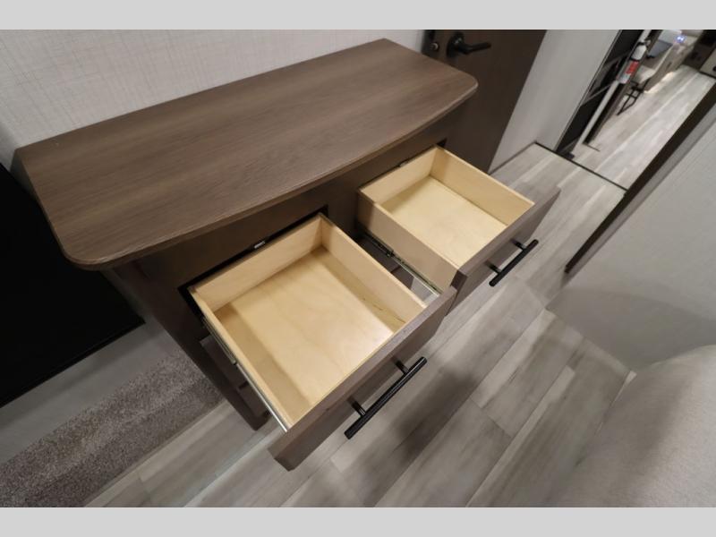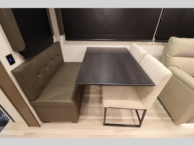 The dual opposing slides in the combined kitchen and living area will give you an open floorplan! You'll sleep on the queen-size bed in the front private bedroom, and there is under-bed storage, a full-height wardrobe, and a dresser with hidden storage for all of your personal belongings. As you spend time in the main living area, you'll appreciate having extra space thanks to the set of opposing slides, and the kitchen island will be easy to work around. You'll be able to relax on the tri-fold sleeper sofa and theater seating while you watch the LED HDTV with an pivoting entertainment door and hidden pantry. There is also a booth dinette with storage drawers, convenient shoe storage right as you enter the unit, and an exterior unobstructed pass-thru storage so nothing gets left behind.