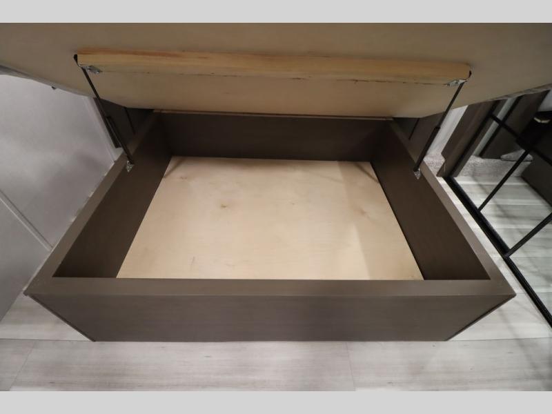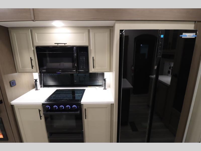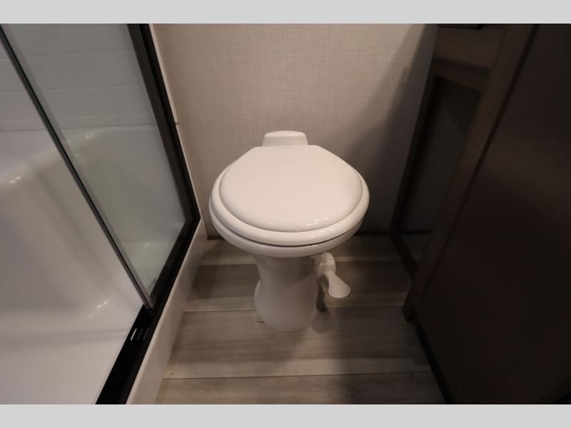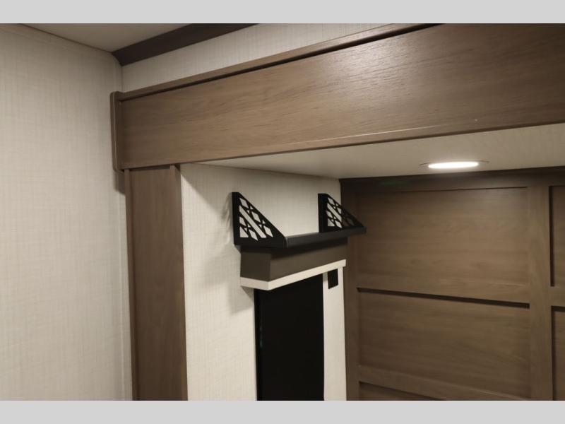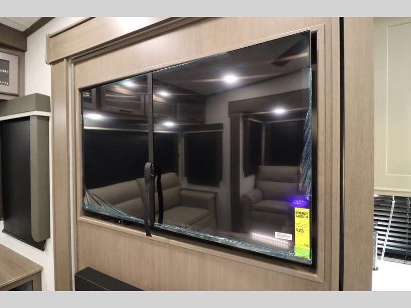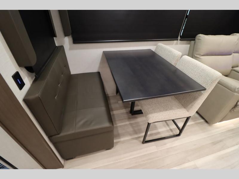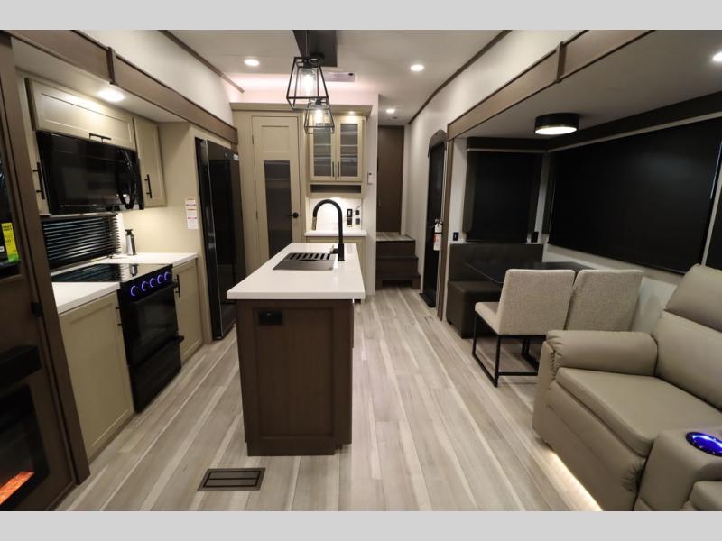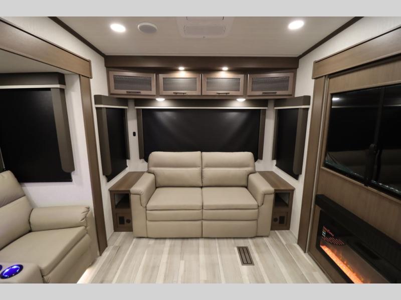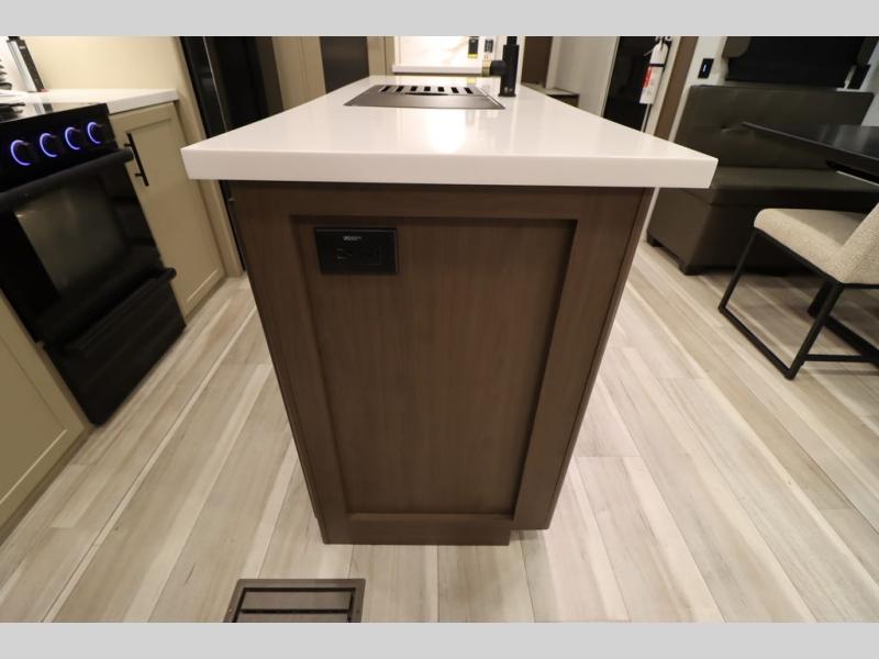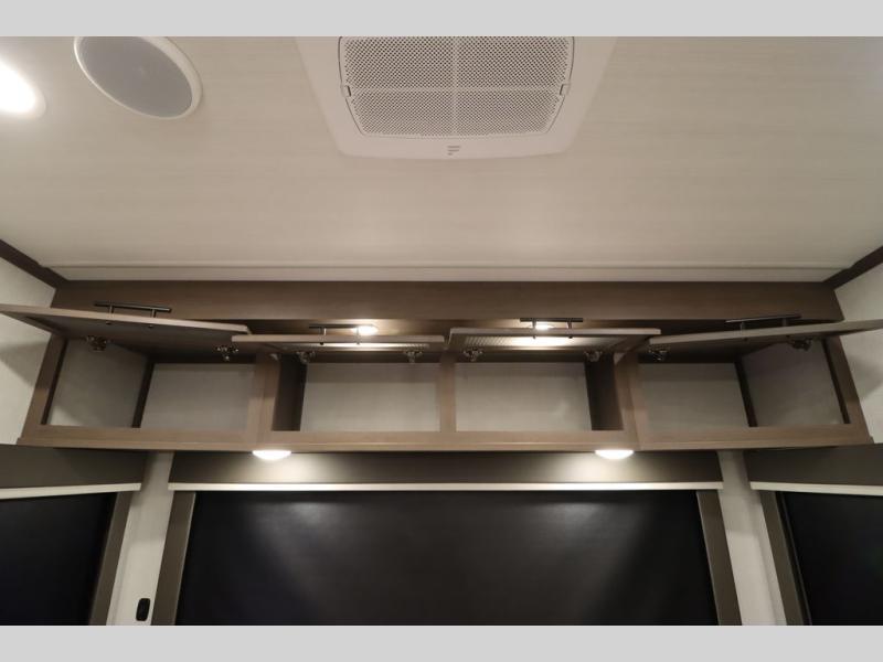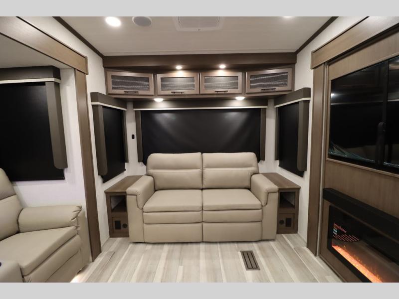 The dual opposing slides in the combined kitchen and living area will give you an open floorplan! You'll sleep on the queen-size bed in the front private bedroom, and there is under-bed storage, a full-height wardrobe, and a dresser with hidden storage for all of your personal belongings. As you spend time in the main living area, you'll appreciate having extra space thanks to the set of opposing slides, and the kitchen island will be easy to work around. You'll be able to relax on the tri-fold sleeper sofa and theater seating while you watch the LED HDTV with an pivoting entertainment door and hidden pantry. There is also a booth dinette with storage drawers, convenient shoe storage right as you enter the unit, and an exterior unobstructed pass-thru storage so nothing gets left behind.