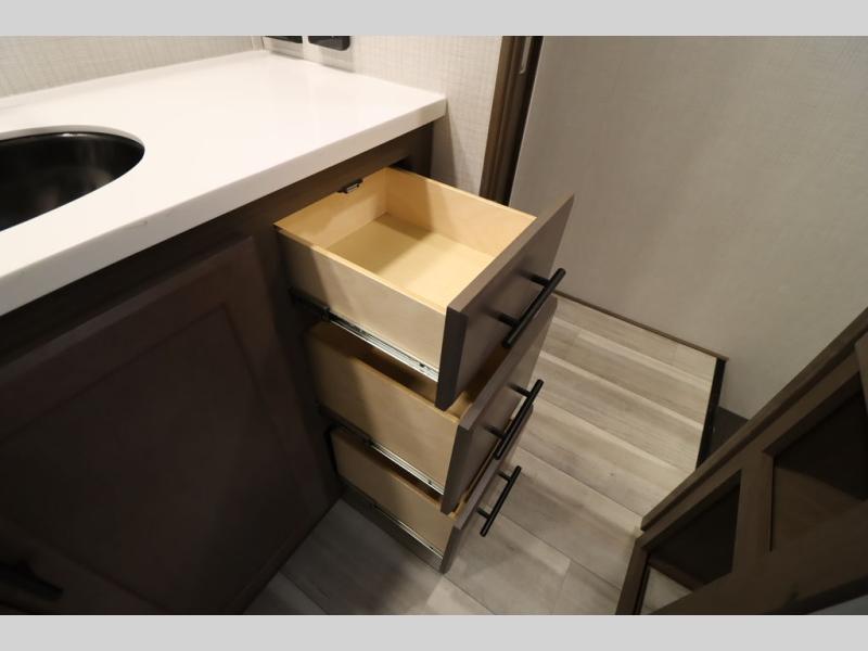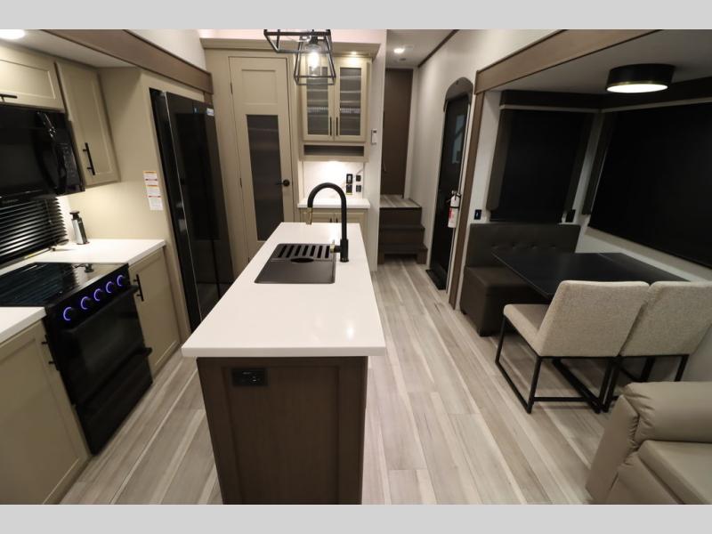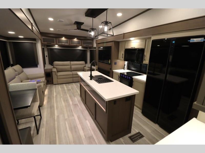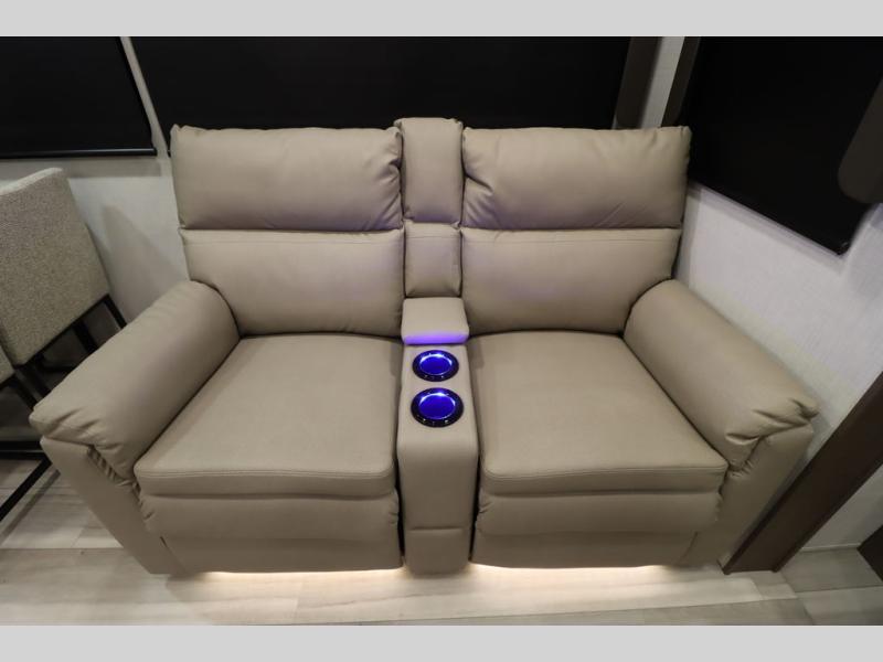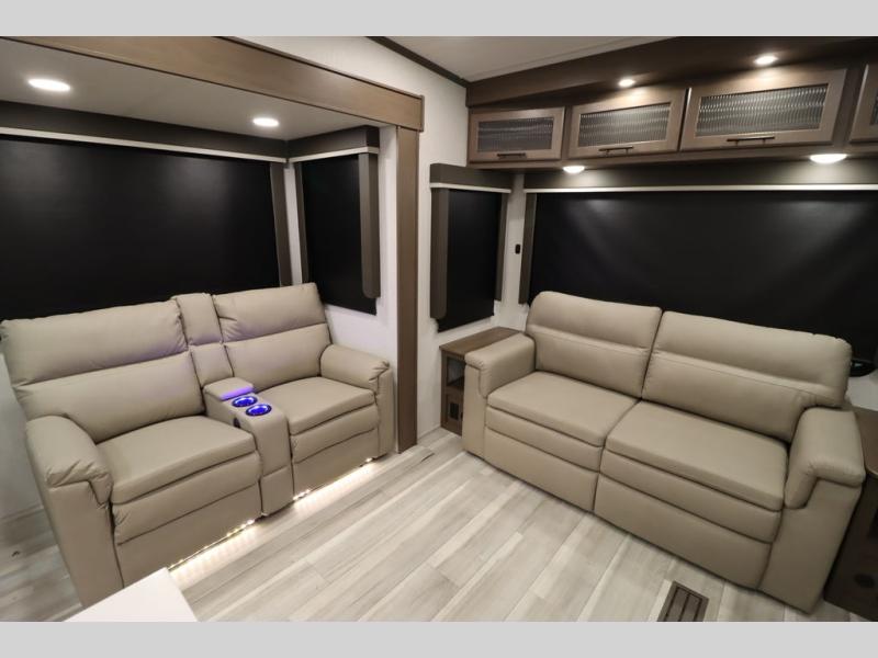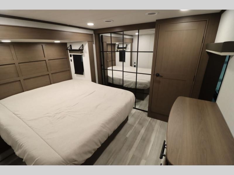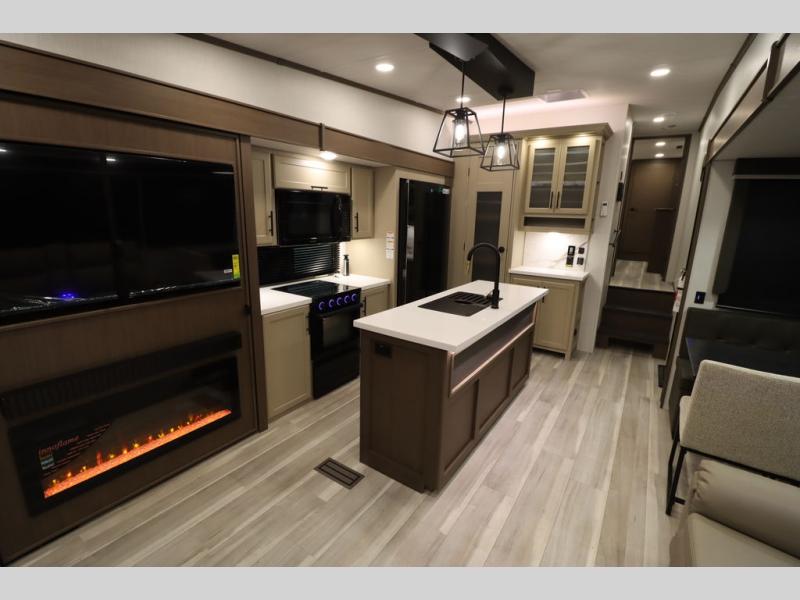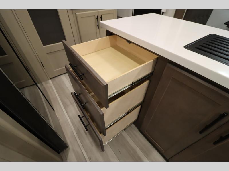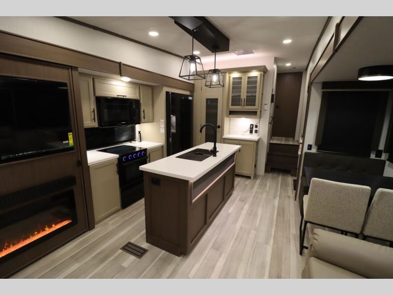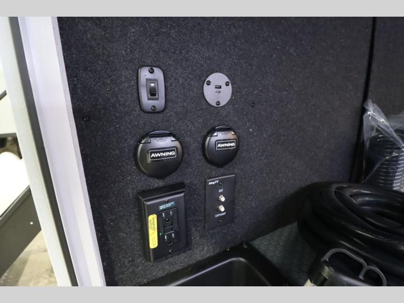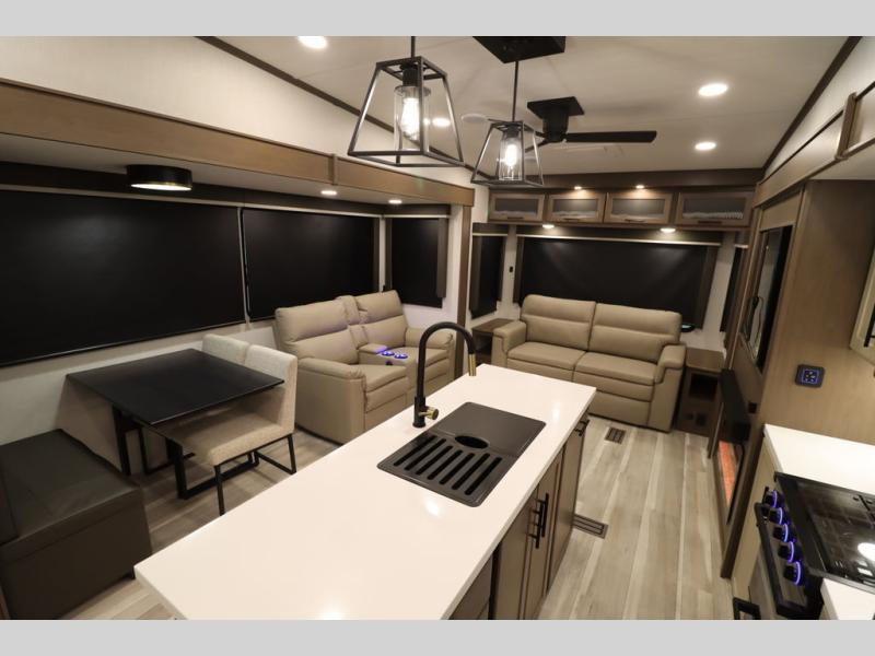 The dual opposing slides in the combined kitchen and living area will give you an open floorplan! You'll sleep on the queen-size bed in the front private bedroom, and there is under-bed storage, a full-height wardrobe, and a dresser with hidden storage for all of your personal belongings. As you spend time in the main living area, you'll appreciate having extra space thanks to the set of opposing slides, and the kitchen island will be easy to work around. You'll be able to relax on the tri-fold sleeper sofa and theater seating while you watch the LED HDTV with an pivoting entertainment door and hidden pantry. There is also a booth dinette with storage drawers, convenient shoe storage right as you enter the unit, and an exterior unobstructed pass-thru storage so nothing gets left behind.