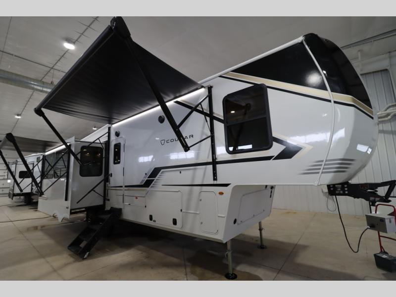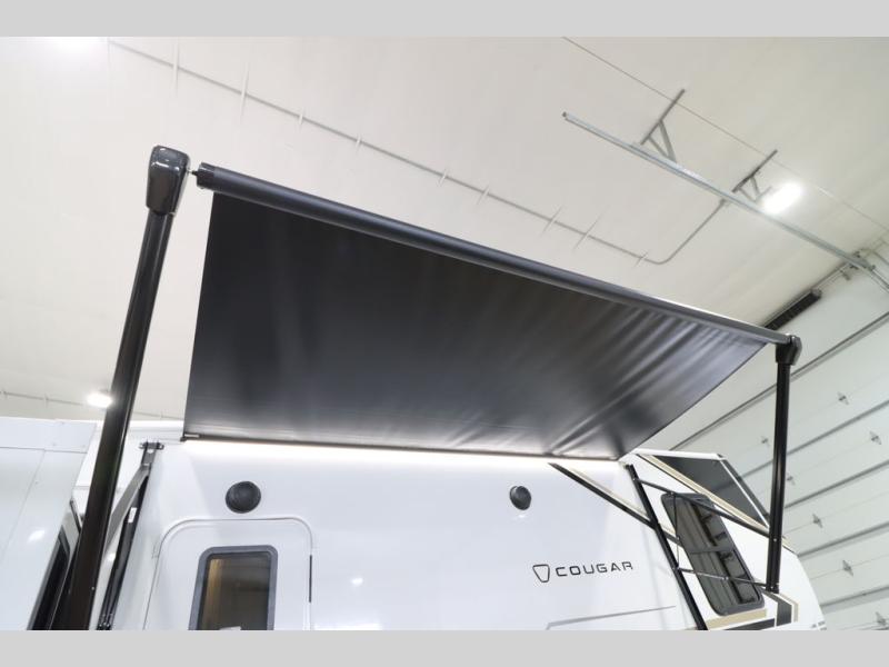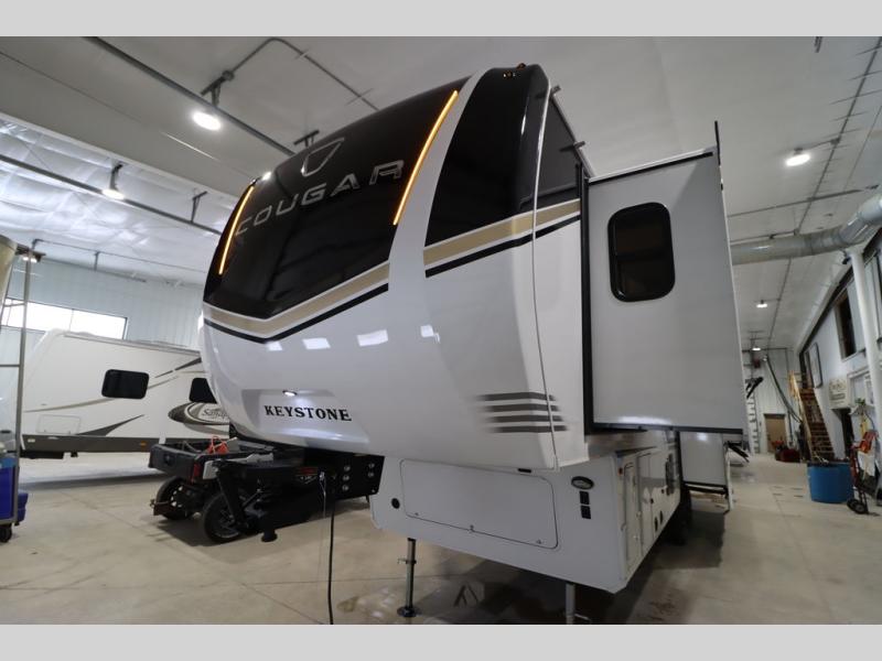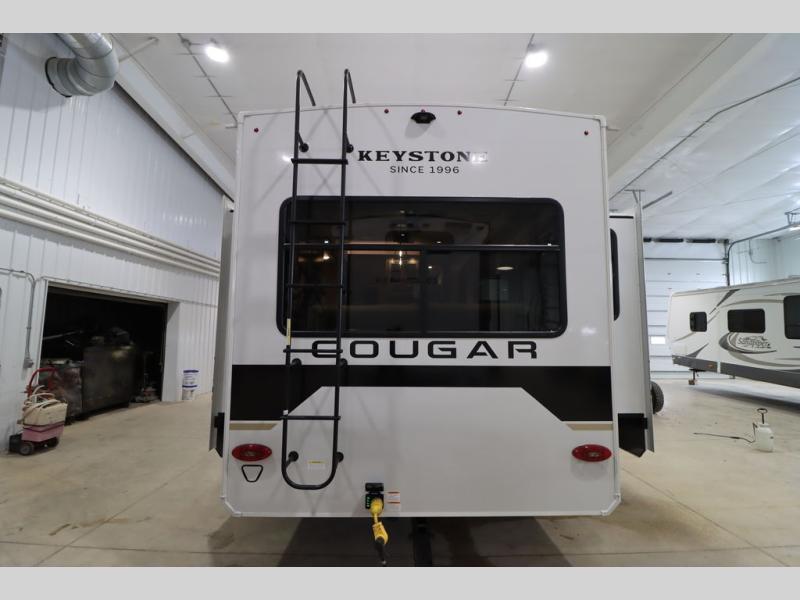 Spend more time having fun and less time worrying about your RV with the Keystone Cougar fifth wheel! These units have all that you will need for excellent vacations. The interior comes hardwood cabinet doors, solid surface kitchen countertops, an Oxygenics shower head and hose, plus a Vent-All window system. You will also appreciate the 12V charging stations throughout, the dual zone Bluetooth audio system, and the on-demand water heater for added comfort. The exterior is also fully outfitted with a convenience center, MaxTurn technology, Lippert axles with anti-lock braking system, and a Curt Road Armor shock absorbing equalizer for smooth towing. Each model is available with the optional Hero Edition. By choosing this edition, you can help support our nation's heros and their families by contributing to the Wounded Warrior Project. This optional package features an industry exclusive full-body paint matte finish, frameless windows, a glass entry door, blackout rims, and green LED exterior accent lighting; see dealer for more details!