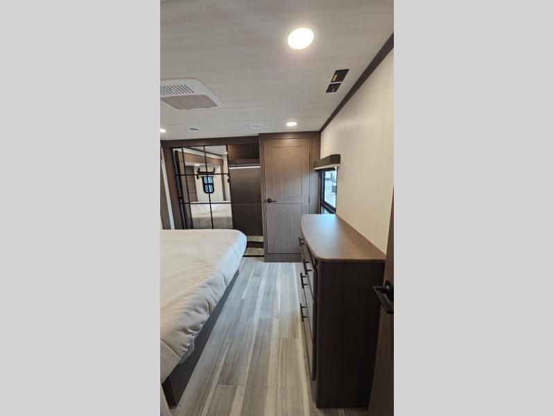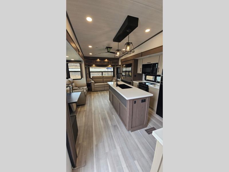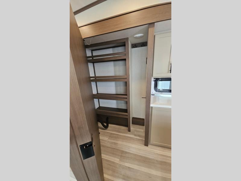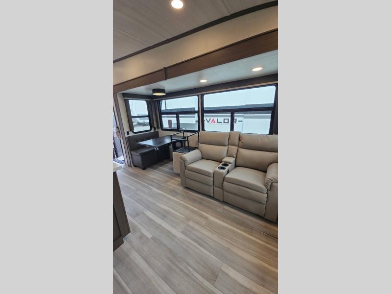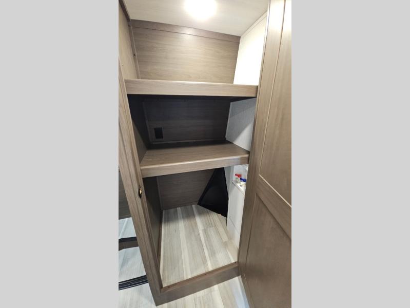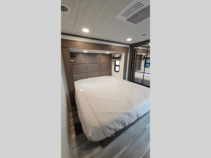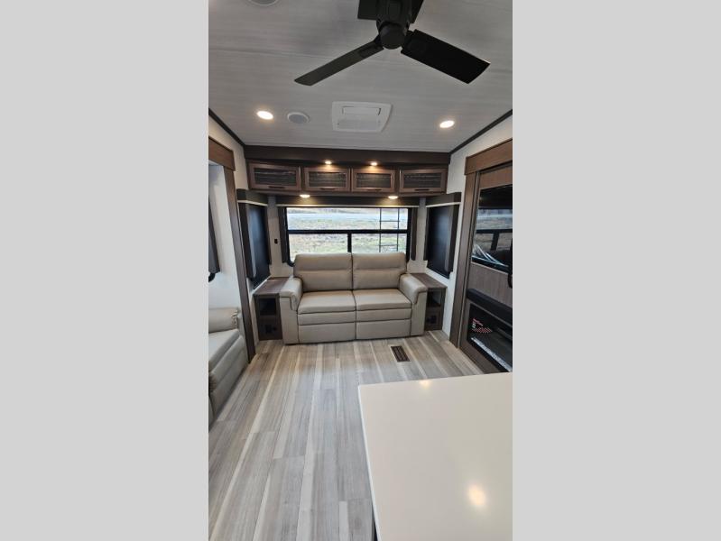 The dual opposing slides in the combined kitchen and living area will give you an open floorplan! You'll sleep on the queen-size bed in the front private bedroom, and there is under-bed storage, a full-height wardrobe, and a dresser with hidden storage for all of your personal belongings. As you spend time in the main living area, you'll appreciate having extra space thanks to the set of opposing slides, and the kitchen island will be easy to work around. You'll be able to relax on the tri-fold sleeper sofa and theater seating while you watch the LED HDTV with an pivoting entertainment door and hidden pantry. There is also a booth dinette with storage drawers, convenient shoe storage right as you enter the unit, and an exterior unobstructed pass-thru storage so nothing gets left behind.