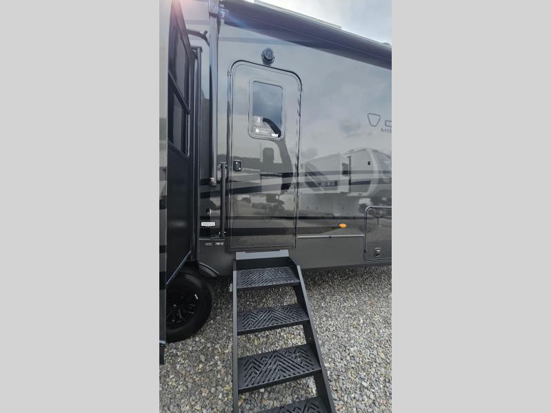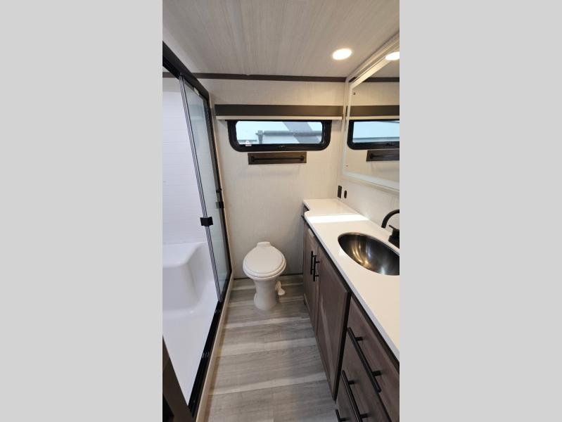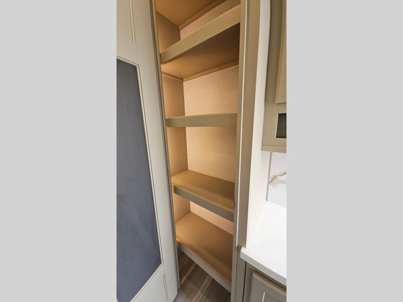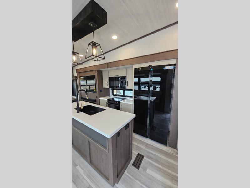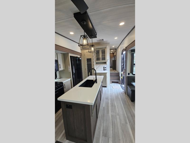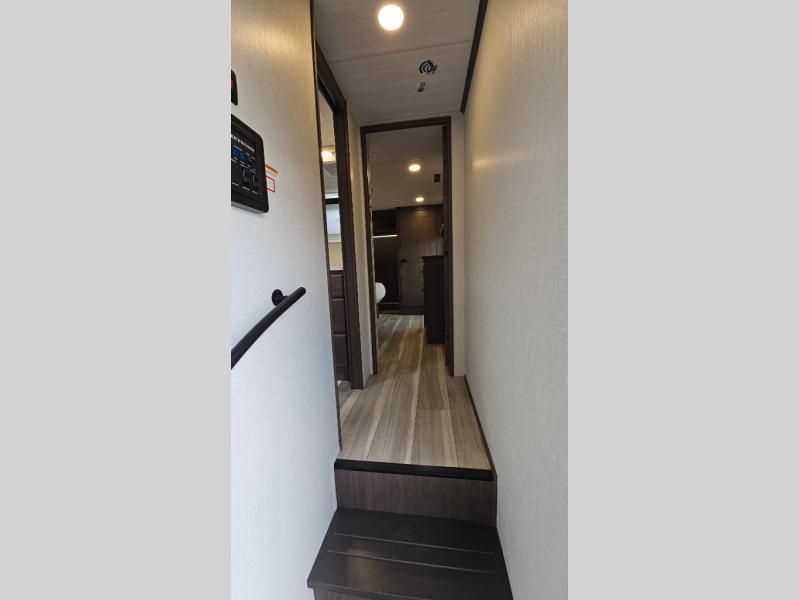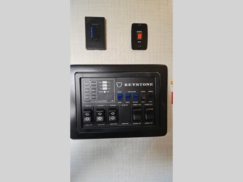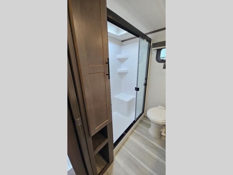 The dual opposing slides in the combined kitchen and living area will give you an open floorplan! You'll sleep on the queen-size bed in the front private bedroom, and there is under-bed storage, a full-height wardrobe, and a dresser with hidden storage for all of your personal belongings. As you spend time in the main living area, you'll appreciate having extra space thanks to the set of opposing slides, and the kitchen island will be easy to work around. You'll be able to relax on the tri-fold sleeper sofa and theater seating while you watch the LED HDTV with an pivoting entertainment door and hidden pantry. There is also a booth dinette with storage drawers, convenient shoe storage right as you enter the unit, and an exterior unobstructed pass-thru storage so nothing gets left behind.