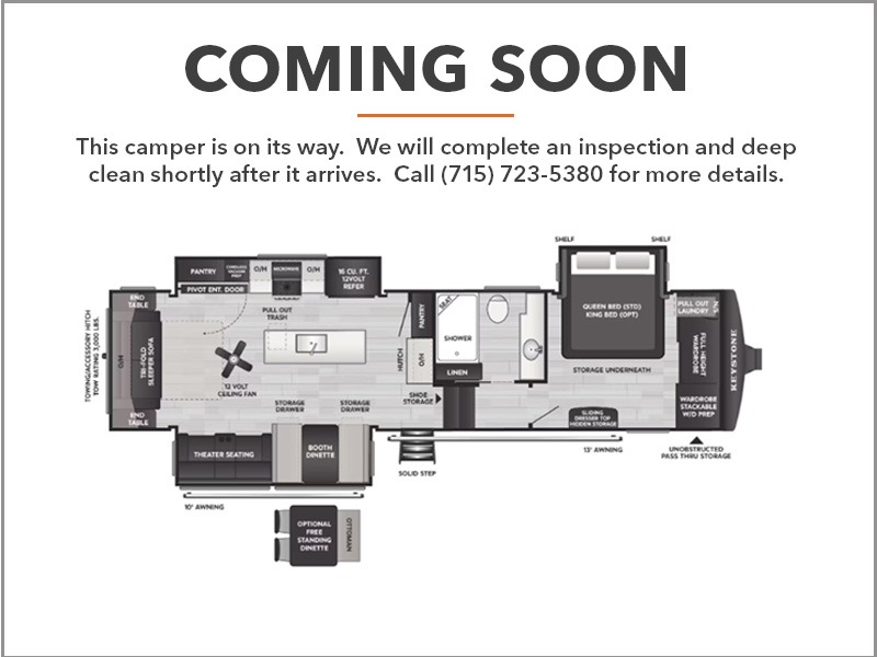 The dual opposing slides in the combined kitchen and living area will give you an open floorplan! You'll sleep on the queen-size bed in the front private bedroom, and there is under-bed storage, a full-height wardrobe, and a dresser with hidden storage for all of your personal belongings. As you spend time in the main living area, you'll appreciate having extra space thanks to the set of opposing slides, and the kitchen island will be easy to work around. You'll be able to relax on the tri-fold sleeper sofa and theater seating while you watch the LED HDTV with an pivoting entertainment door and hidden pantry. There is also a booth dinette with storage drawers, convenient shoe storage right as you enter the unit, and an exterior unobstructed pass-thru storage so nothing gets left behind.