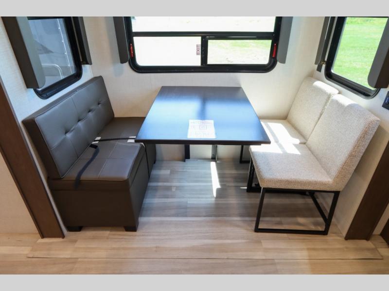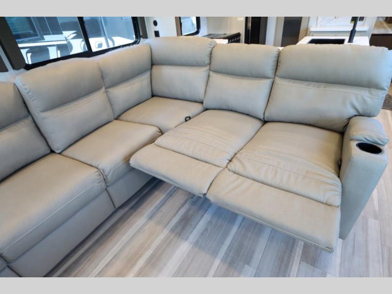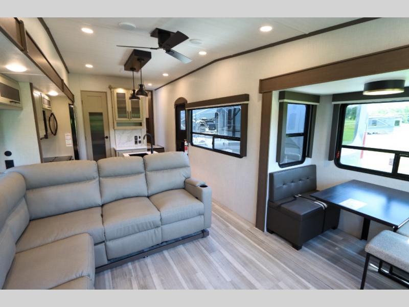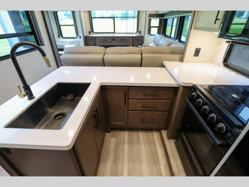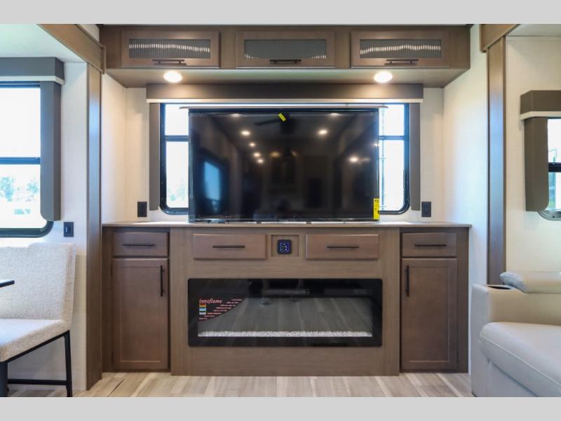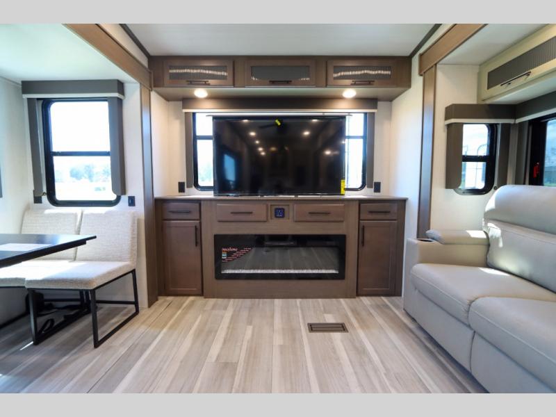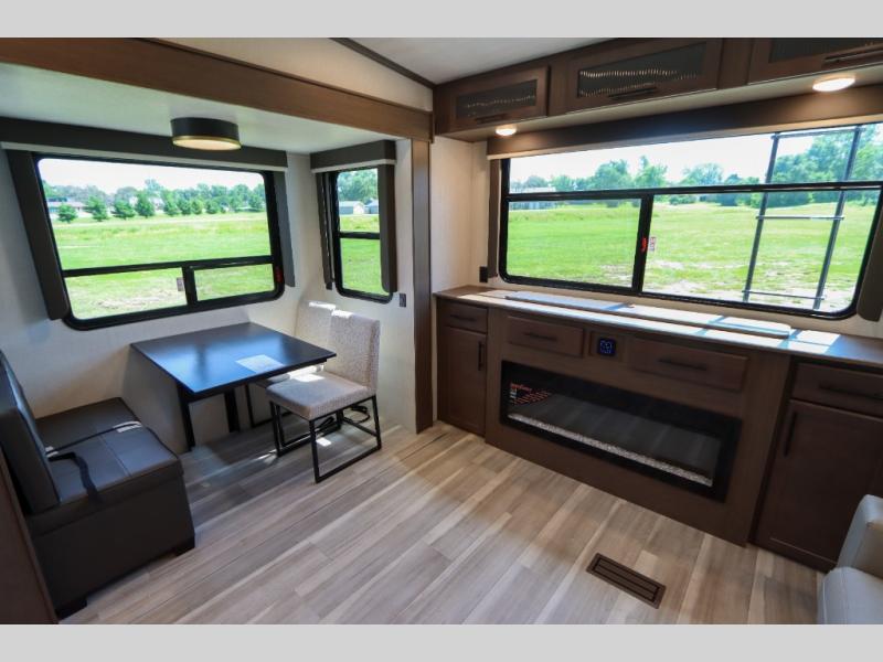 Time at the campground will be spent in comfort thanks to this fifth wheel that can sleep four to six people comfortably. The rear living area/den includes a huge L-shaped sofa with theater seats and a king tri-fold sofa, plus a free-standing dinette with an ottoman on one side, a fireplace, and an LED HDTV for movie nights. The chef of your group will love the additional counter space in the kitchen, along with a 21" Furrion range, plus a pantry and 16 cu. ft. 12V refrigerator. The full bath allows you to clean up each day and the front private bedroom will provide you with your own space at night. Here, you'll find a queen bed slide out that can optioned out for a king bed, plus a full height wardrobe, a second wardrobe with washer and dryer prep, and a dresser with a sliding top and hidden storage for valuables!