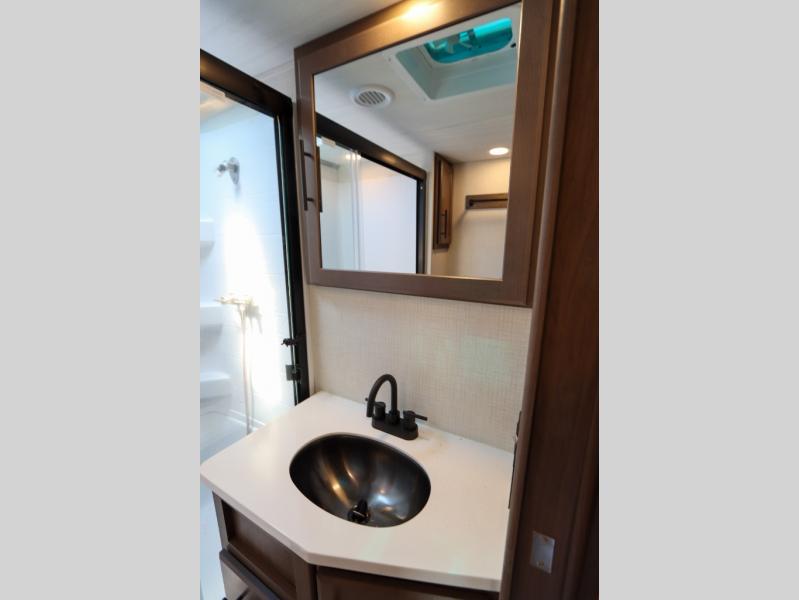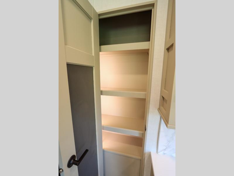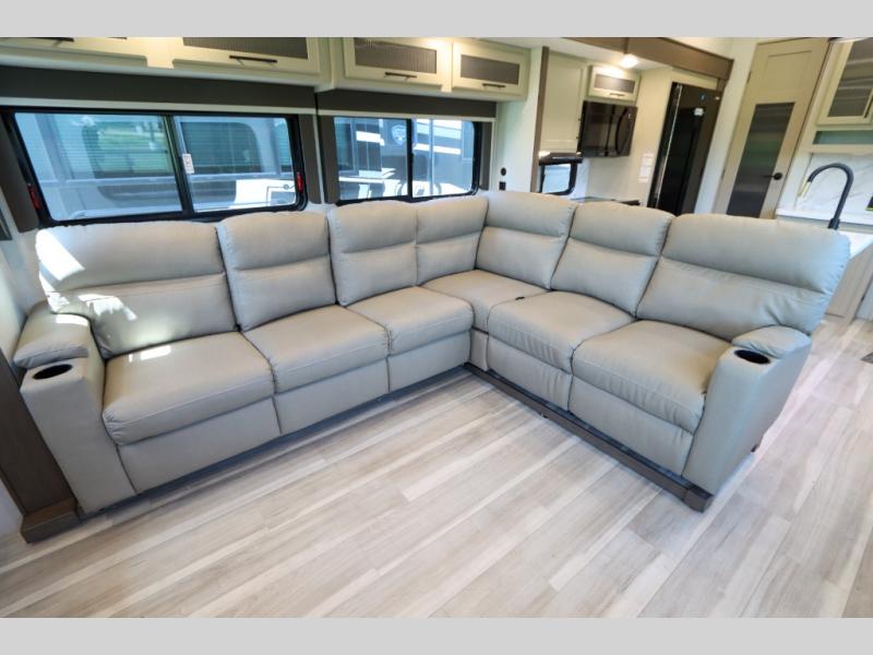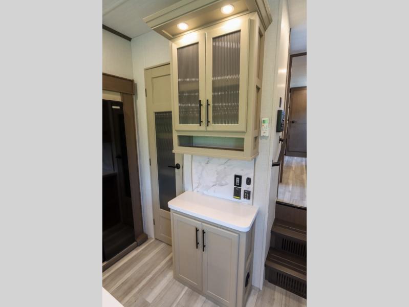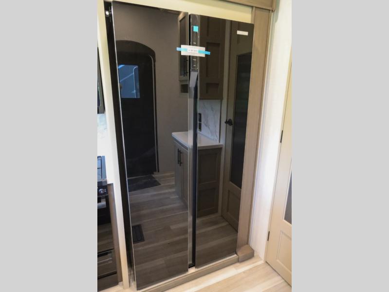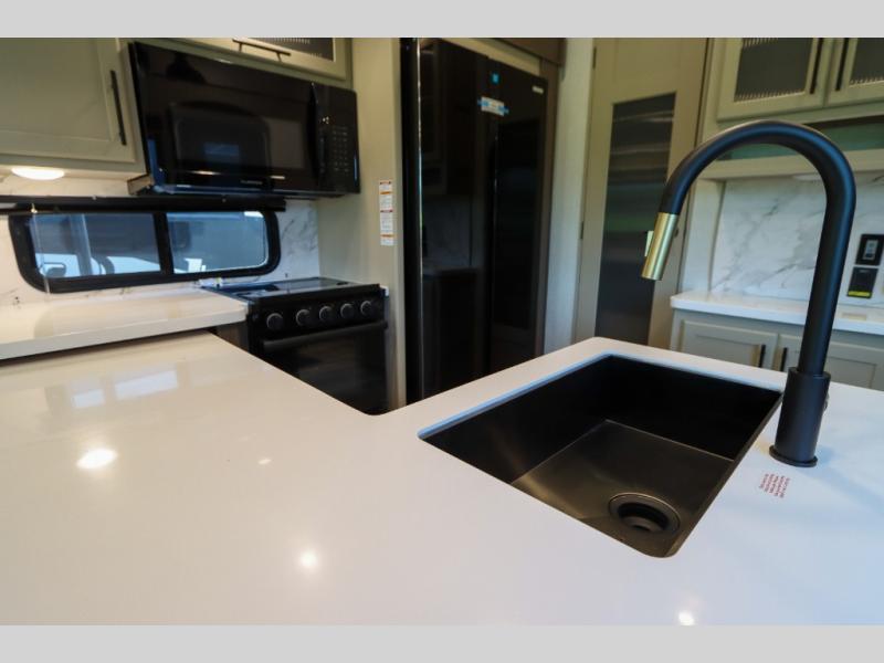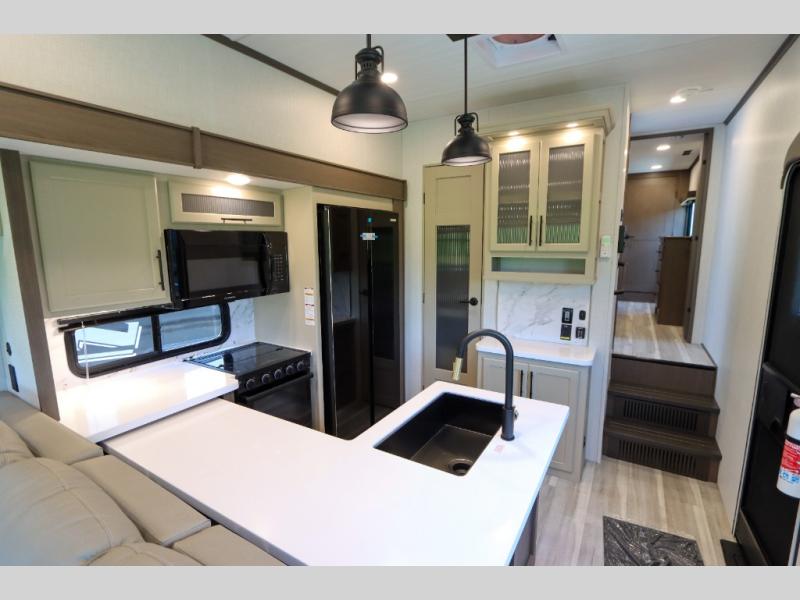 Time at the campground will be spent in comfort thanks to this fifth wheel that can sleep four to six people comfortably. The rear living area/den includes a huge L-shaped sofa with theater seats and a king tri-fold sofa, plus a free-standing dinette with an ottoman on one side, a fireplace, and an LED HDTV for movie nights. The chef of your group will love the additional counter space in the kitchen, along with a 21" Furrion range, plus a pantry and 16 cu. ft. 12V refrigerator. The full bath allows you to clean up each day and the front private bedroom will provide you with your own space at night. Here, you'll find a queen bed slide out that can optioned out for a king bed, plus a full height wardrobe, a second wardrobe with washer and dryer prep, and a dresser with a sliding top and hidden storage for valuables!