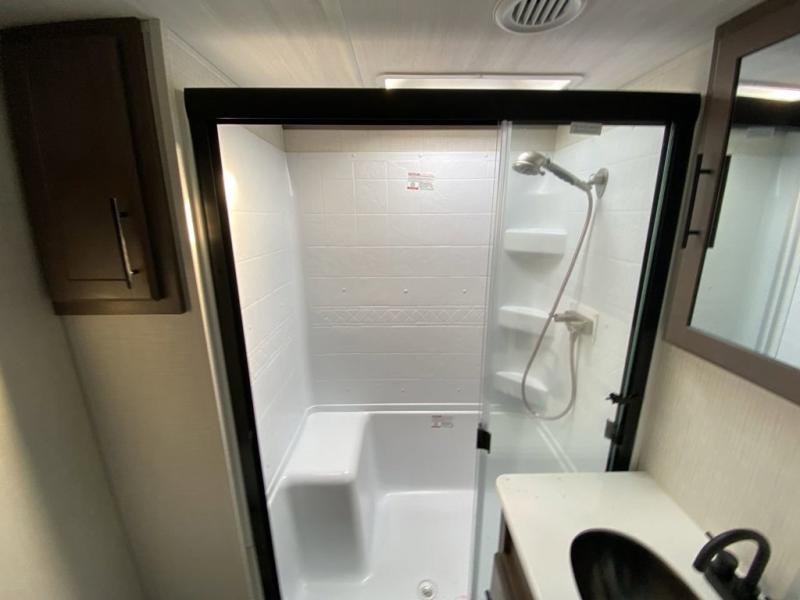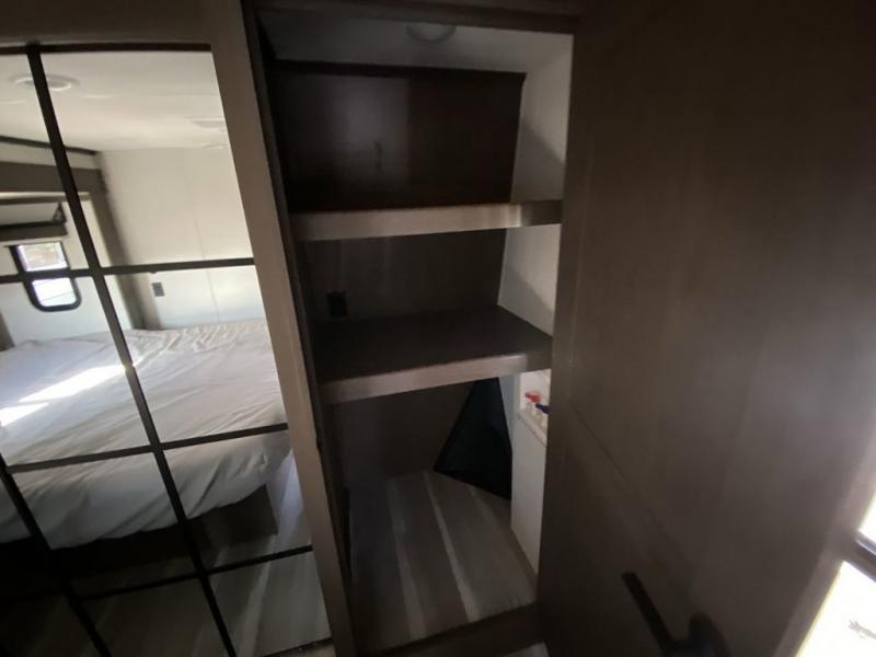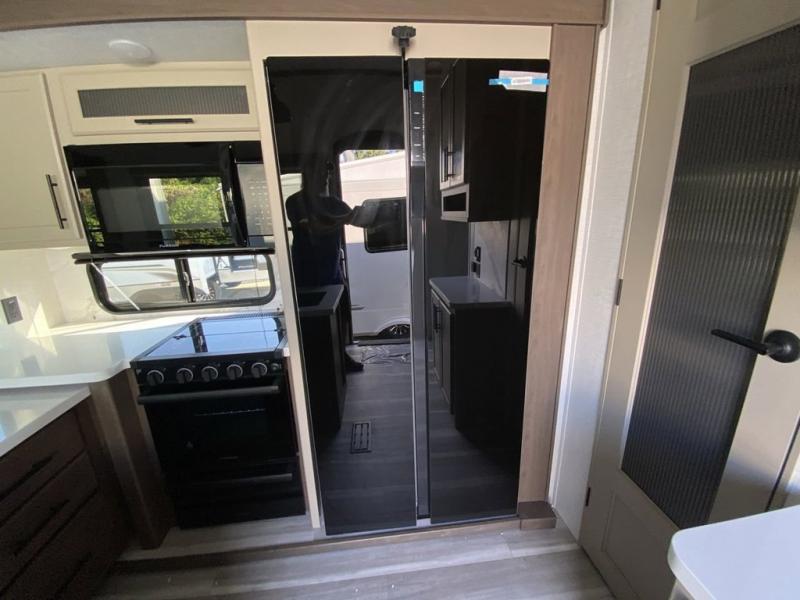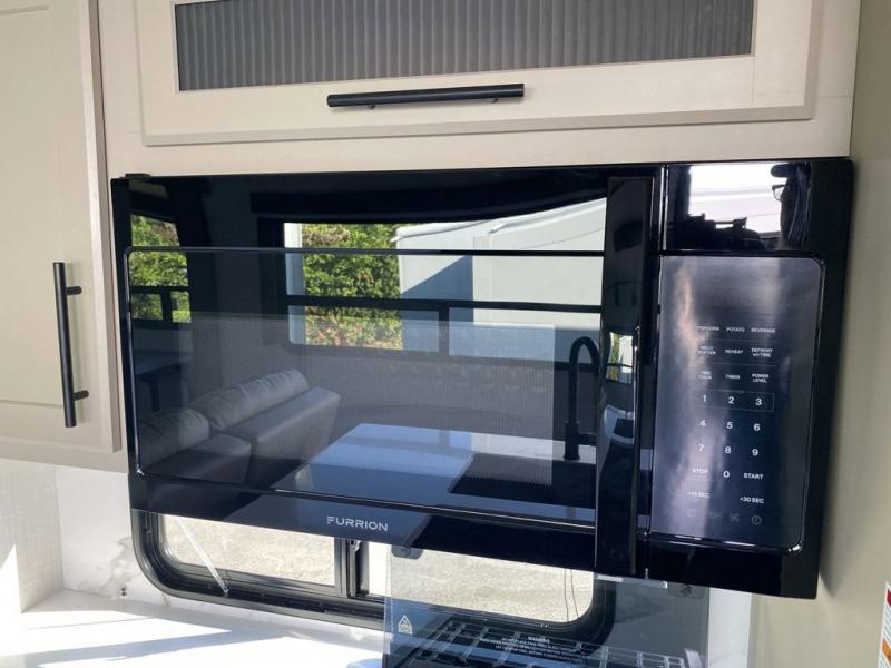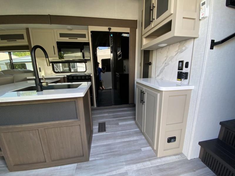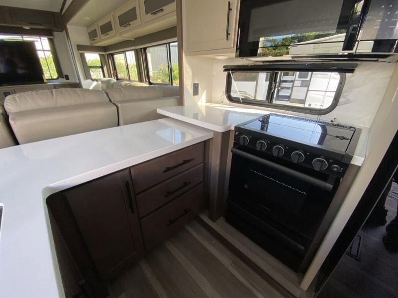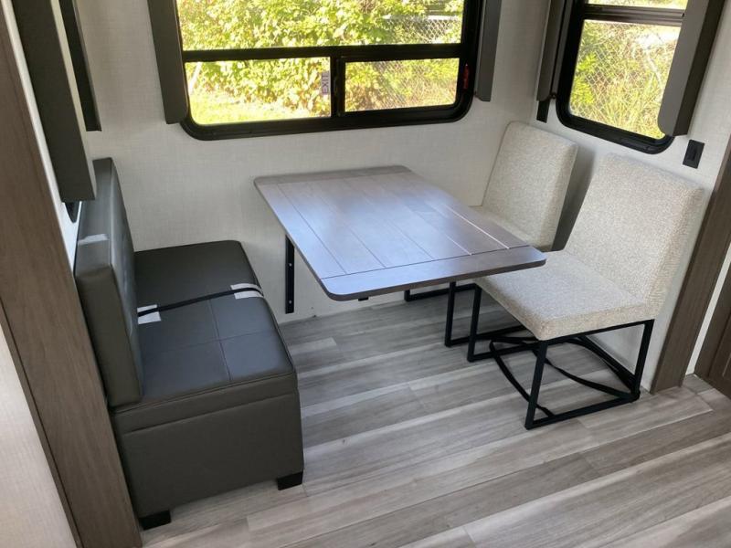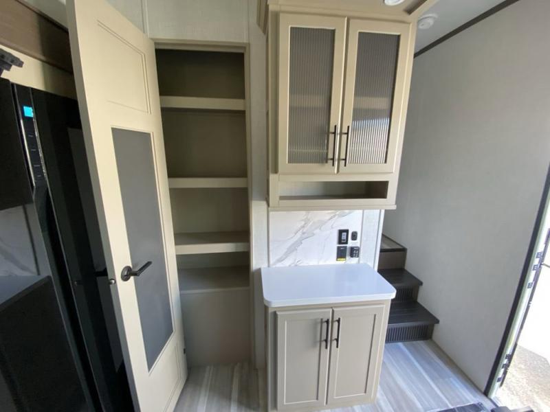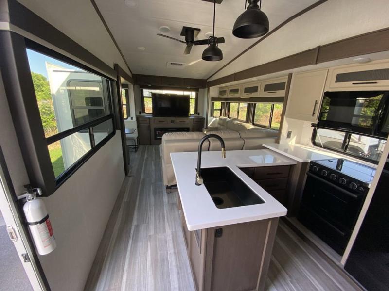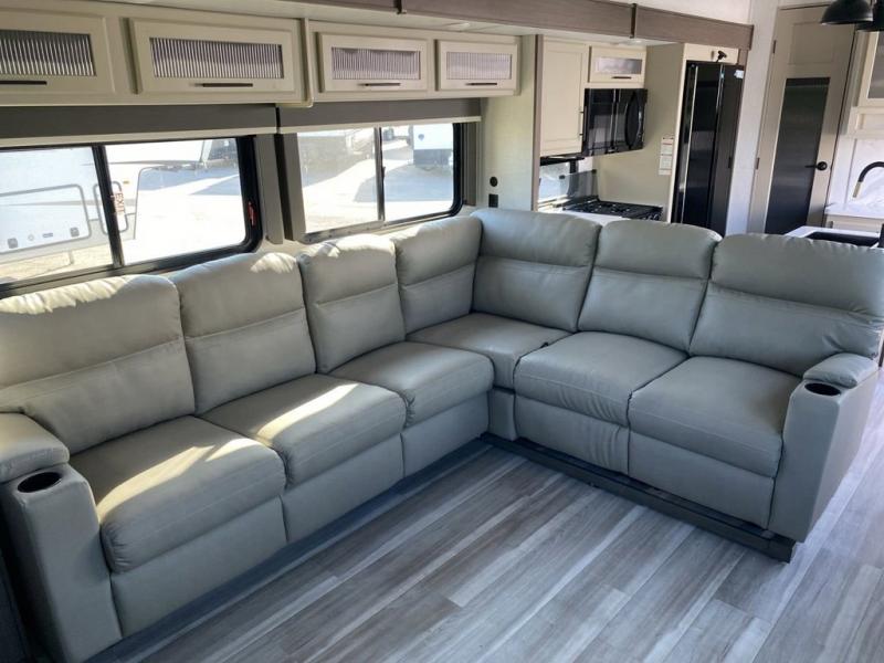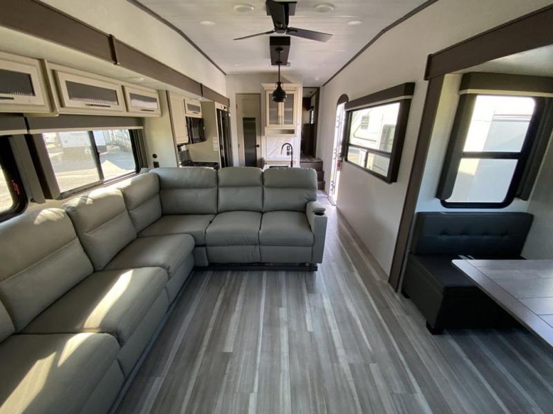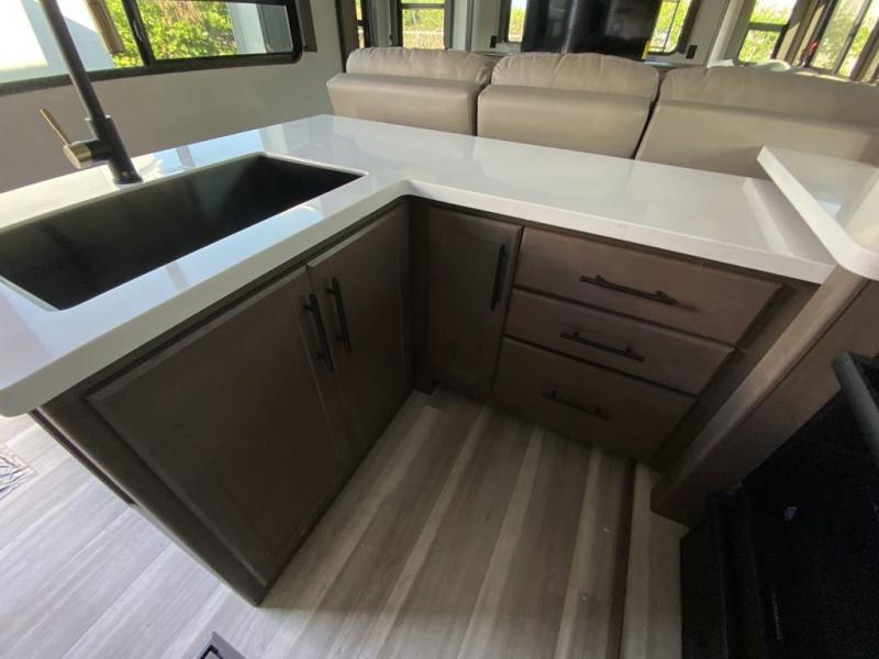 Time at the campground will be spent in comfort thanks to this fifth wheel that can sleep four to six people comfortably. The rear living area/den includes a huge L-shaped sofa with theater seats and a king tri-fold sofa, plus a free-standing dinette with an ottoman on one side, a fireplace, and an LED HDTV for movie nights. The chef of your group will love the additional counter space in the kitchen, along with a 21" Furrion range, plus a pantry and 16 cu. ft. 12V refrigerator. The full bath allows you to clean up each day and the front private bedroom will provide you with your own space at night. Here, you'll find a queen bed slide out that can optioned out for a king bed, plus a full height wardrobe, a second wardrobe with washer and dryer prep, and a dresser with a sliding top and hidden storage for valuables!
