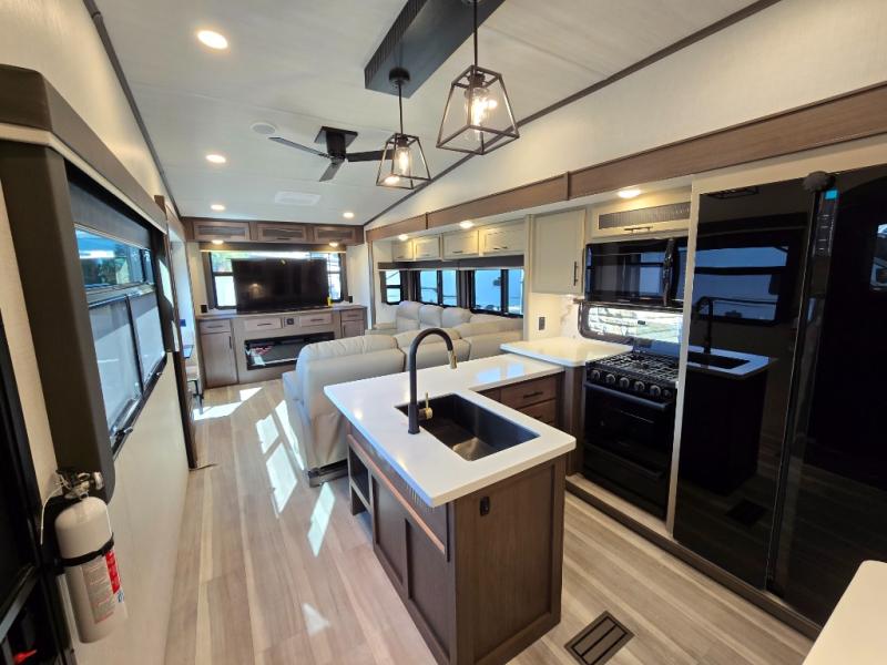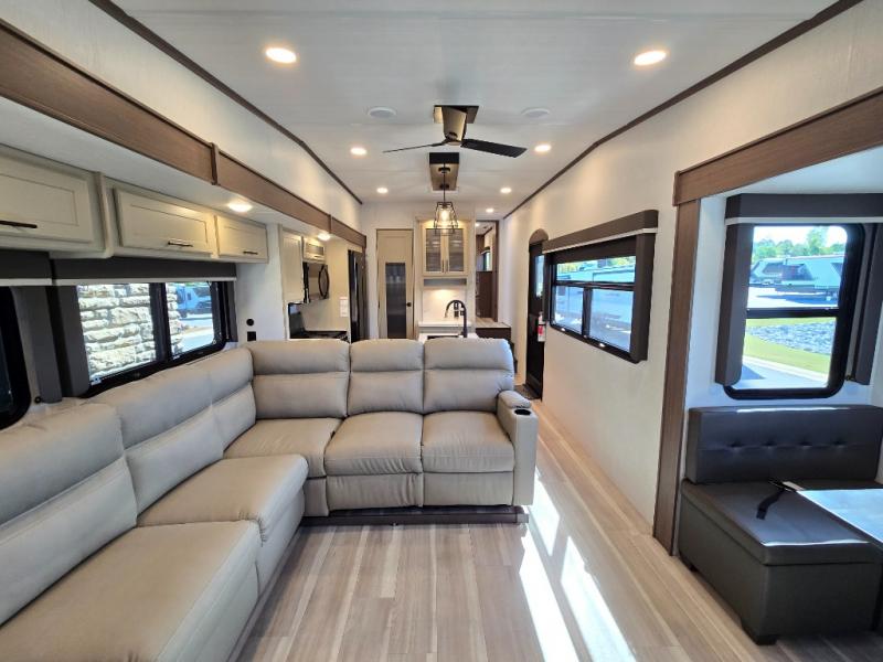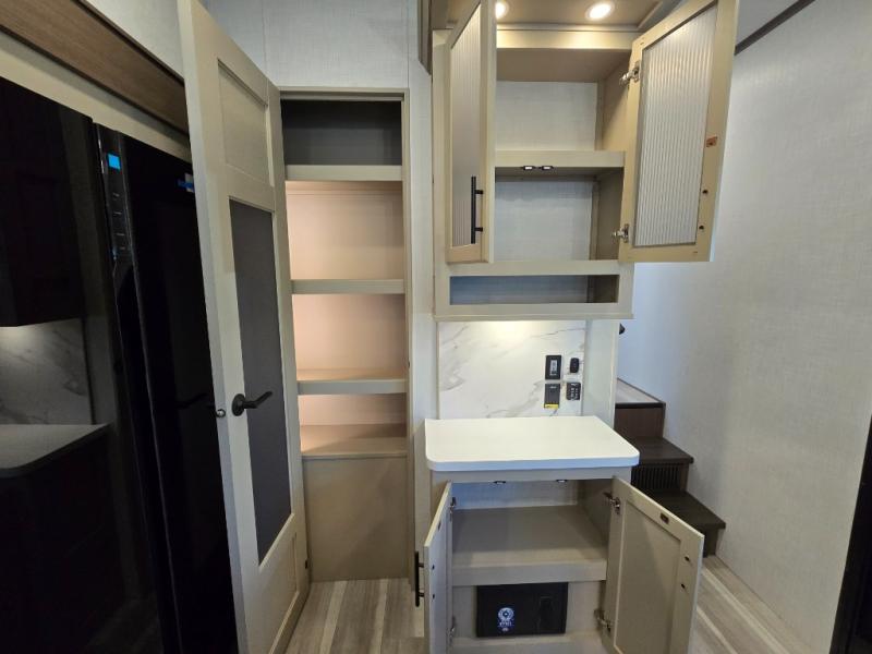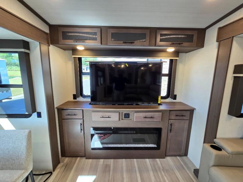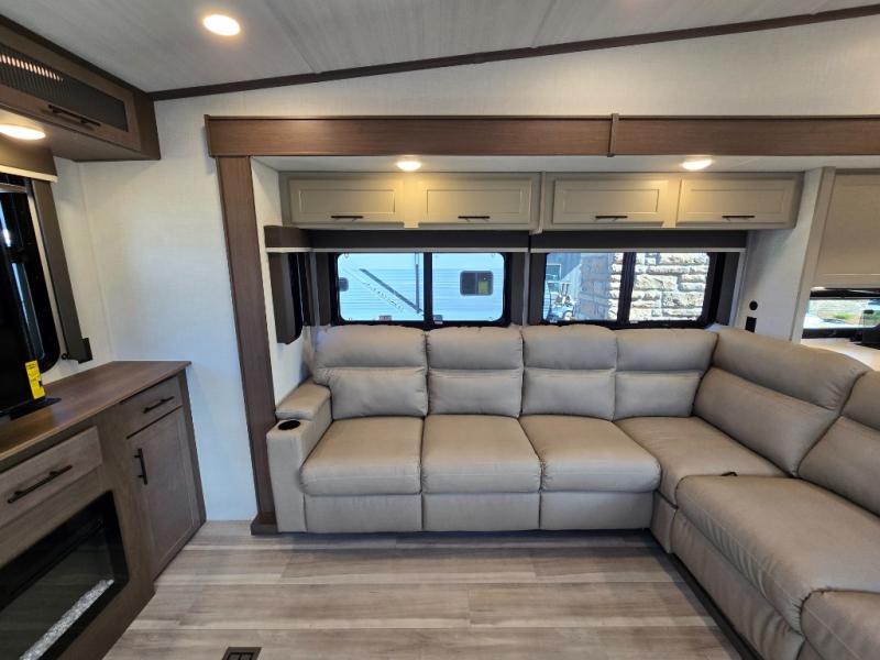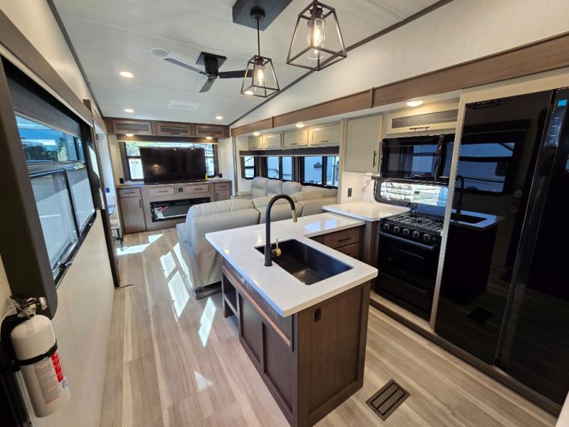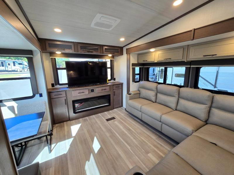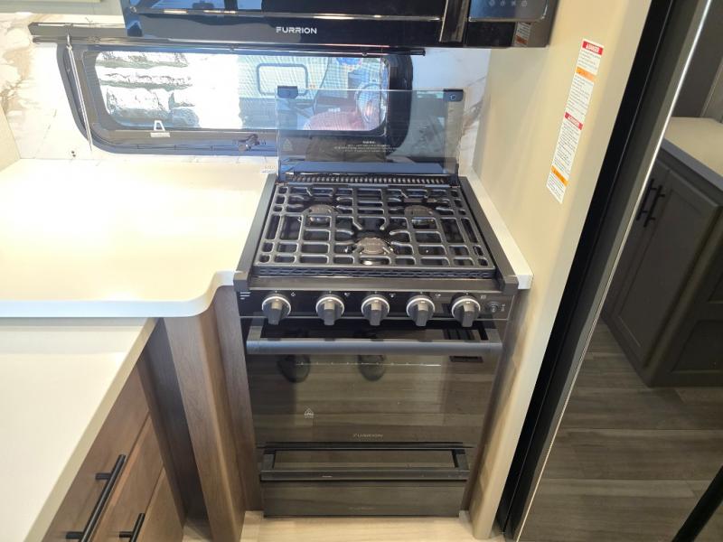 Time at the campground will be spent in comfort thanks to this fifth wheel that can sleep four to six people comfortably. The rear living area/den includes a huge L-shaped sofa with theater seats and a king tri-fold sofa, plus a free-standing dinette with an ottoman on one side, a fireplace, and an LED HDTV for movie nights. The chef of your group will love the additional counter space in the kitchen, along with a 21" Furrion range, plus a pantry and 16 cu. ft. 12V refrigerator. The full bath allows you to clean up each day and the front private bedroom will provide you with your own space at night. Here, you'll find a queen bed slide out that can optioned out for a king bed, plus a full height wardrobe, a second wardrobe with washer and dryer prep, and a dresser with a sliding top and hidden storage for valuables!