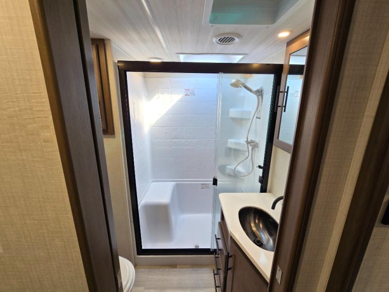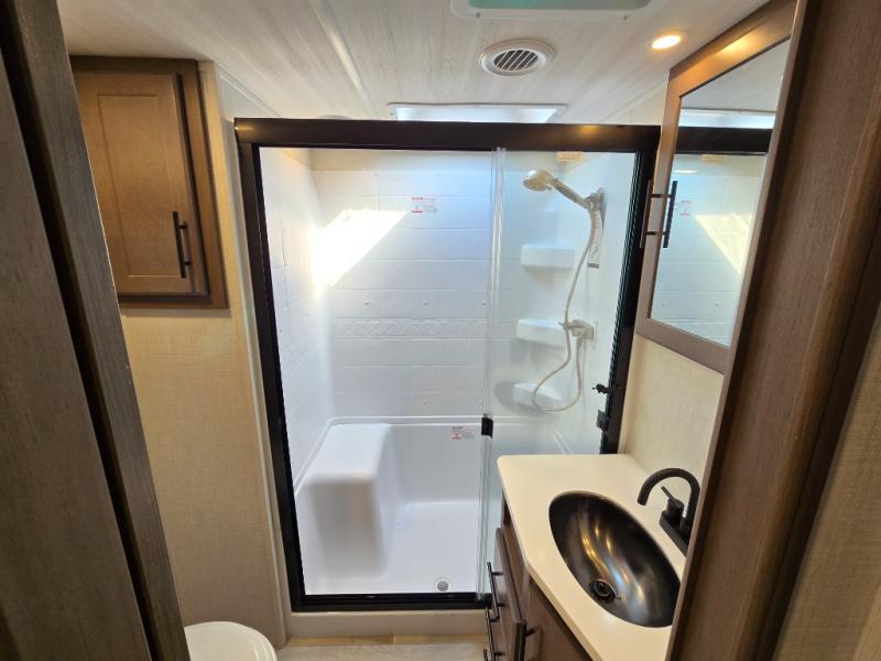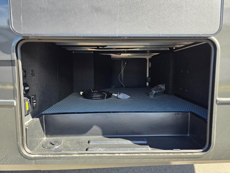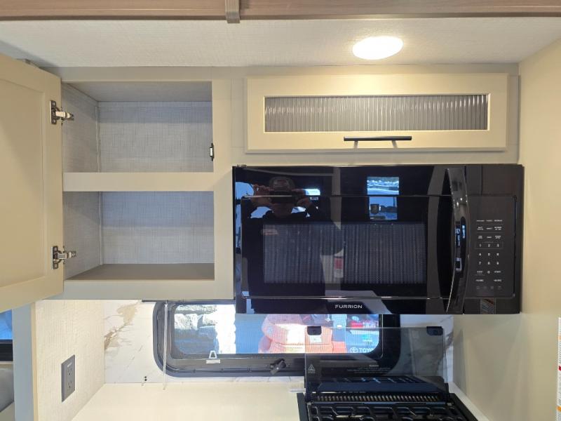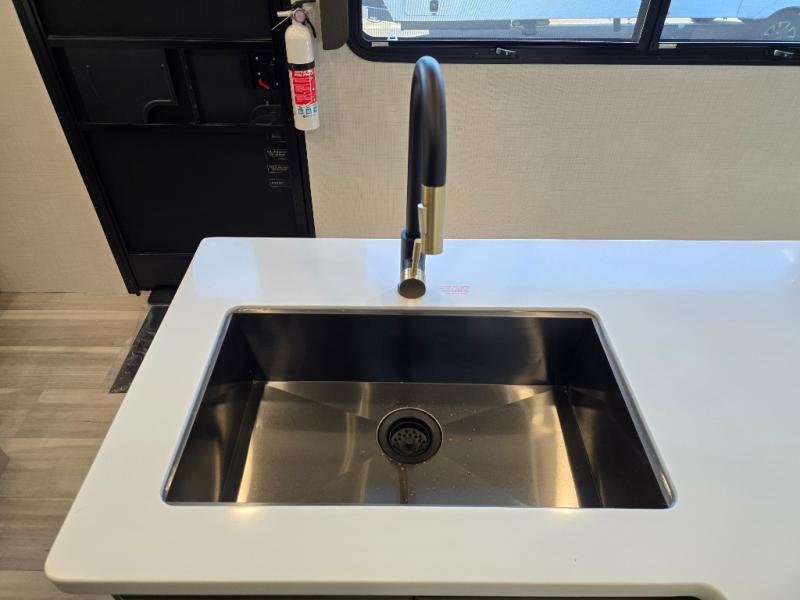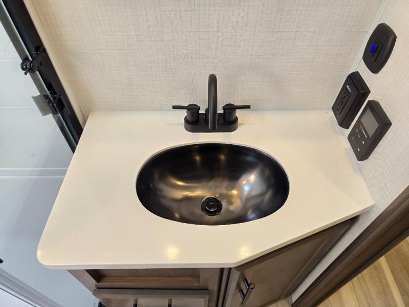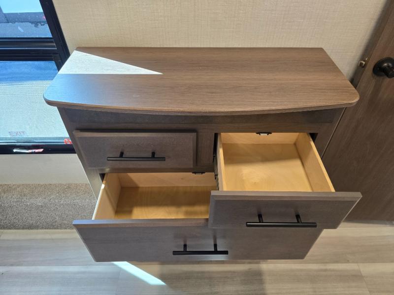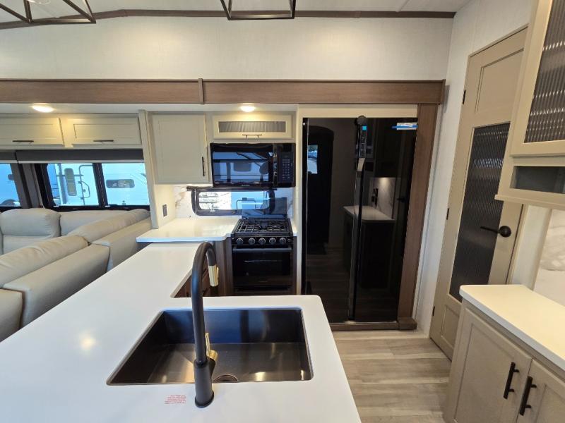 Time at the campground will be spent in comfort thanks to this fifth wheel that can sleep four to six people comfortably. The rear living area/den includes a huge L-shaped sofa with theater seats and a king tri-fold sofa, plus a free-standing dinette with an ottoman on one side, a fireplace, and an LED HDTV for movie nights. The chef of your group will love the additional counter space in the kitchen, along with a 21" Furrion range, plus a pantry and 16 cu. ft. 12V refrigerator. The full bath allows you to clean up each day and the front private bedroom will provide you with your own space at night. Here, you'll find a queen bed slide out that can optioned out for a king bed, plus a full height wardrobe, a second wardrobe with washer and dryer prep, and a dresser with a sliding top and hidden storage for valuables!