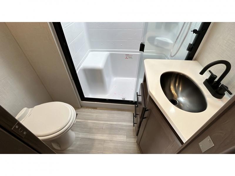 Time at the campground will be spent in comfort thanks to this fifth wheel that can sleep four to six people comfortably. The rear living area/den includes a huge L-shaped sofa with theater seats and a king tri-fold sofa, plus a free-standing dinette with an ottoman on one side, a fireplace, and an LED HDTV for movie nights. The chef of your group will love the additional counter space in the kitchen, along with a 21" Furrion range, plus a pantry and 16 cu. ft. 12V refrigerator. The full bath allows you to clean up each day and the front private bedroom will provide you with your own space at night. Here, you'll find a queen bed slide out that can optioned out for a king bed, plus a full height wardrobe, a second wardrobe with washer and dryer prep, and a dresser with a sliding top and hidden storage for valuables!