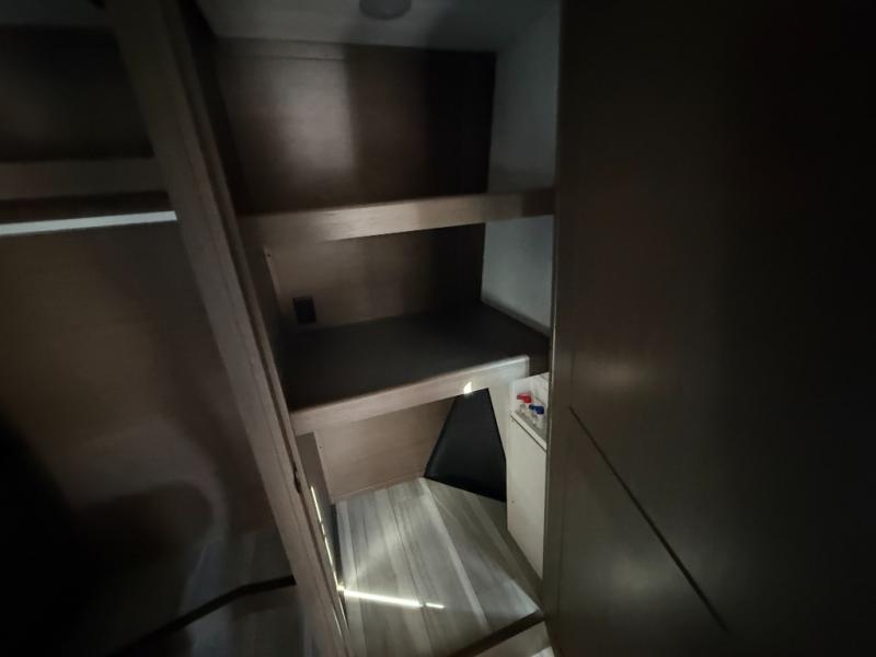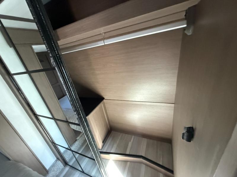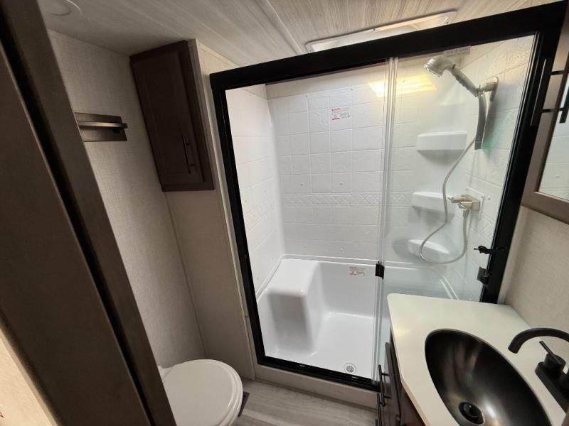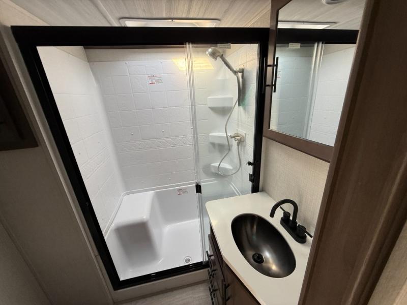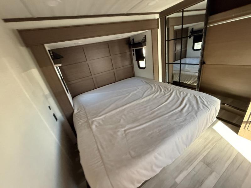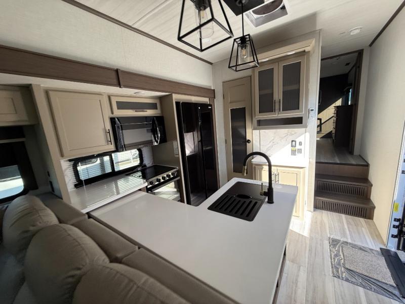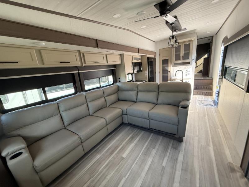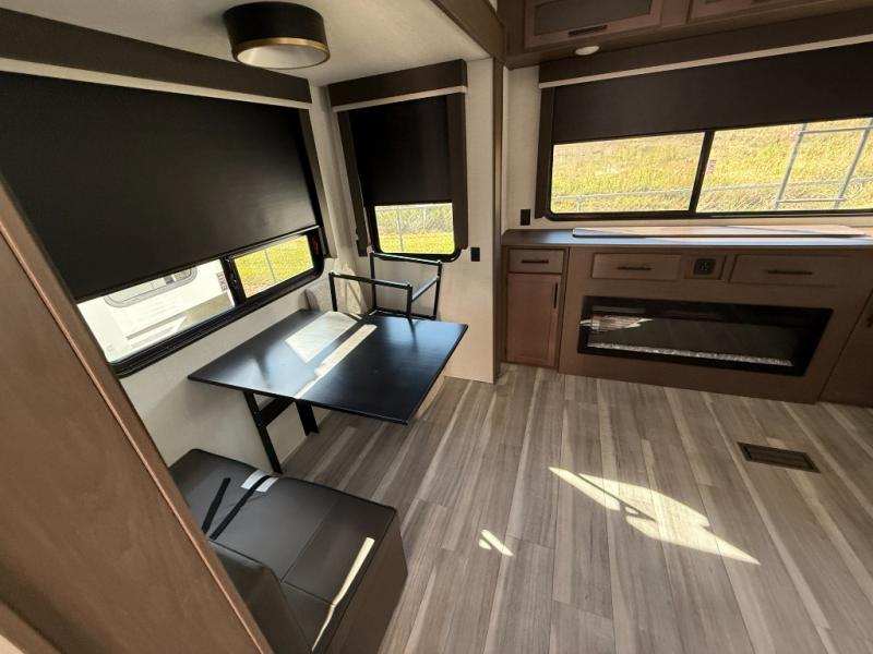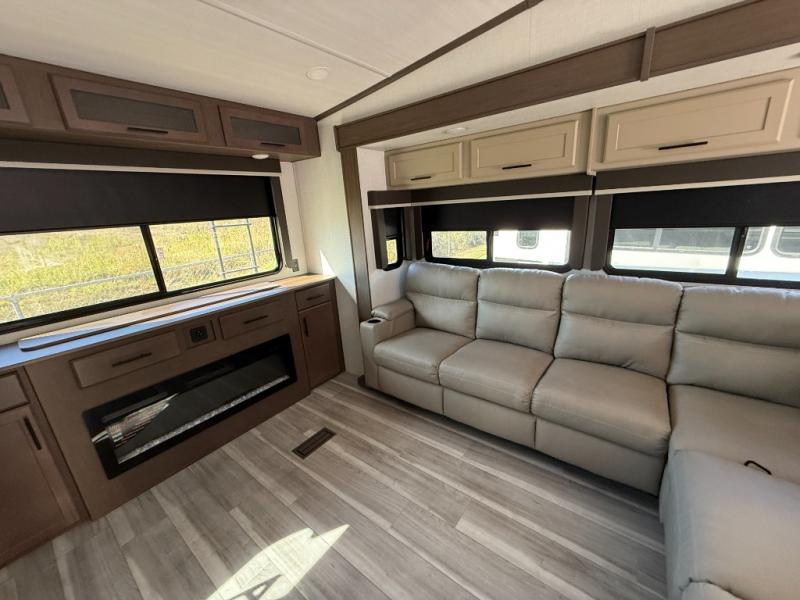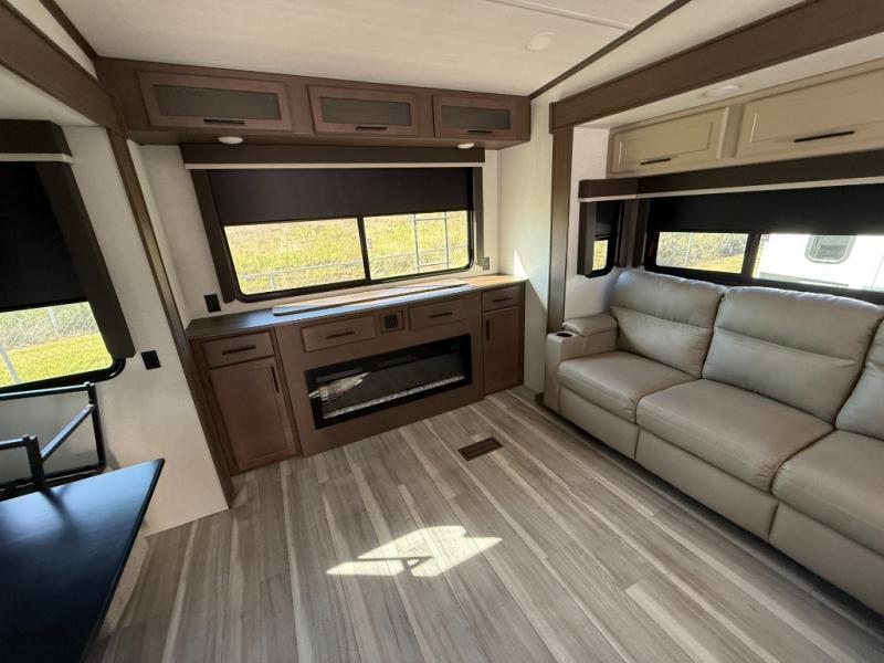 Time at the campground will be spent in comfort thanks to this fifth wheel that can sleep four to six people comfortably. The rear living area/den includes a huge L-shaped sofa with theater seats and a king tri-fold sofa, plus a free-standing dinette with an ottoman on one side, a fireplace, and an LED HDTV for movie nights. The chef of your group will love the additional counter space in the kitchen, along with a 21" Furrion range, plus a pantry and 16 cu. ft. 12V refrigerator. The full bath allows you to clean up each day and the front private bedroom will provide you with your own space at night. Here, you'll find a queen bed slide out that can optioned out for a king bed, plus a full height wardrobe, a second wardrobe with washer and dryer prep, and a dresser with a sliding top and hidden storage for valuables!
