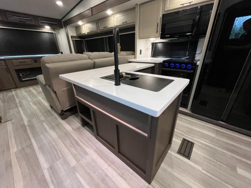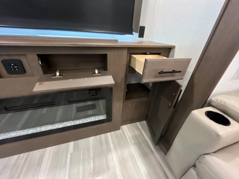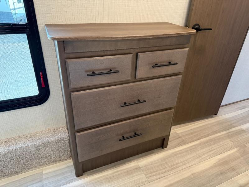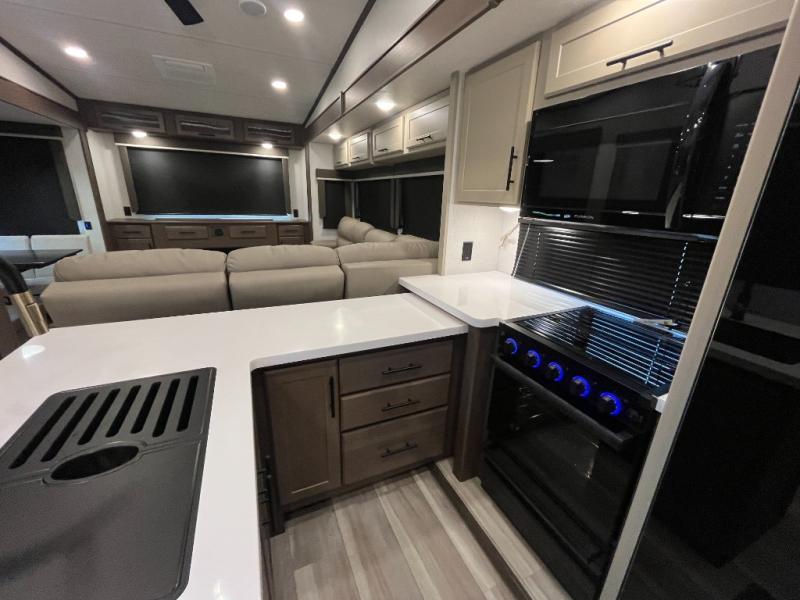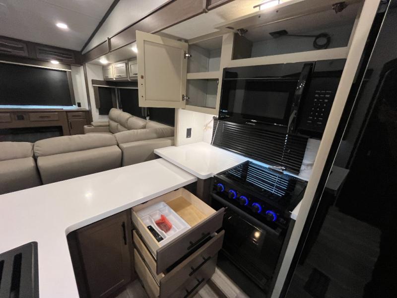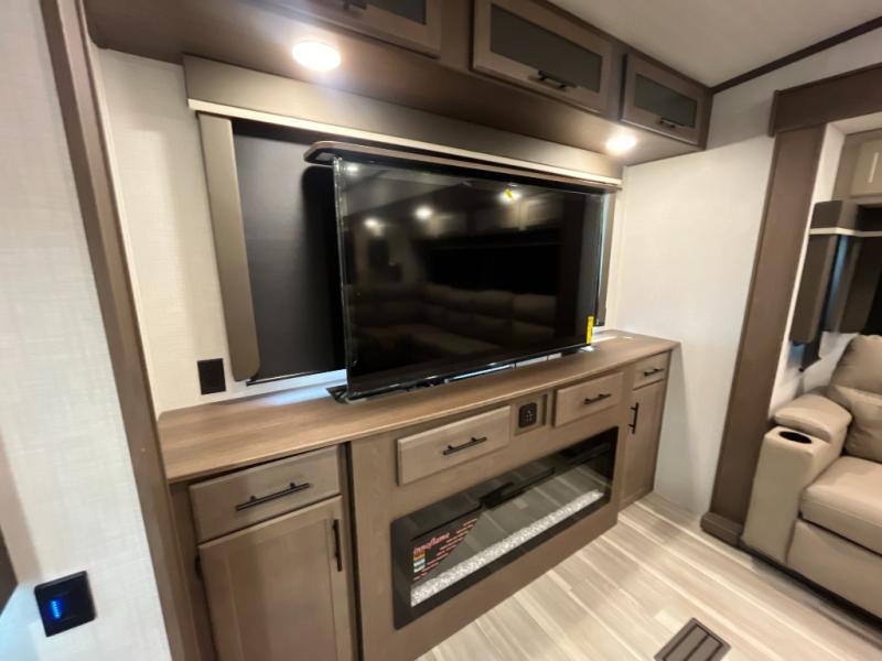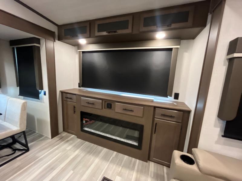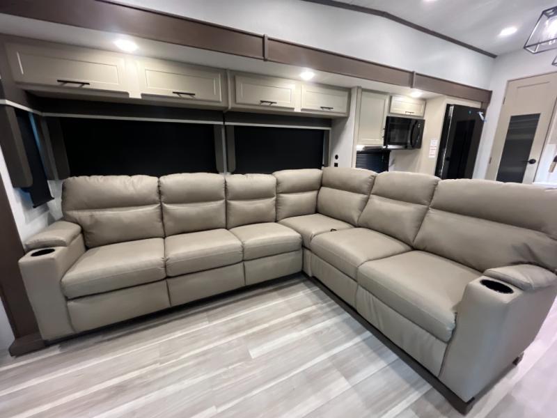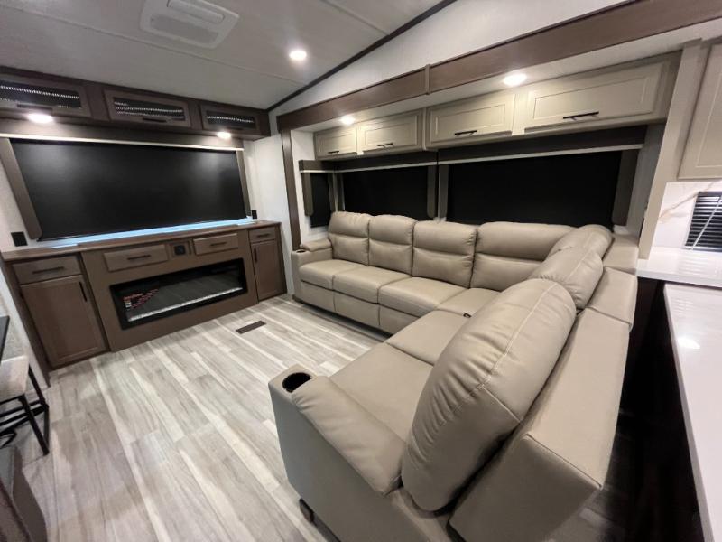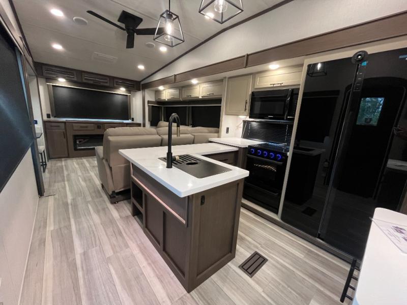 Time at the campground will be spent in comfort thanks to this fifth wheel that can sleep four to six people comfortably. The rear living area/den includes a huge L-shaped sofa with theater seats and a king tri-fold sofa, plus a free-standing dinette with an ottoman on one side, a fireplace, and an LED HDTV for movie nights. The chef of your group will love the additional counter space in the kitchen, along with a 21" Furrion range, plus a pantry and 16 cu. ft. 12V refrigerator. The full bath allows you to clean up each day and the front private bedroom will provide you with your own space at night. Here, you'll find a queen bed slide out that can optioned out for a king bed, plus a full height wardrobe, a second wardrobe with washer and dryer prep, and a dresser with a sliding top and hidden storage for valuables!