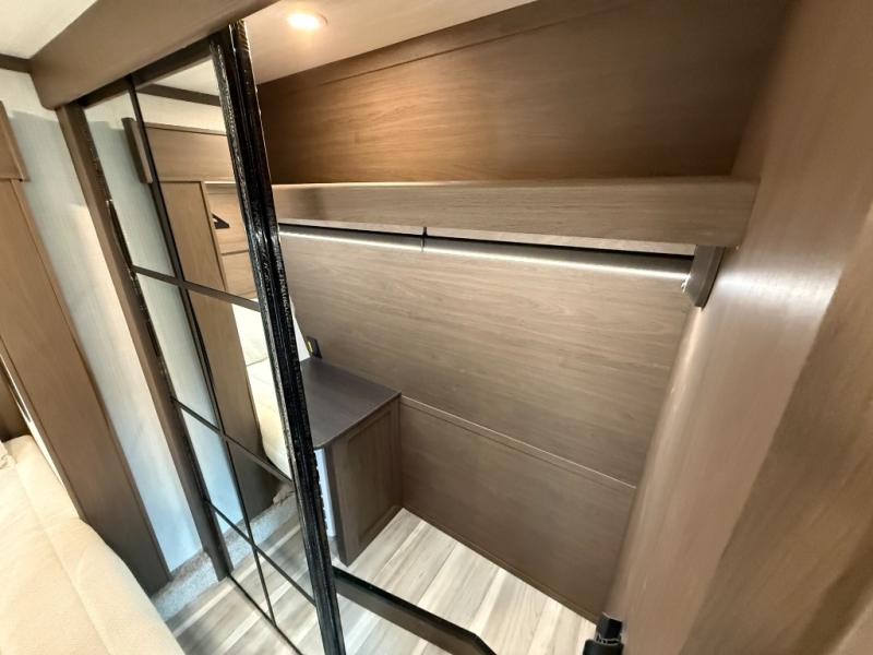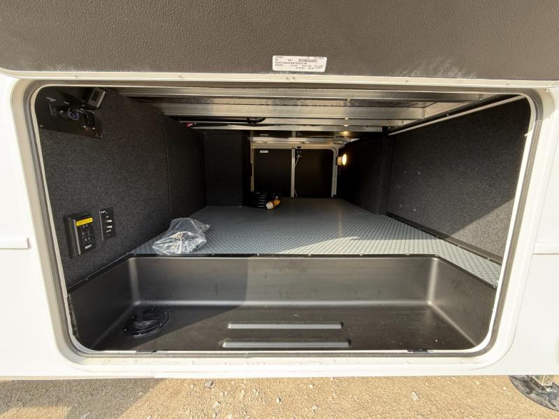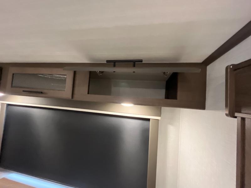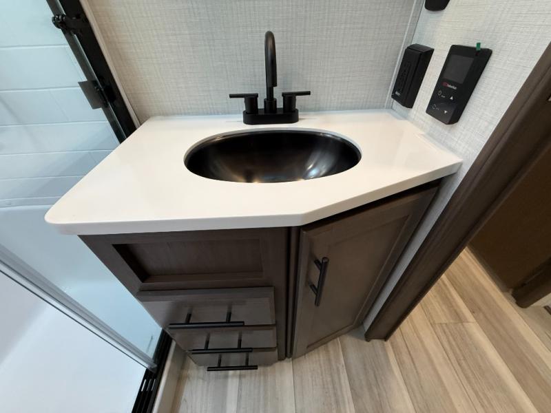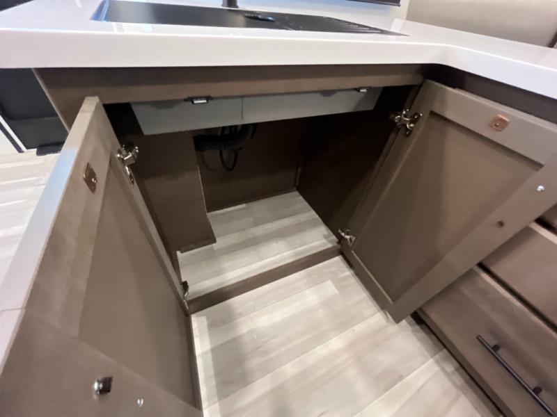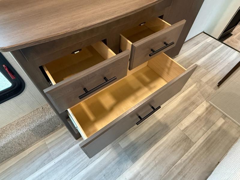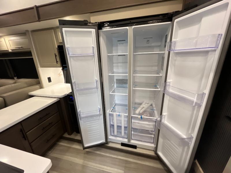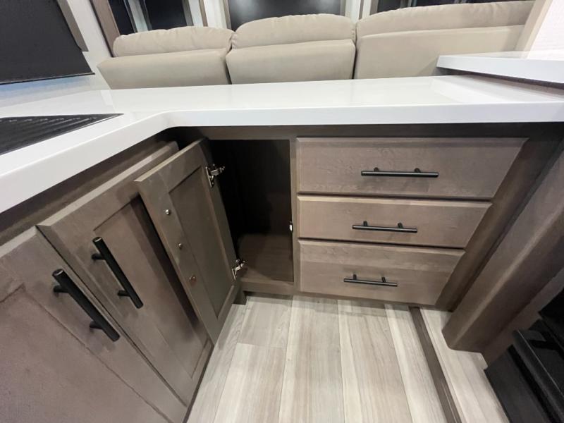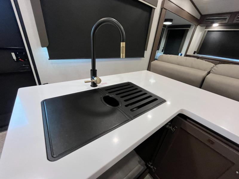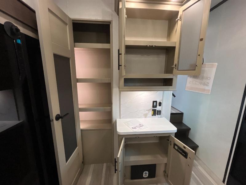 Time at the campground will be spent in comfort thanks to this fifth wheel that can sleep four to six people comfortably. The rear living area/den includes a huge L-shaped sofa with theater seats and a king tri-fold sofa, plus a free-standing dinette with an ottoman on one side, a fireplace, and an LED HDTV for movie nights. The chef of your group will love the additional counter space in the kitchen, along with a 21" Furrion range, plus a pantry and 16 cu. ft. 12V refrigerator. The full bath allows you to clean up each day and the front private bedroom will provide you with your own space at night. Here, you'll find a queen bed slide out that can optioned out for a king bed, plus a full height wardrobe, a second wardrobe with washer and dryer prep, and a dresser with a sliding top and hidden storage for valuables!
