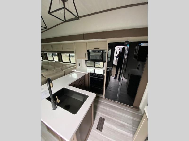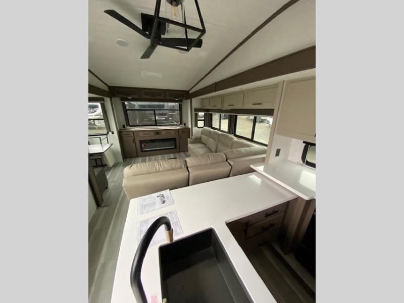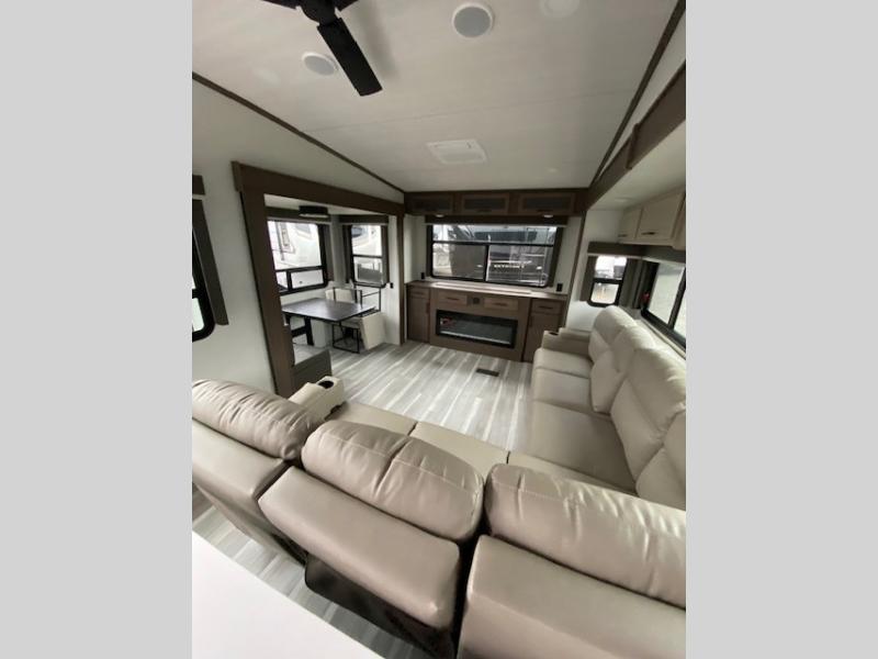 Time at the campground will be spent in comfort thanks to this fifth wheel that can sleep four to six people comfortably. The rear living area/den includes a huge L-shaped sofa with theater seats and a king tri-fold sofa, plus a free-standing dinette with an ottoman on one side, a fireplace, and an LED HDTV for movie nights. The chef of your group will love the additional counter space in the kitchen, along with a 21" Furrion range, plus a pantry and 16 cu. ft. 12V refrigerator. The full bath allows you to clean up each day and the front private bedroom will provide you with your own space at night. Here, you'll find a queen bed slide out that can optioned out for a king bed, plus a full height wardrobe, a second wardrobe with washer and dryer prep, and a dresser with a sliding top and hidden storage for valuables!