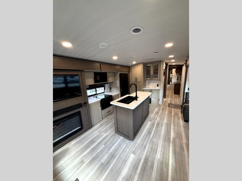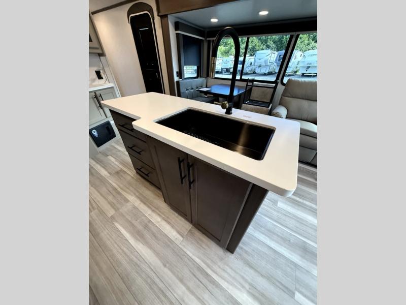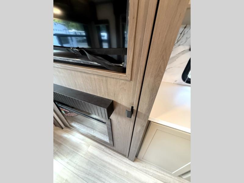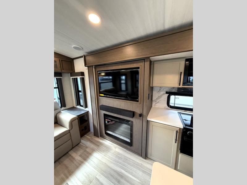 You'll definitely want to snatch up this Cougar Half-Ton travel trailer if you're a couple or small family that wants to live in comfort while at the campsite! There is a private bedroom at the front, and it has a queen bed slide or optional king bed, full-width wardrobe, and a dresser to keep your clothes tidy. Right next to the bedroom is a full bathroom that comes with a linen closet with washer and dryer prep. The main living area is what truly gives you the royal treatment because it has theater seating directly across from the entertainment center and fireplace, a kitchen island that you can gather around when it's snack time, a booth dinette that will serve as a bed or a dinner table, and a 68" tri-fold sleeper sofa with end tables for a cold drink. The kitchen also has a pantry, so you can keep your trailer stocked with goodies throughout the whole trip.