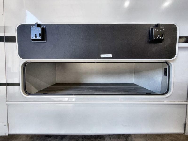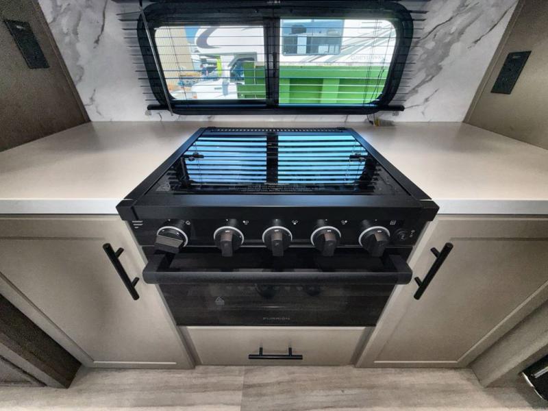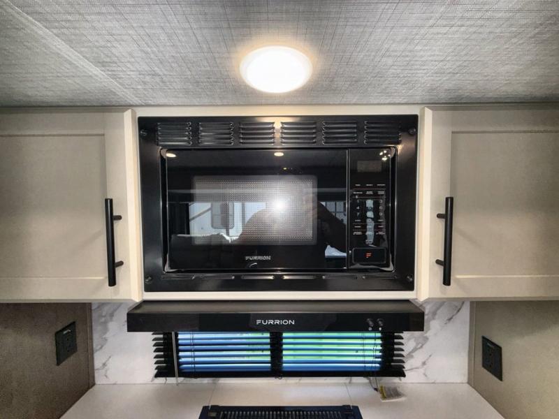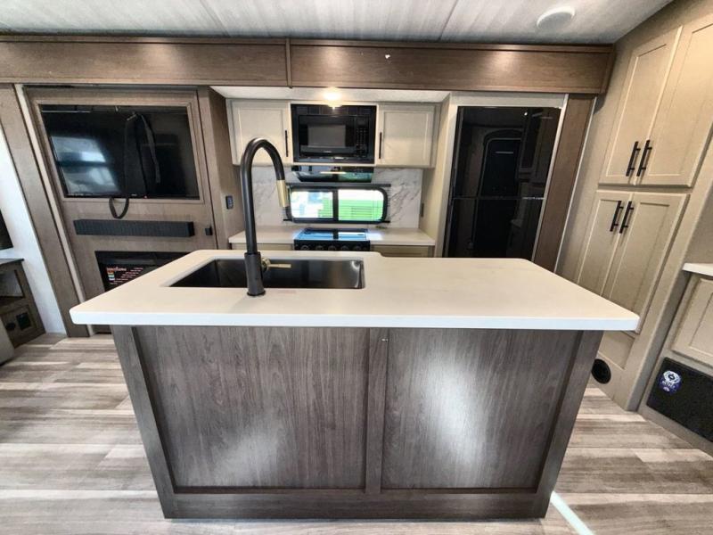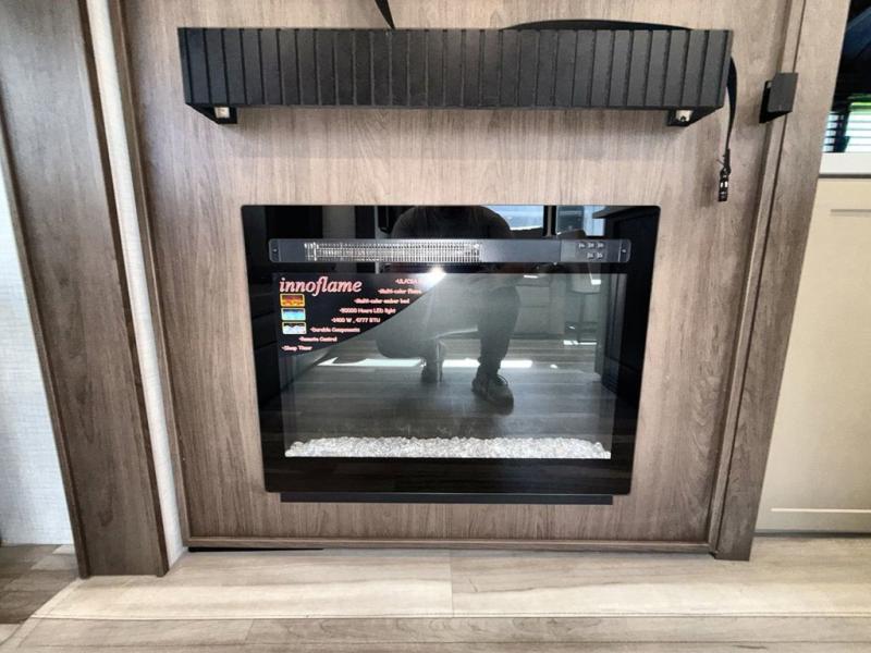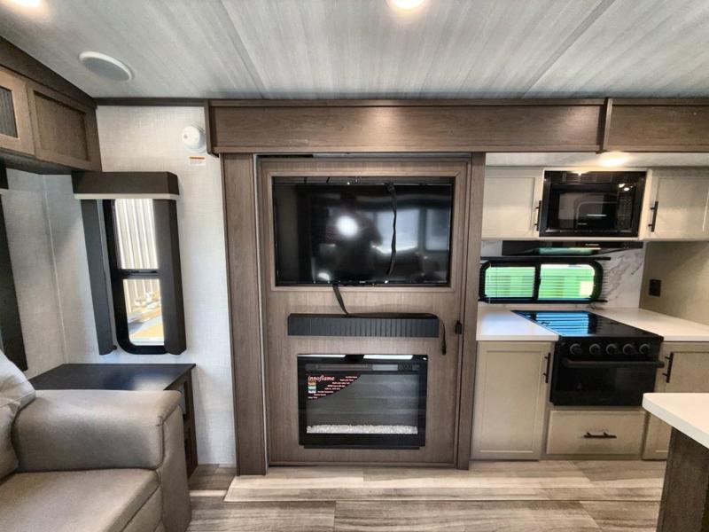 You'll definitely want to snatch up this Cougar Half-Ton travel trailer if you're a couple or small family that wants to live in comfort while at the campsite! There is a private bedroom at the front, and it has a queen bed slide or optional king bed, full-width wardrobe, and a dresser to keep your clothes tidy. Right next to the bedroom is a full bathroom that comes with a linen closet with washer and dryer prep. The main living area is what truly gives you the royal treatment because it has theater seating directly across from the entertainment center and fireplace, a kitchen island that you can gather around when it's snack time, a booth dinette that will serve as a bed or a dinner table, and a 68" tri-fold sleeper sofa with end tables for a cold drink. The kitchen also has a pantry, so you can keep your trailer stocked with goodies throughout the whole trip.