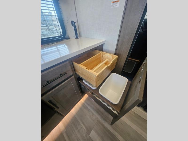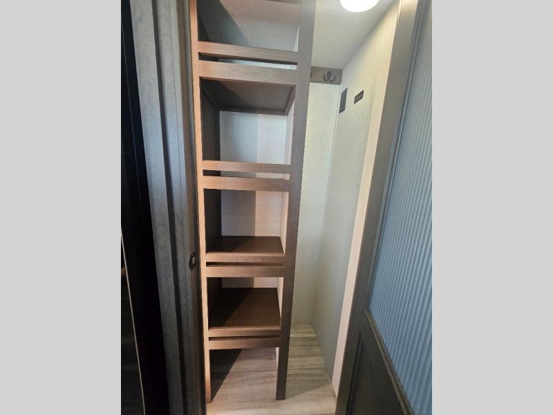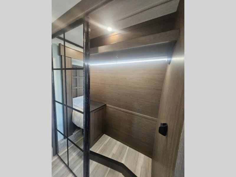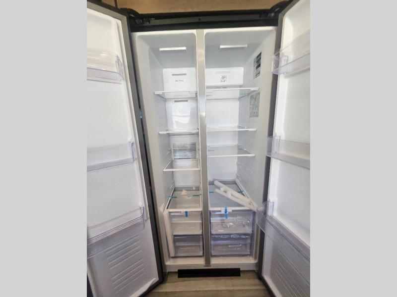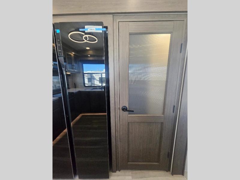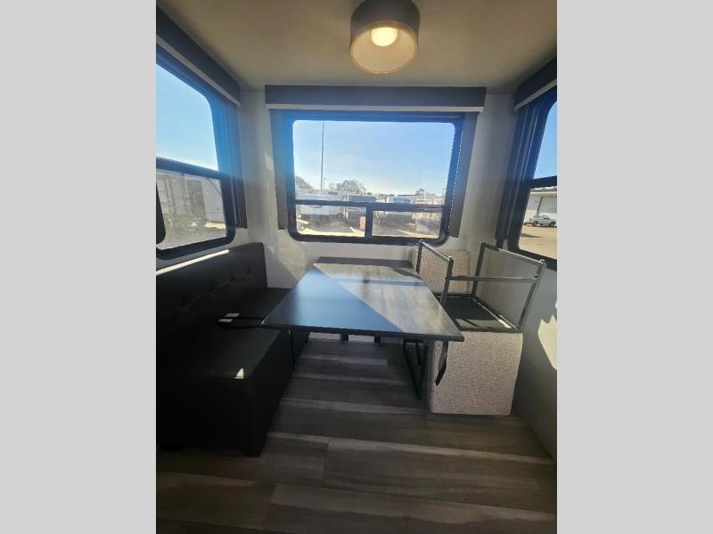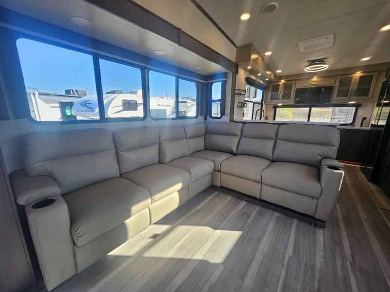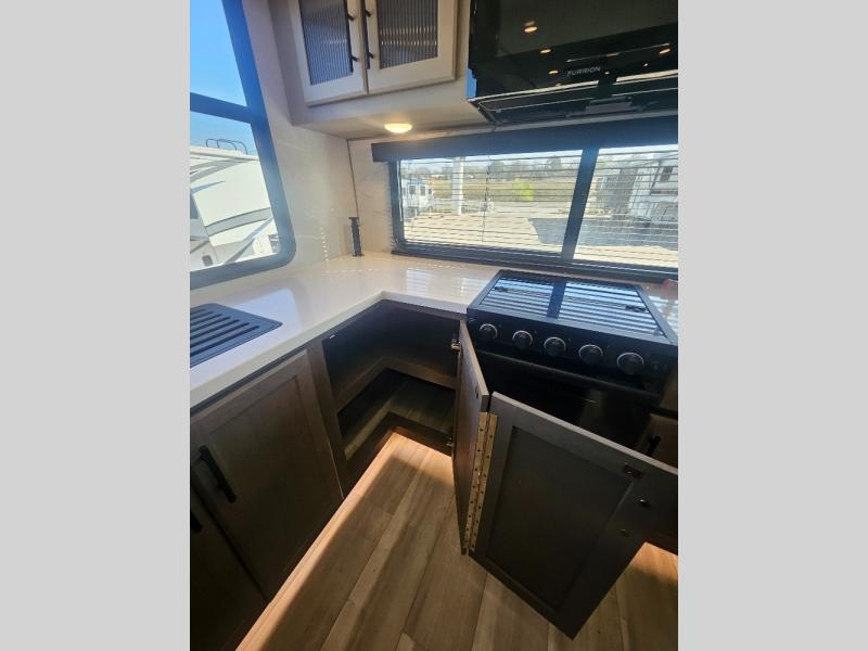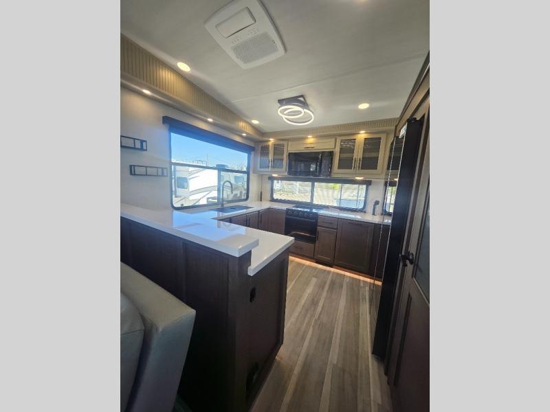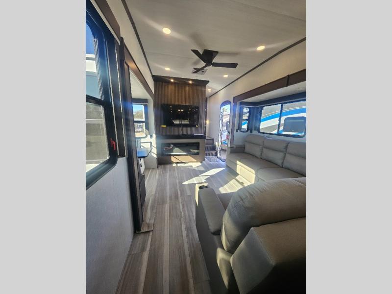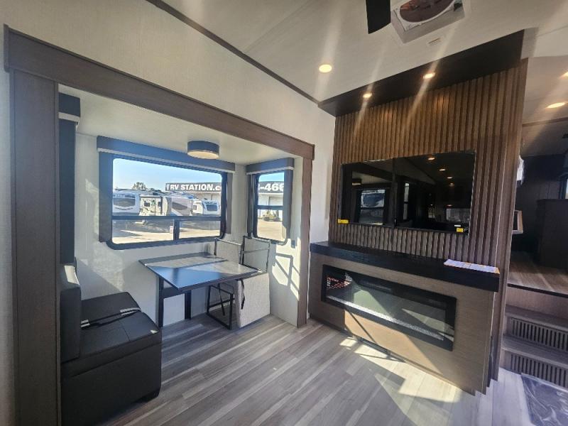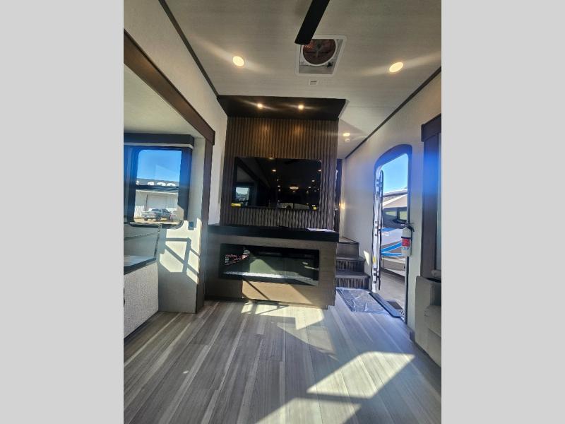 Luxury is the name of the game with this spacious fifth wheel! The chef of your group will love the rear luxury kitchen with wrap-around counter space, a large sink, dishwasher prep, and all the appliances needed to cook and store meals. After dinner, your crew can relax in the middle living room on the L-shaped sofa or play a game at the dinette with bench seating on one side and chairs on the other. There is also a 12V ceiling fan here, along with a fireplace and a TV for movie nights! The spacious full bath includes a shower with a seat plus a large vanity counter to easily get ready each day, and you're going to love the front private bedroom with a queen bed slide out. There is also a full height wardrobe here, along with a pull-out laundry center, underbed storage, plus stackable washer and dryer prep!