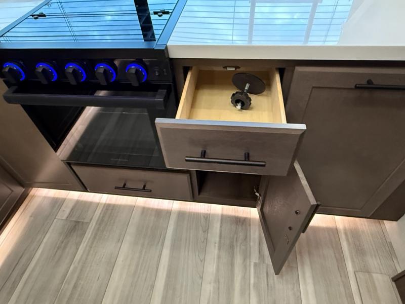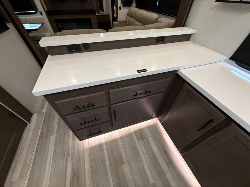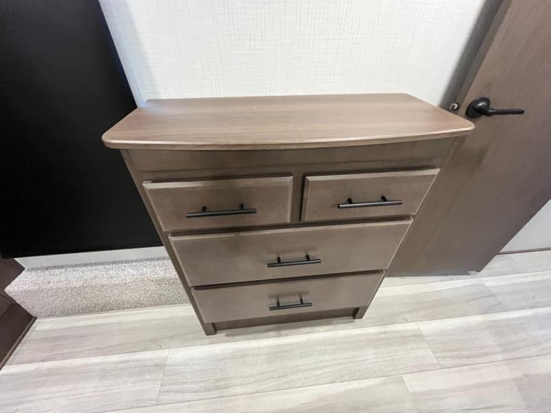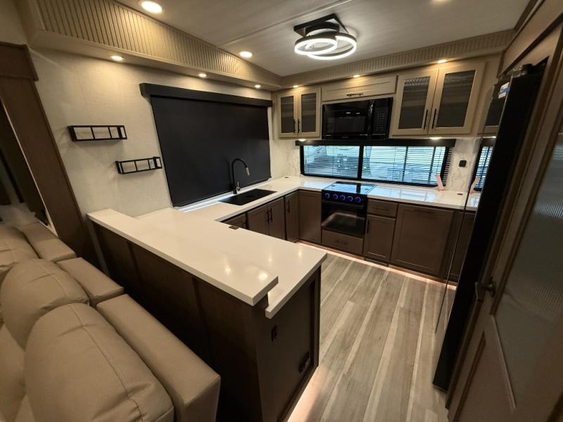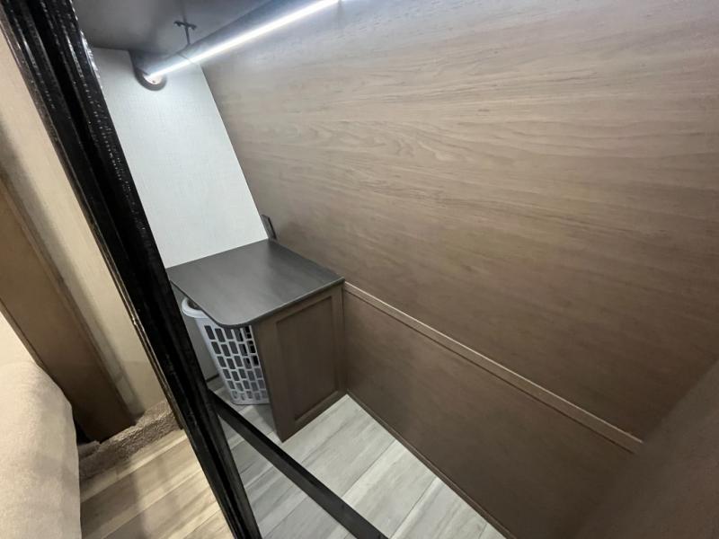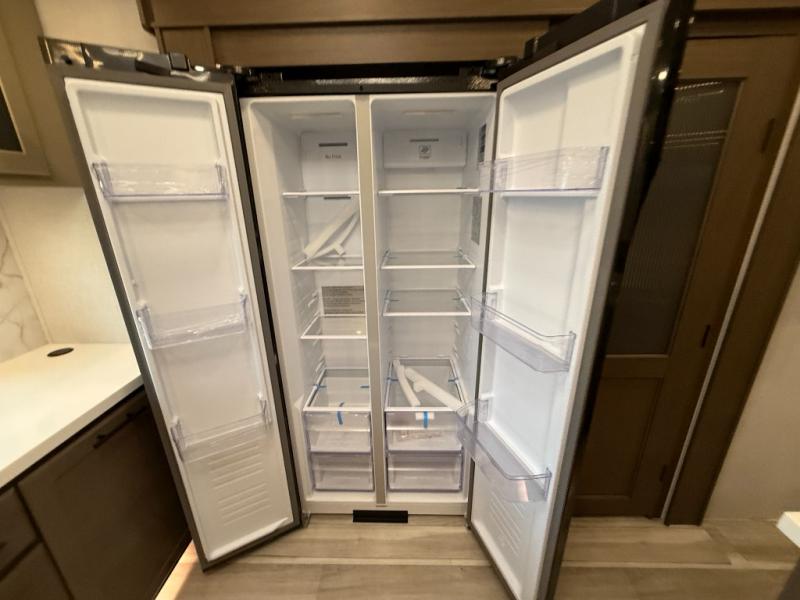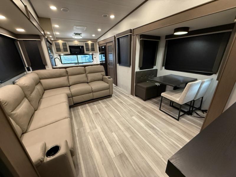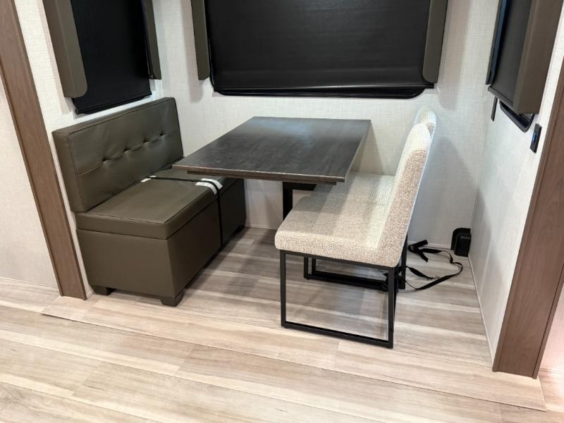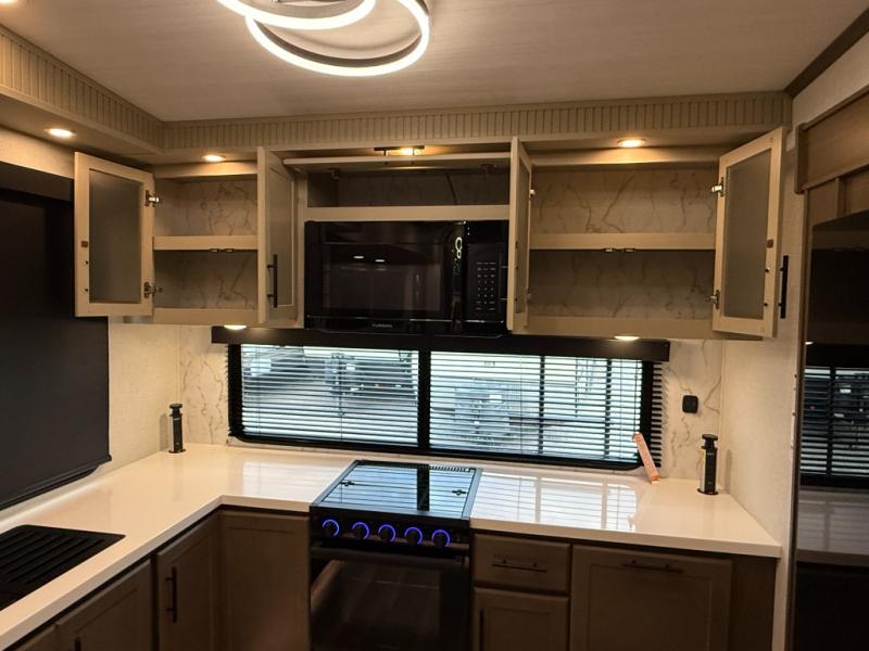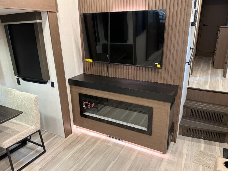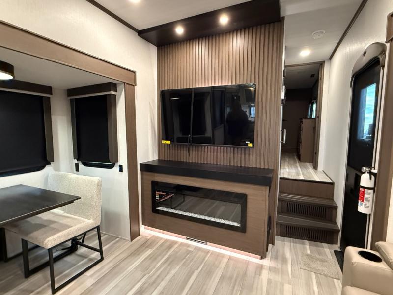 Luxury is the name of the game with this spacious fifth wheel! The chef of your group will love the rear luxury kitchen with wrap-around counter space, a large sink, dishwasher prep, and all the appliances needed to cook and store meals. After dinner, your crew can relax in the middle living room on the L-shaped sofa or play a game at the dinette with bench seating on one side and chairs on the other. There is also a 12V ceiling fan here, along with a fireplace and a TV for movie nights! The spacious full bath includes a shower with a seat plus a large vanity counter to easily get ready each day, and you're going to love the front private bedroom with a queen bed slide out. There is also a full height wardrobe here, along with a pull-out laundry center, underbed storage, plus stackable washer and dryer prep!