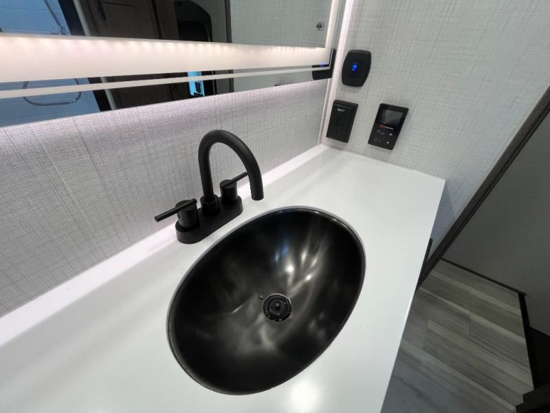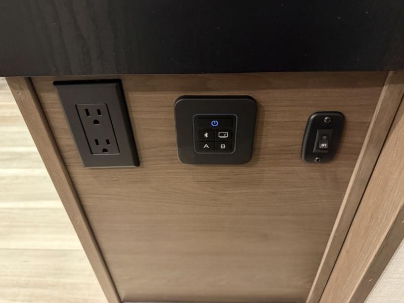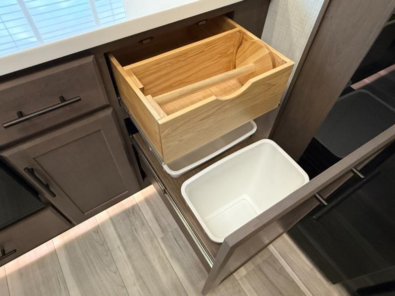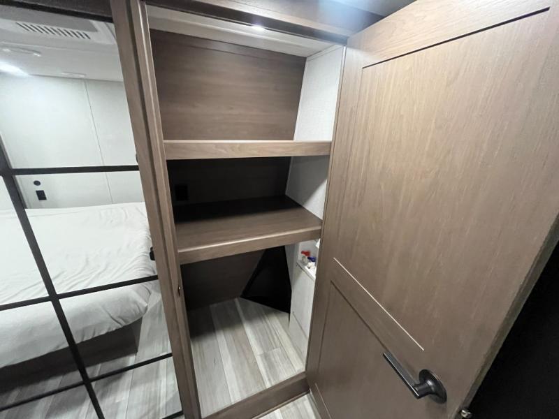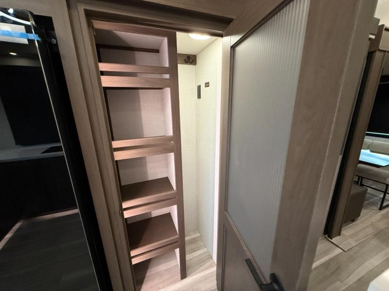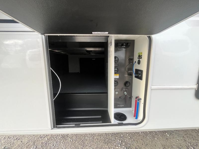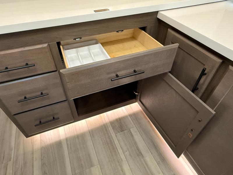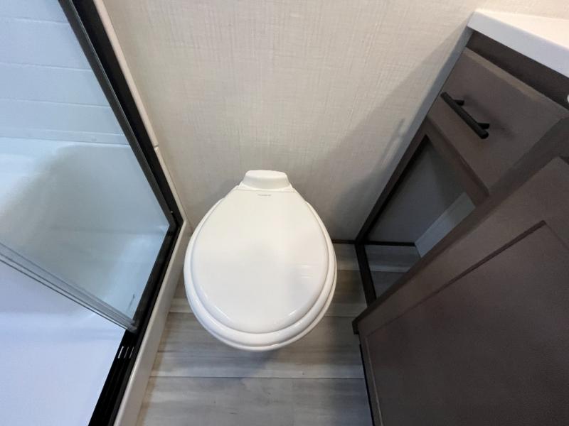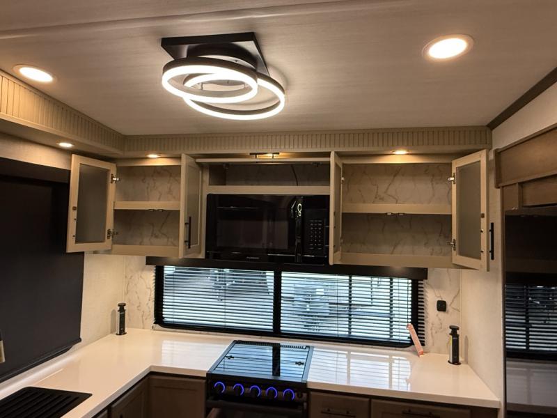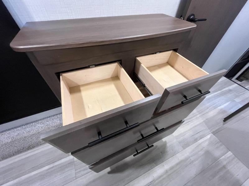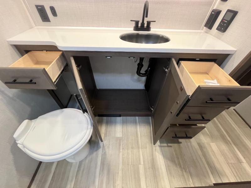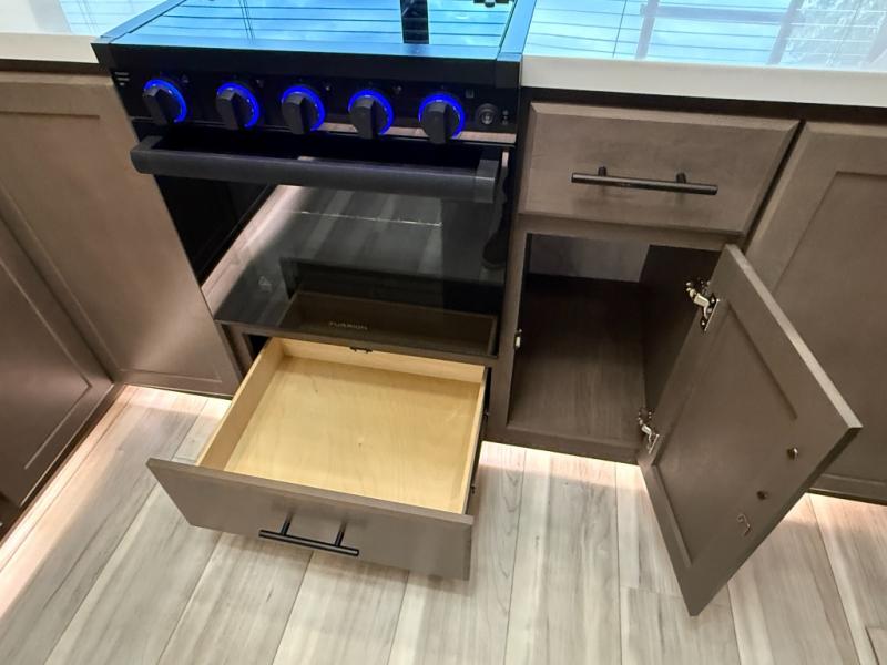 Luxury is the name of the game with this spacious fifth wheel! The chef of your group will love the rear luxury kitchen with wrap-around counter space, a large sink, dishwasher prep, and all the appliances needed to cook and store meals. After dinner, your crew can relax in the middle living room on the L-shaped sofa or play a game at the dinette with bench seating on one side and chairs on the other. There is also a 12V ceiling fan here, along with a fireplace and a TV for movie nights! The spacious full bath includes a shower with a seat plus a large vanity counter to easily get ready each day, and you're going to love the front private bedroom with a queen bed slide out. There is also a full height wardrobe here, along with a pull-out laundry center, underbed storage, plus stackable washer and dryer prep!