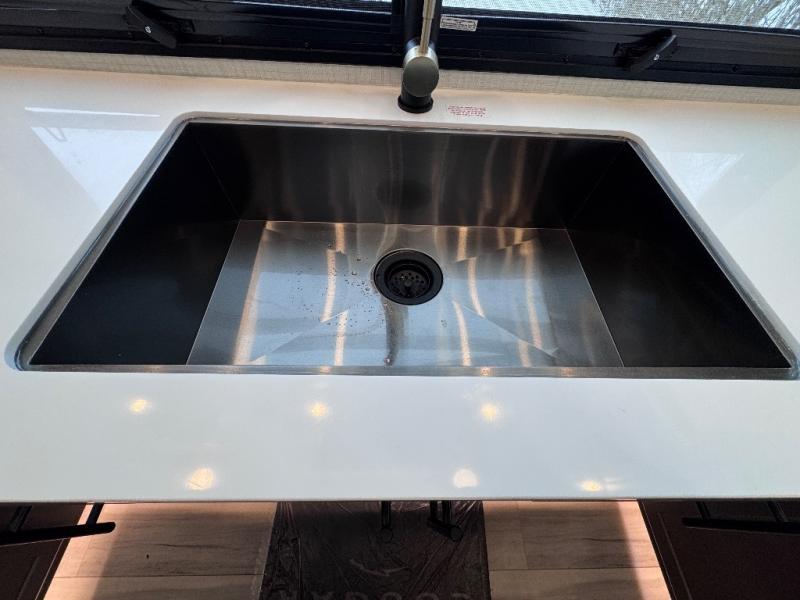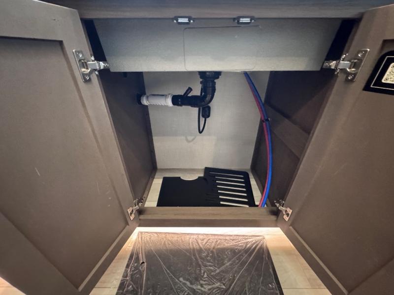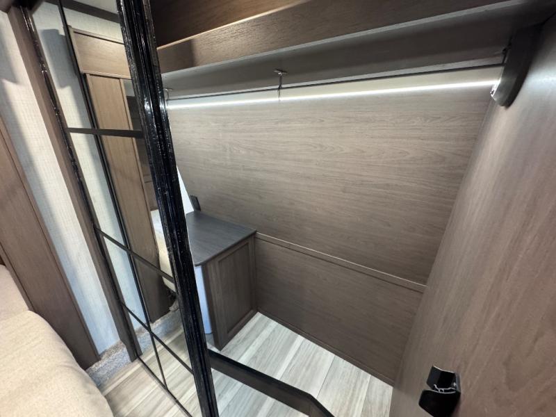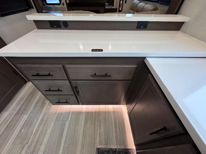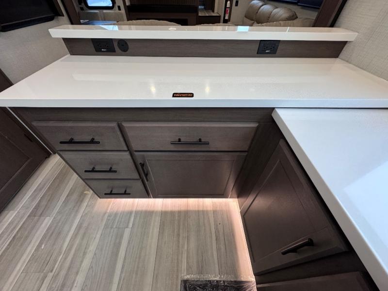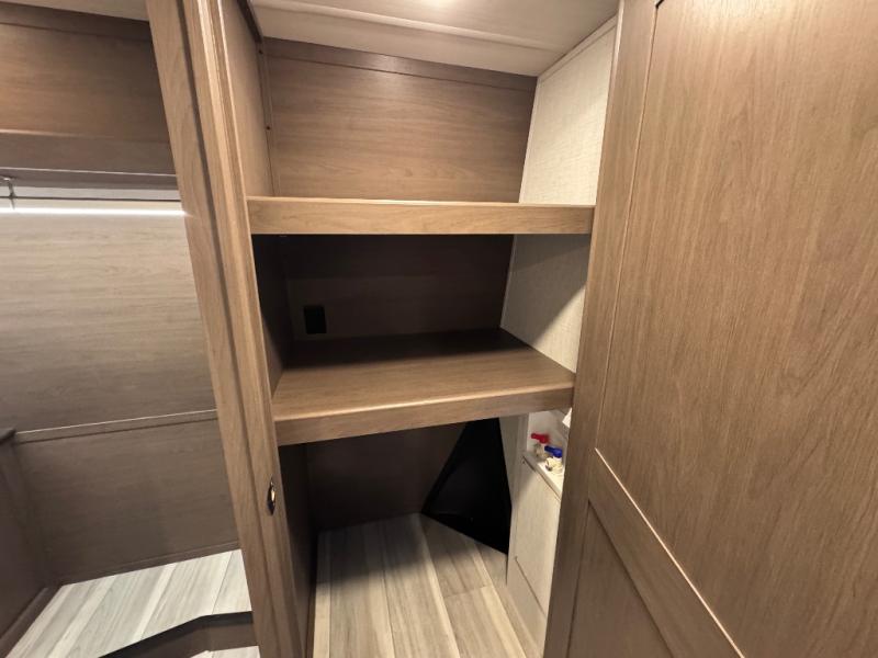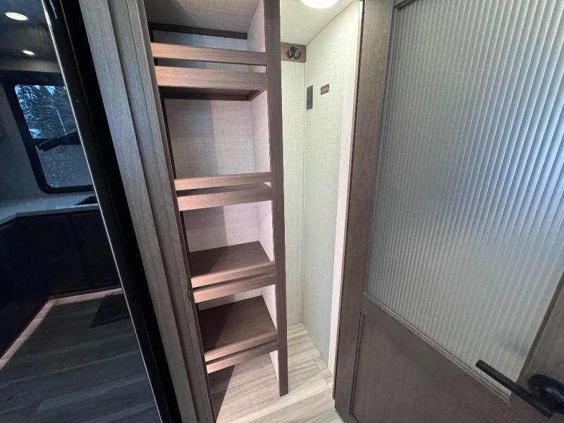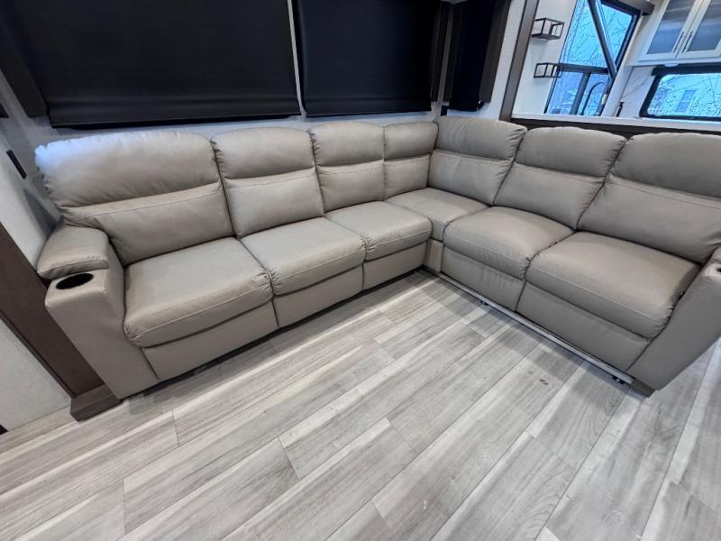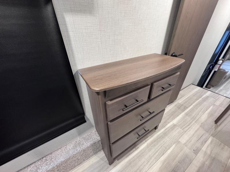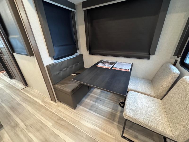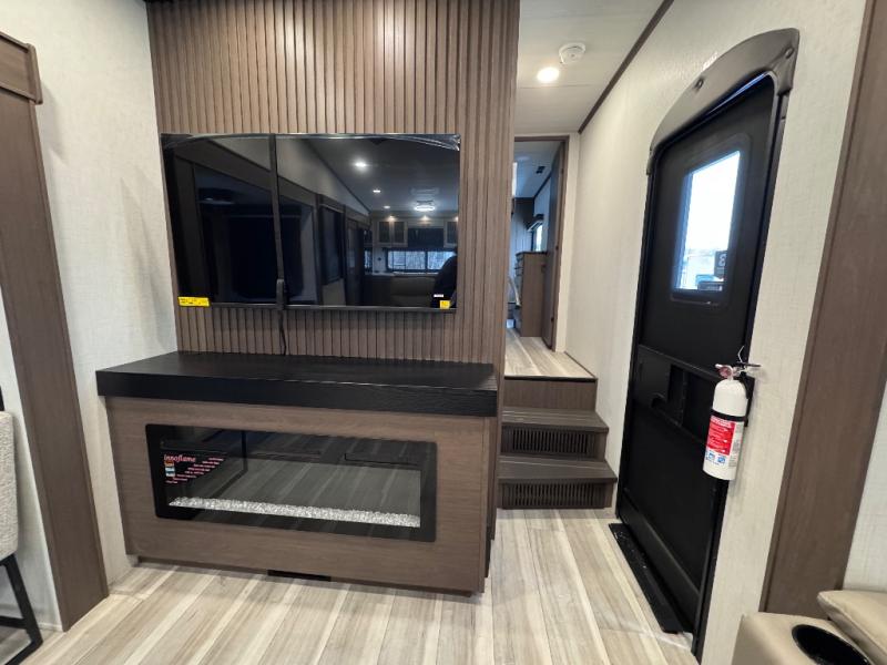 Luxury is the name of the game with this spacious fifth wheel! The chef of your group will love the rear luxury kitchen with wrap-around counter space, a large sink, dishwasher prep, and all the appliances needed to cook and store meals. After dinner, your crew can relax in the middle living room on the L-shaped sofa or play a game at the dinette with bench seating on one side and chairs on the other. There is also a 12V ceiling fan here, along with a fireplace and a TV for movie nights! The spacious full bath includes a shower with a seat plus a large vanity counter to easily get ready each day, and you're going to love the front private bedroom with a queen bed slide out. There is also a full height wardrobe here, along with a pull-out laundry center, underbed storage, plus stackable washer and dryer prep!