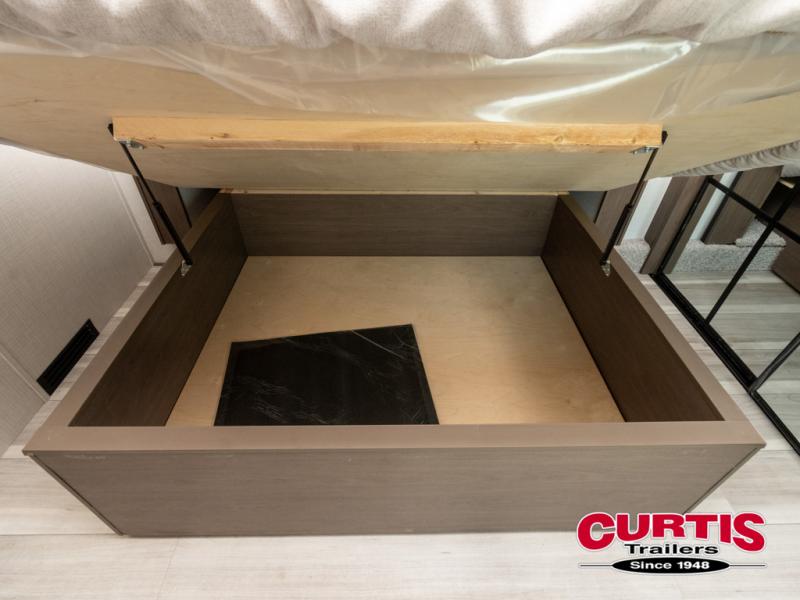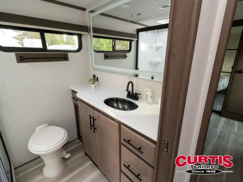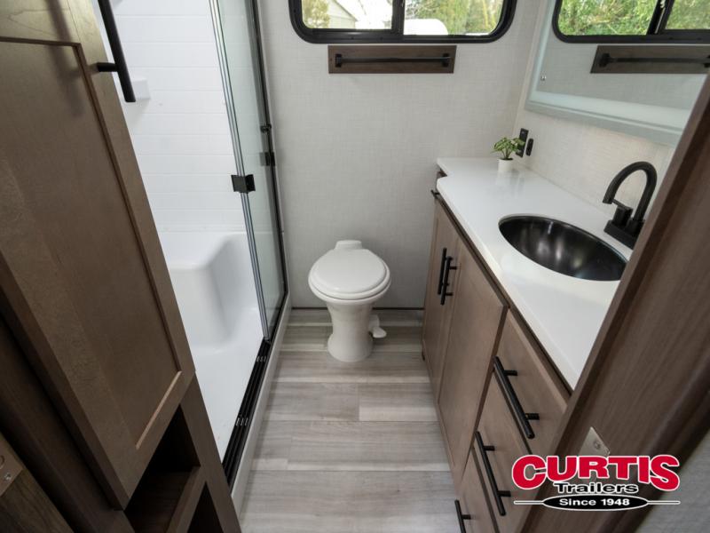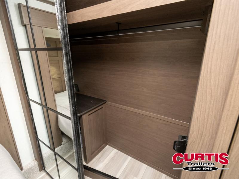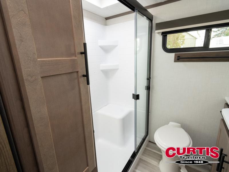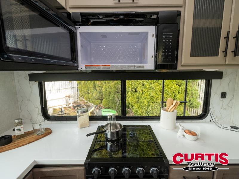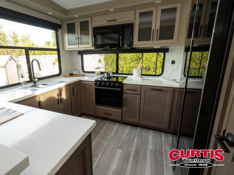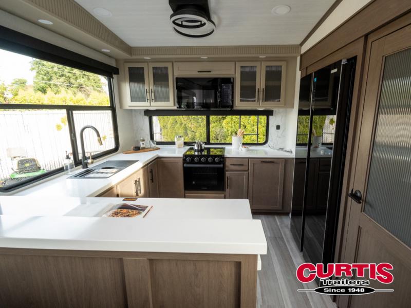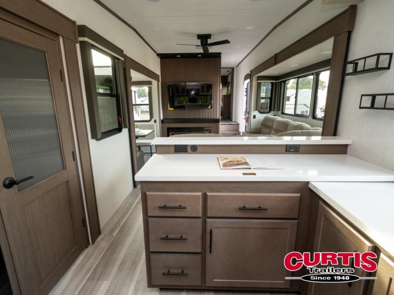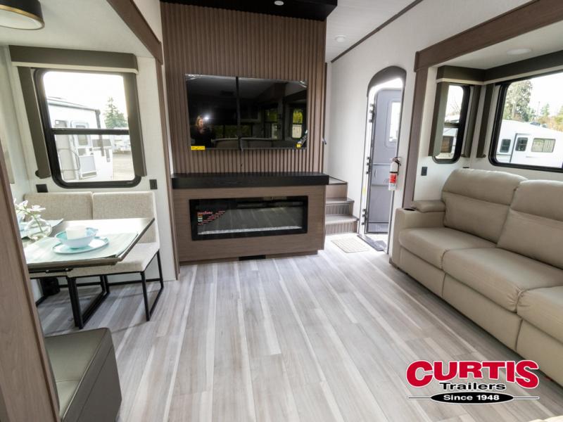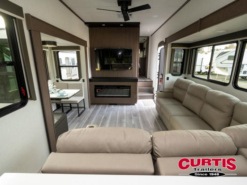 Luxury is the name of the game with this spacious fifth wheel! The chef of your group will love the rear luxury kitchen with wrap-around counter space, a large sink, dishwasher prep, and all the appliances needed to cook and store meals. After dinner, your crew can relax in the middle living room on the L-shaped sofa or play a game at the dinette with bench seating on one side and chairs on the other. There is also a 12V ceiling fan here, along with a fireplace and a TV for movie nights! The spacious full bath includes a shower with a seat plus a large vanity counter to easily get ready each day, and you're going to love the front private bedroom with a queen bed slide out. There is also a full height wardrobe here, along with a pull-out laundry center, underbed storage, plus stackable washer and dryer prep!