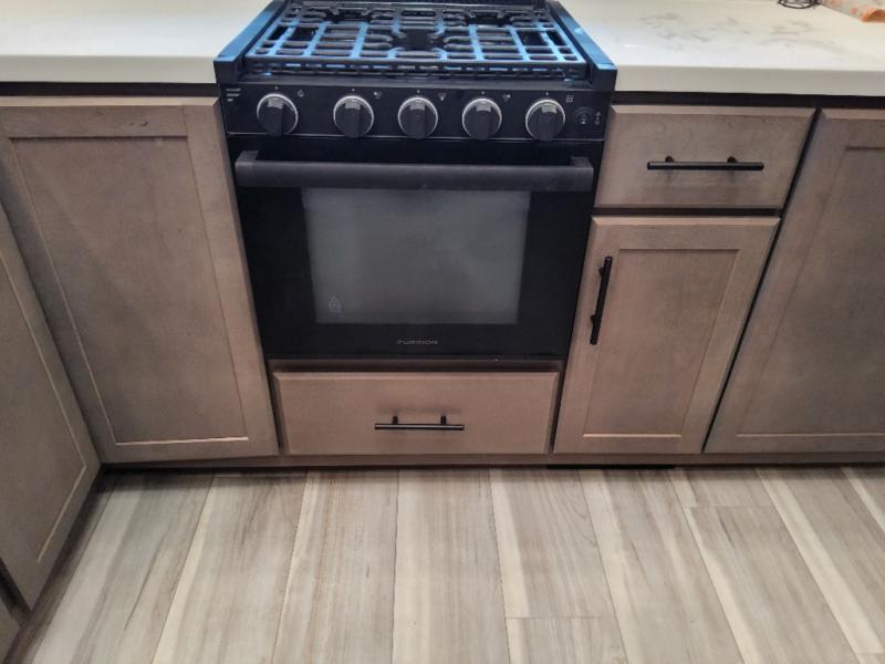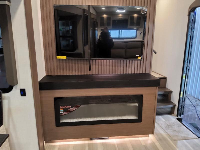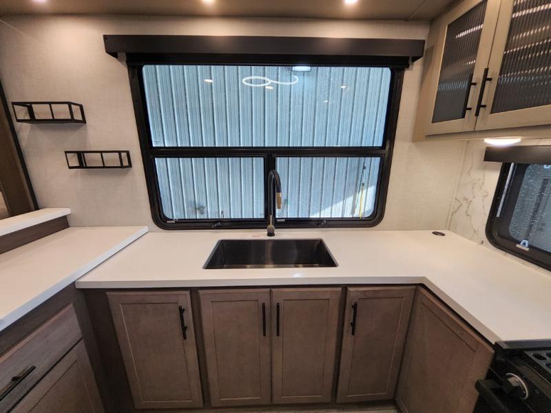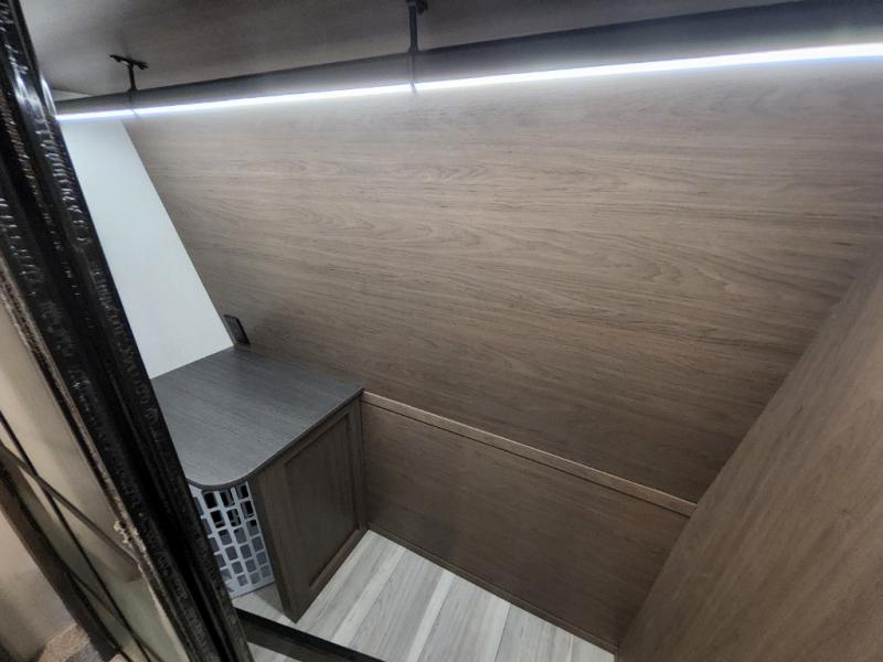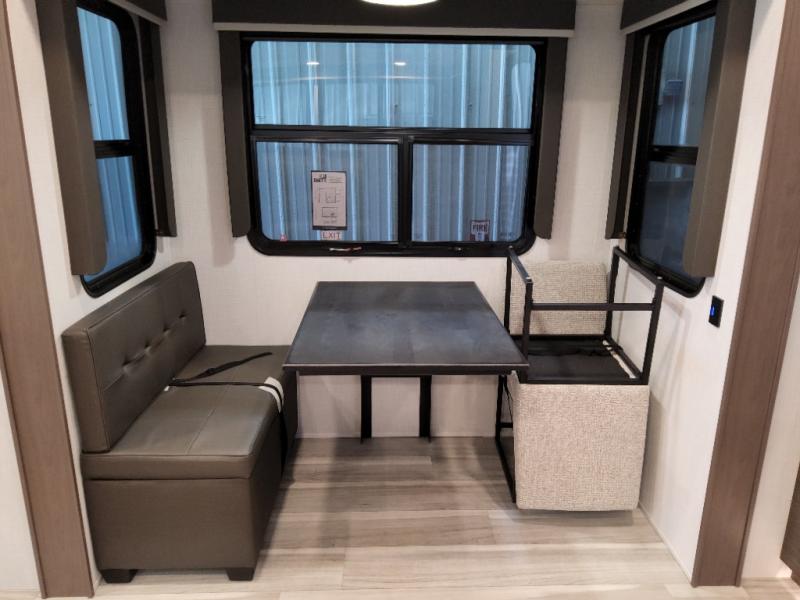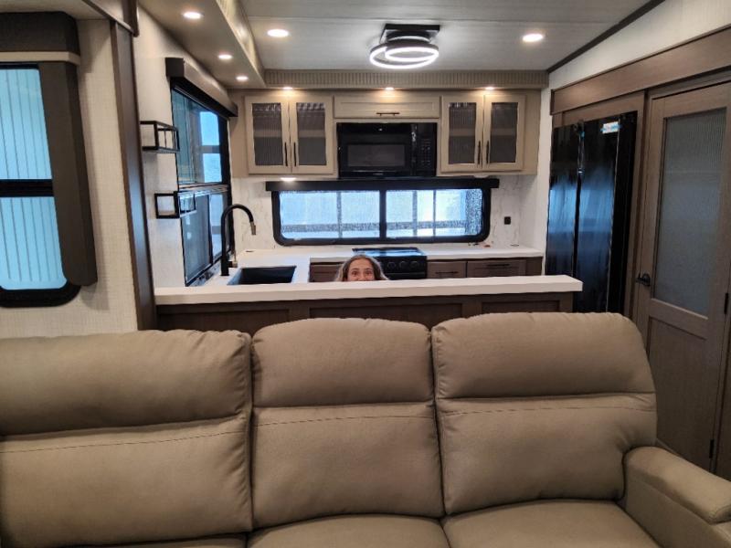 Luxury is the name of the game with this spacious fifth wheel! The chef of your group will love the rear luxury kitchen with wrap-around counter space, a large sink, dishwasher prep, and all the appliances needed to cook and store meals. After dinner, your crew can relax in the middle living room on the L-shaped sofa or play a game at the dinette with bench seating on one side and chairs on the other. There is also a 12V ceiling fan here, along with a fireplace and a TV for movie nights! The spacious full bath includes a shower with a seat plus a large vanity counter to easily get ready each day, and you're going to love the front private bedroom with a queen bed slide out. There is also a full height wardrobe here, along with a pull-out laundry center, underbed storage, plus stackable washer and dryer prep!