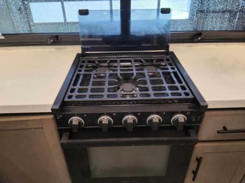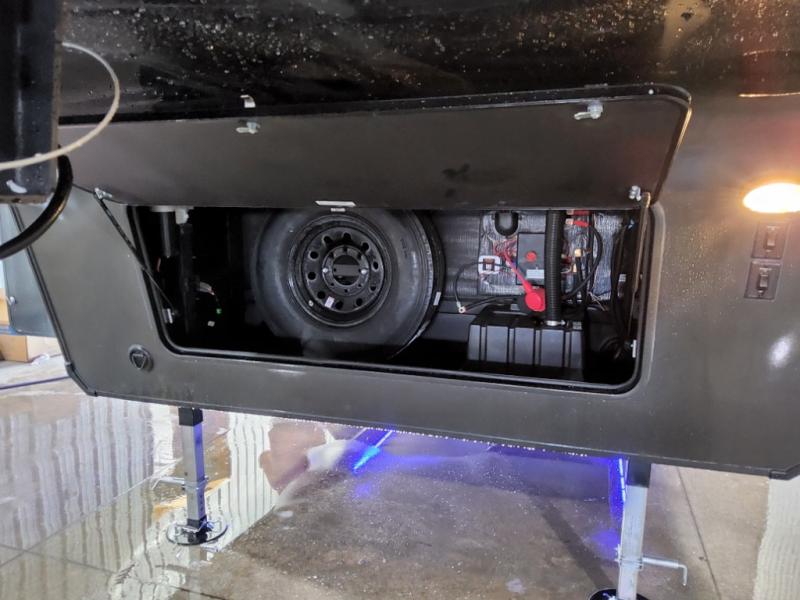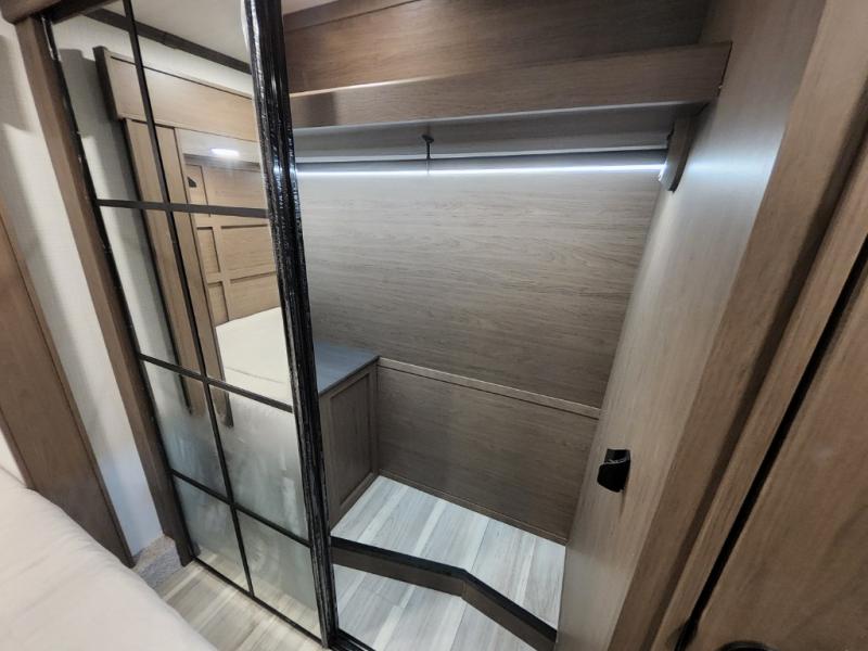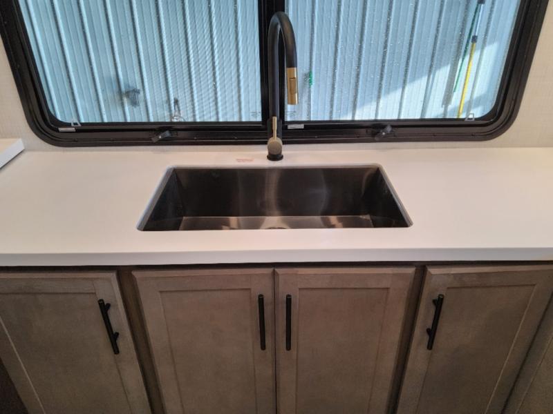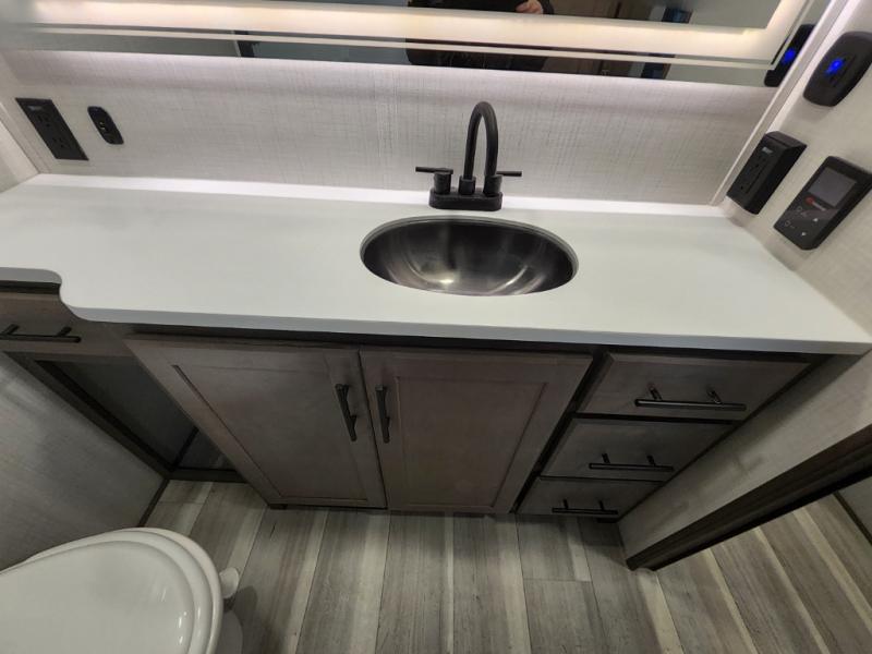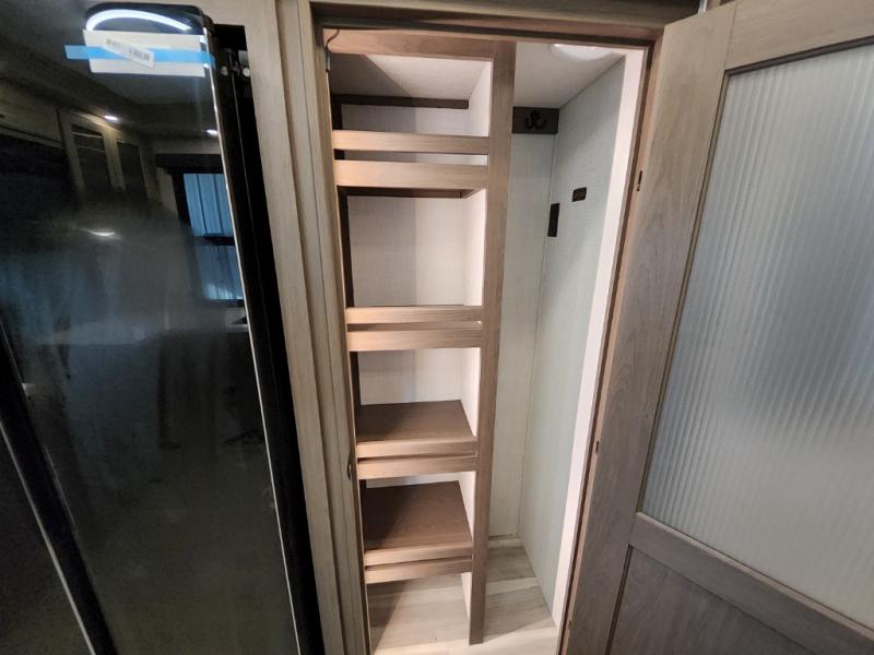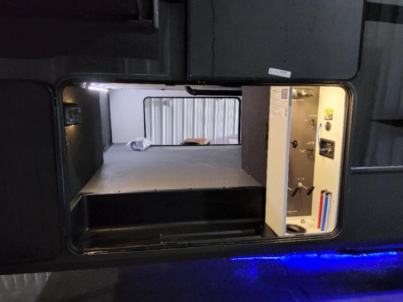 Luxury is the name of the game with this spacious fifth wheel! The chef of your group will love the rear luxury kitchen with wrap-around counter space, a large sink, dishwasher prep, and all the appliances needed to cook and store meals. After dinner, your crew can relax in the middle living room on the L-shaped sofa or play a game at the dinette with bench seating on one side and chairs on the other. There is also a 12V ceiling fan here, along with a fireplace and a TV for movie nights! The spacious full bath includes a shower with a seat plus a large vanity counter to easily get ready each day, and you're going to love the front private bedroom with a queen bed slide out. There is also a full height wardrobe here, along with a pull-out laundry center, underbed storage, plus stackable washer and dryer prep!