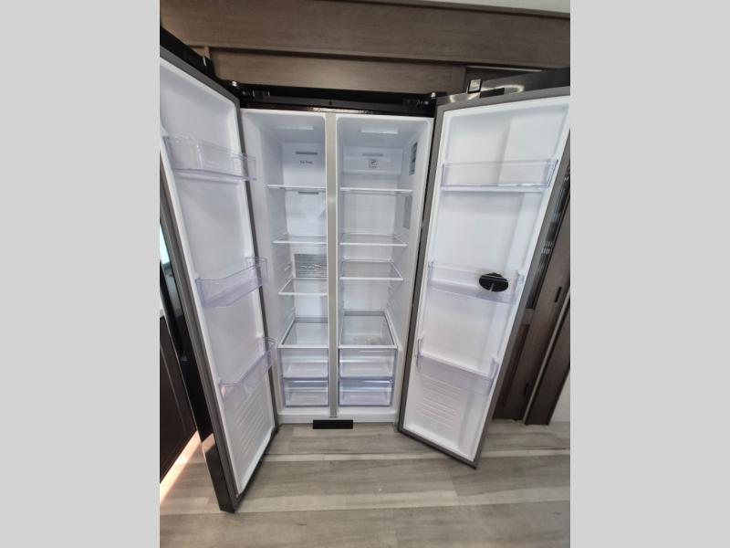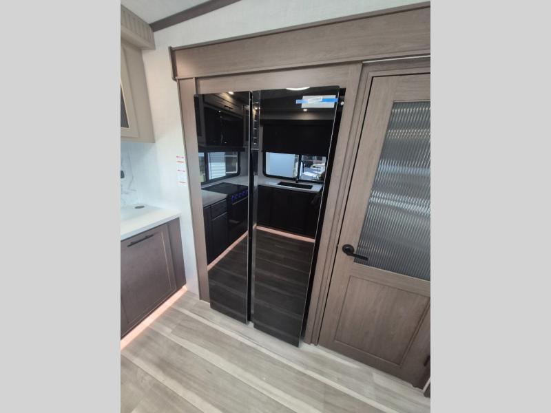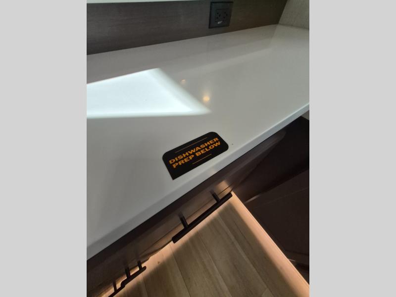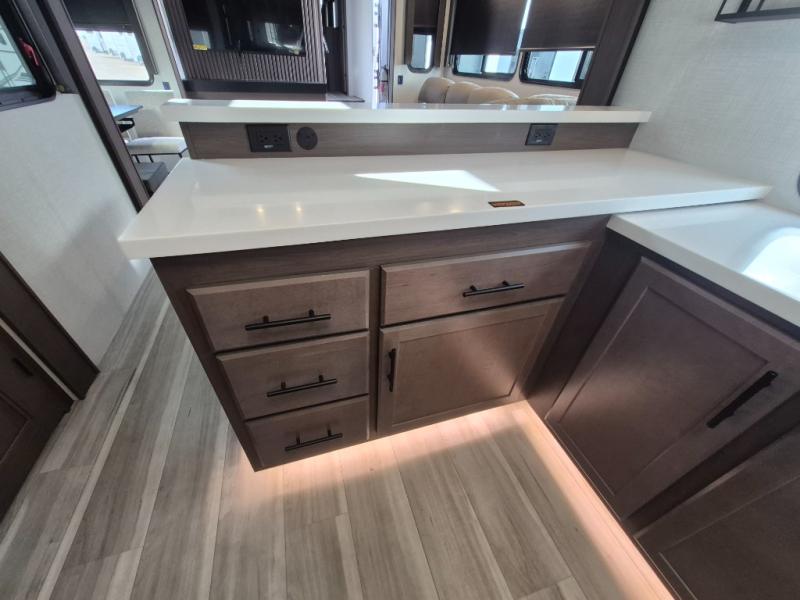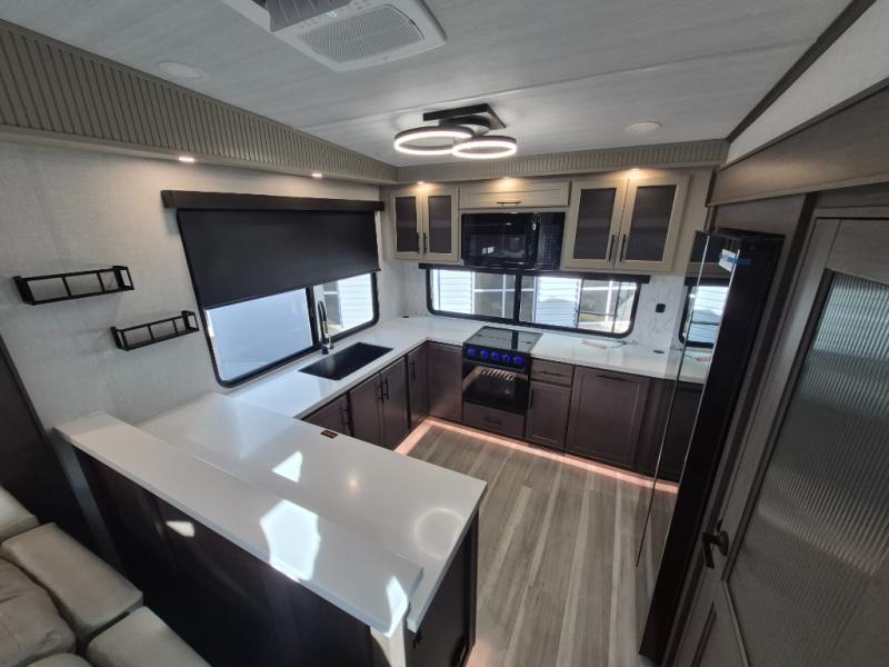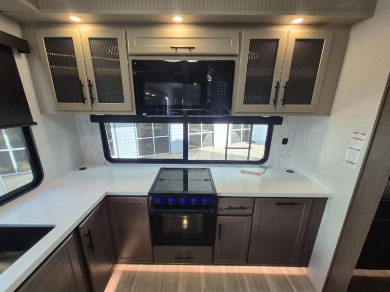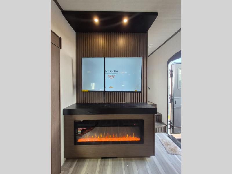 Luxury is the name of the game with this spacious fifth wheel! The chef of your group will love the rear luxury kitchen with wrap-around counter space, a large sink, dishwasher prep, and all the appliances needed to cook and store meals. After dinner, your crew can relax in the middle living room on the L-shaped sofa or play a game at the dinette with bench seating on one side and chairs on the other. There is also a 12V ceiling fan here, along with a fireplace and a TV for movie nights! The spacious full bath includes a shower with a seat plus a large vanity counter to easily get ready each day, and you're going to love the front private bedroom with a queen bed slide out. There is also a full height wardrobe here, along with a pull-out laundry center, underbed storage, plus stackable washer and dryer prep!