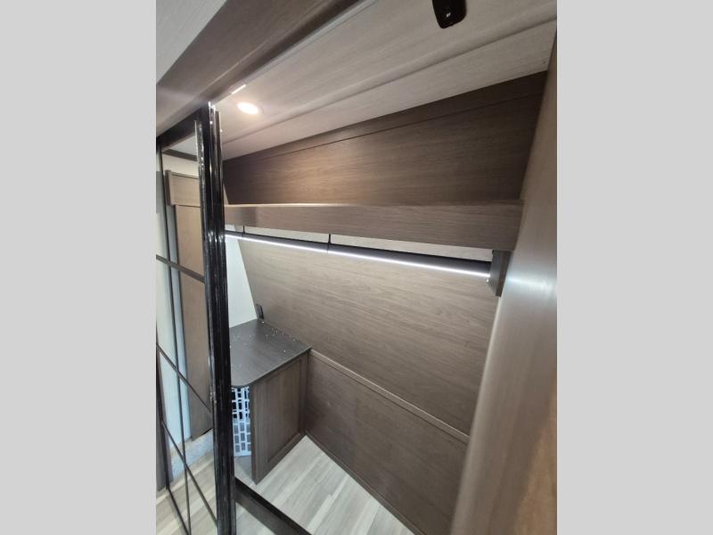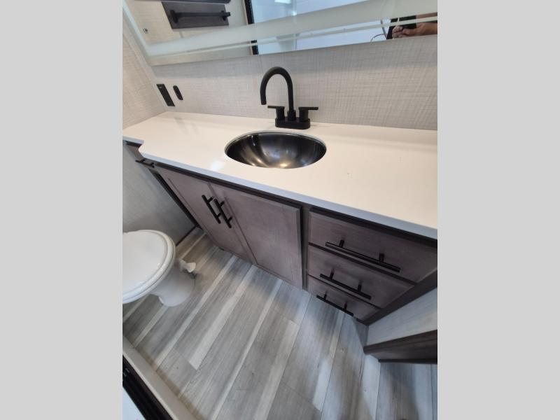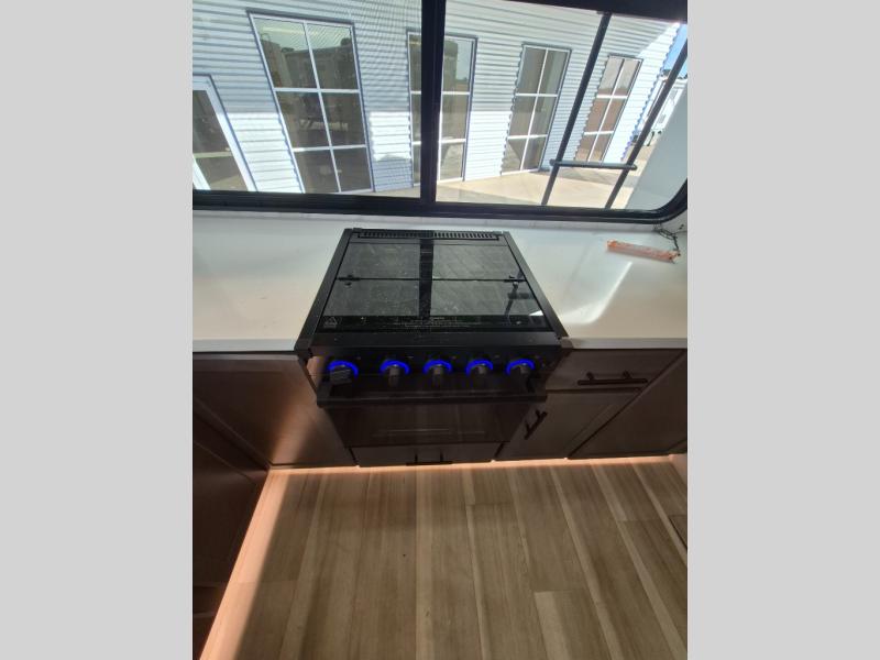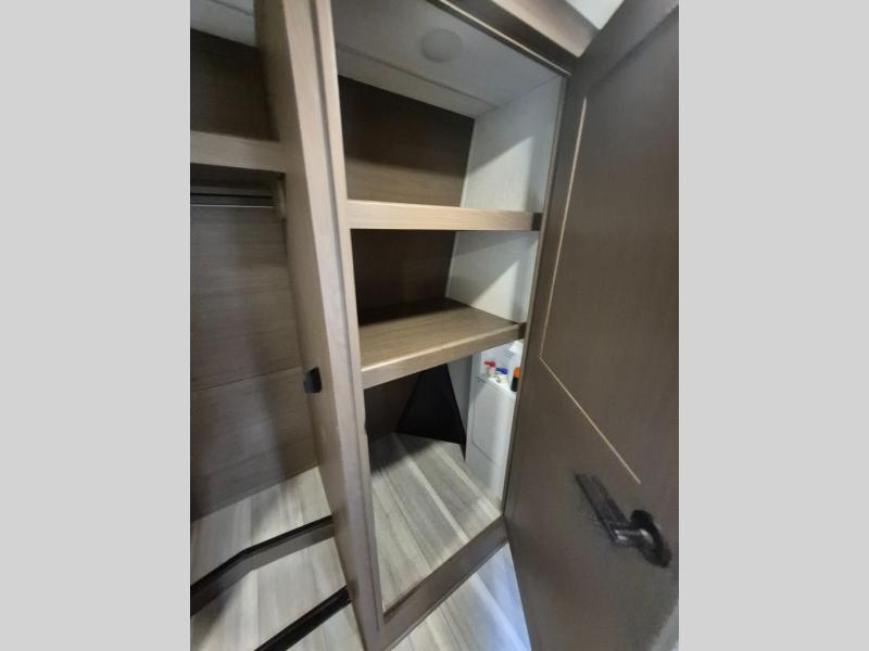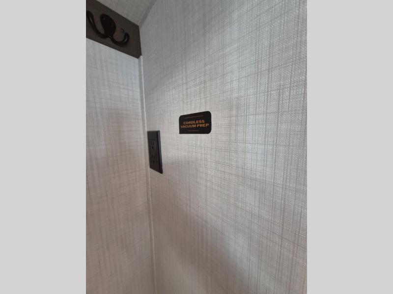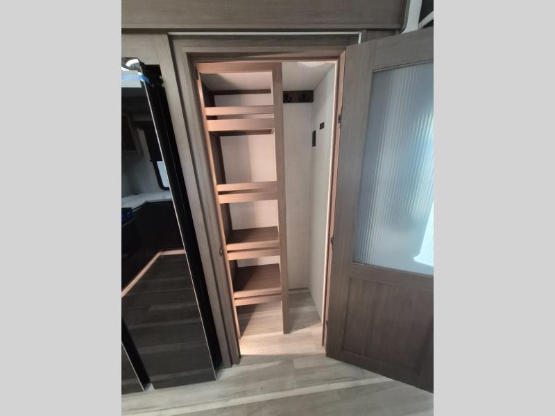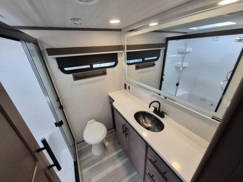 Luxury is the name of the game with this spacious fifth wheel! The chef of your group will love the rear luxury kitchen with wrap-around counter space, a large sink, dishwasher prep, and all the appliances needed to cook and store meals. After dinner, your crew can relax in the middle living room on the L-shaped sofa or play a game at the dinette with bench seating on one side and chairs on the other. There is also a 12V ceiling fan here, along with a fireplace and a TV for movie nights! The spacious full bath includes a shower with a seat plus a large vanity counter to easily get ready each day, and you're going to love the front private bedroom with a queen bed slide out. There is also a full height wardrobe here, along with a pull-out laundry center, underbed storage, plus stackable washer and dryer prep!