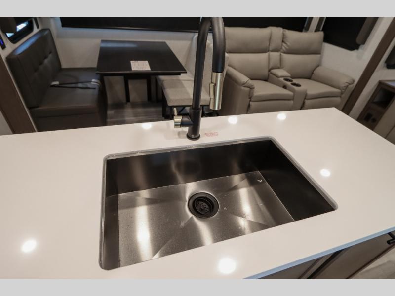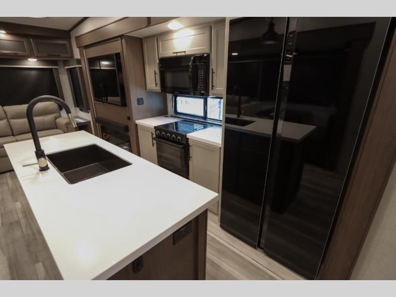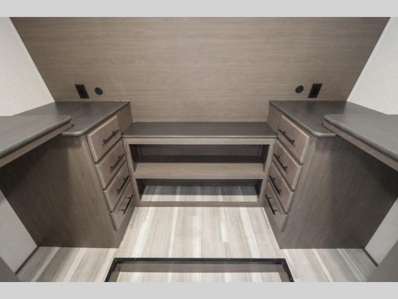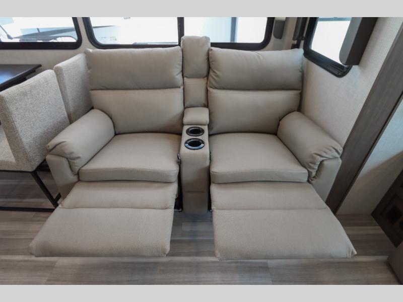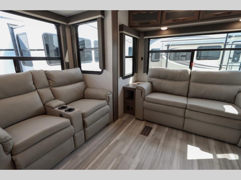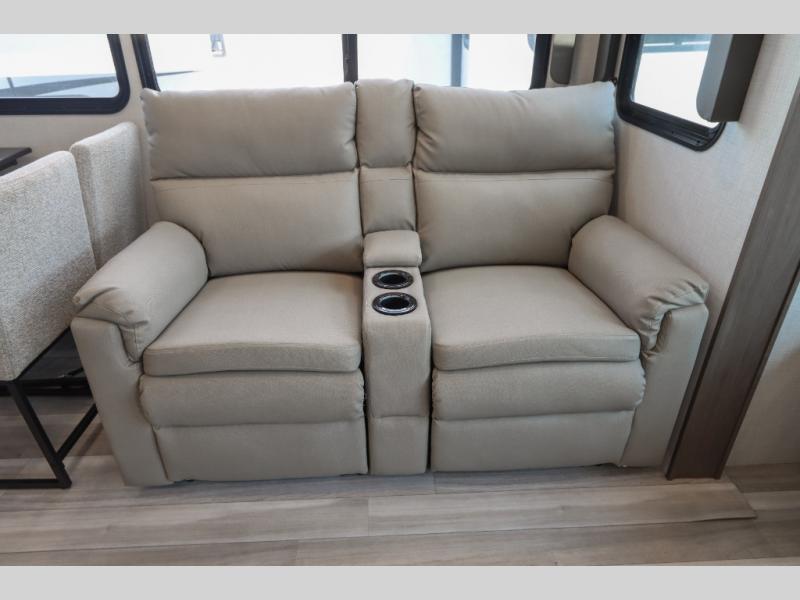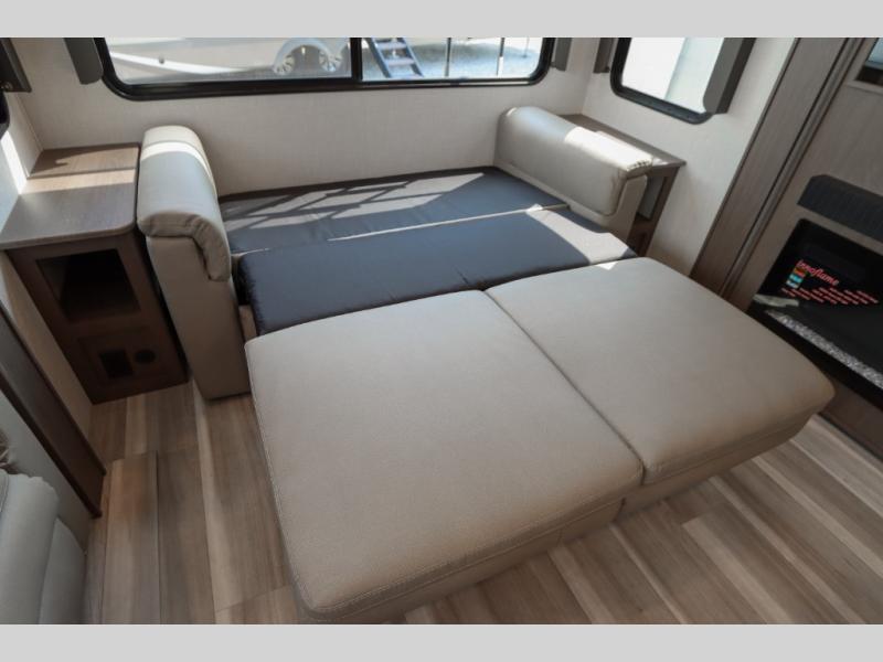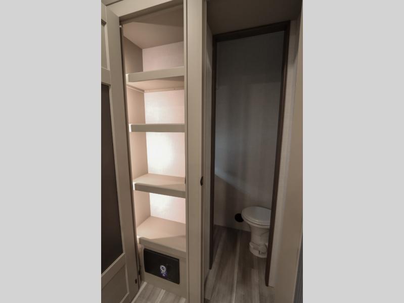 You will be so excited to take this Cougar fifth wheel out for the first time! Because of its secluded and fully stocked master suite at the front, this unit is perfect for a couple who wants to see the country or visit family. The master bathroom has a wonderful walk-in closet that has shoe storage, drawers, and preparations for a washer/dryer. There is also under-bed storage in the bedroom portion, and the queen bed slide gives you a little more space to get to the dresser and linen closet. The half bathroom is located out in the main living area so that your friends will have a place to go when they visit. Opposing slides keep this living area open for lounging comfortably on the tri-fold sleeper sofa and theater seating, and you can get everyone together for a board game at the free-standing dinette with an ottoman. There is also a pivoting entertainment door with a hidden pantry and cordless vacuum prep behind; how convenient!