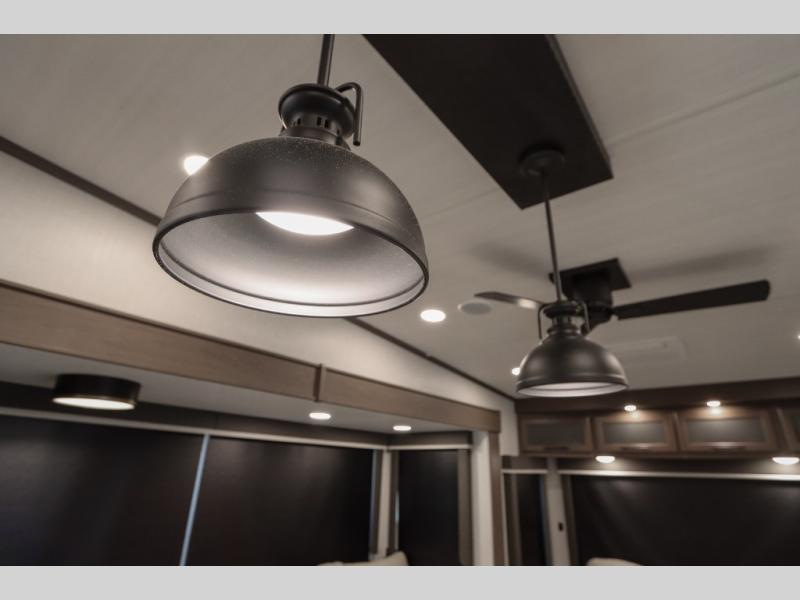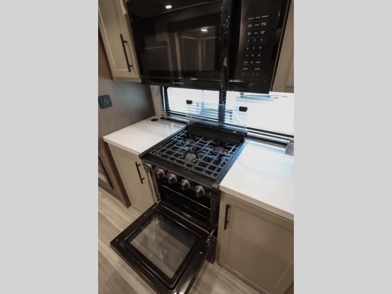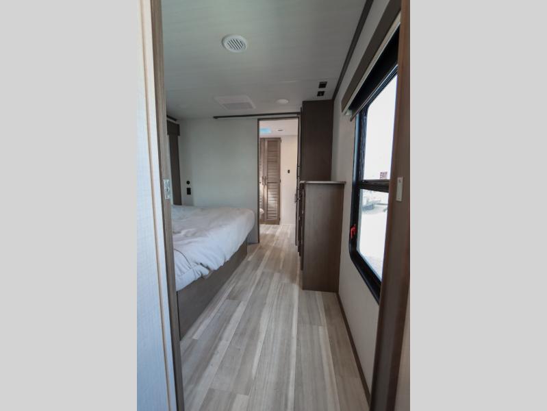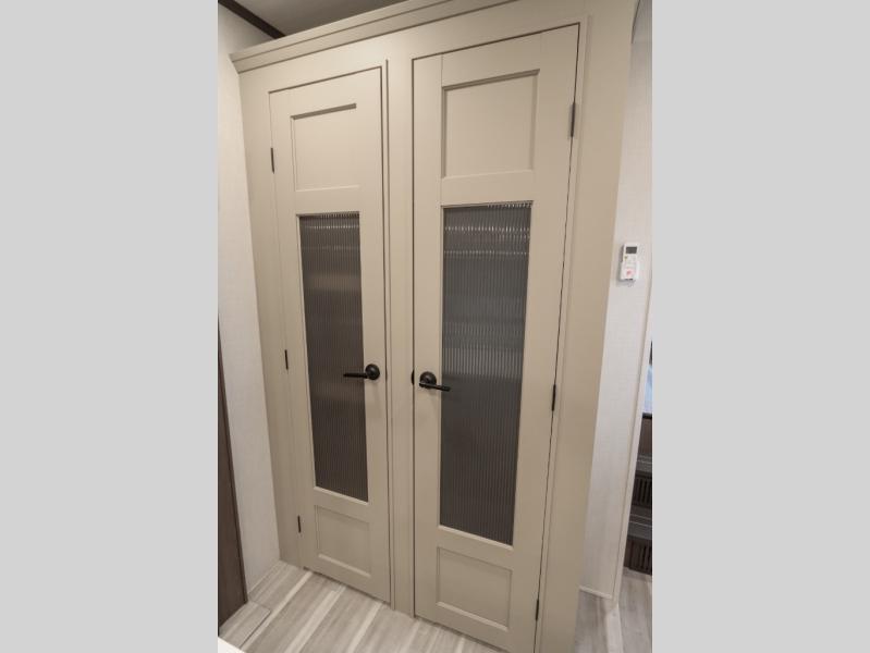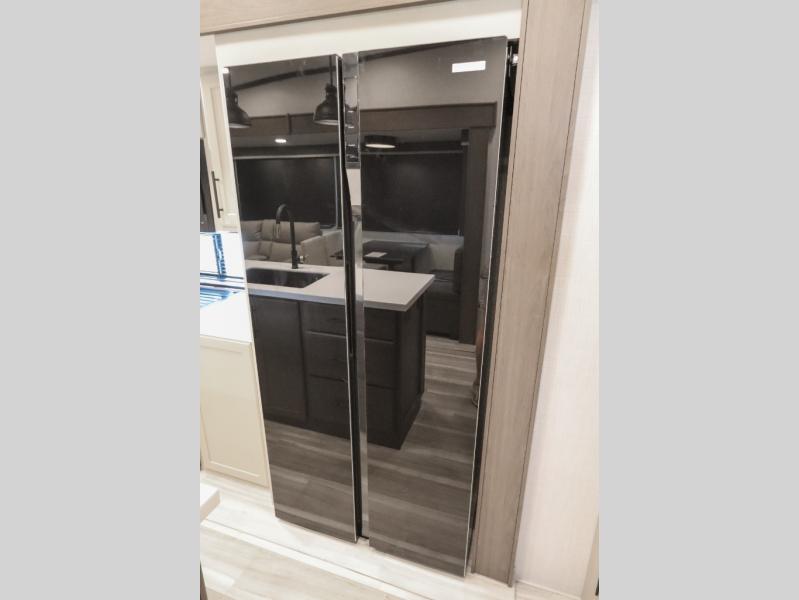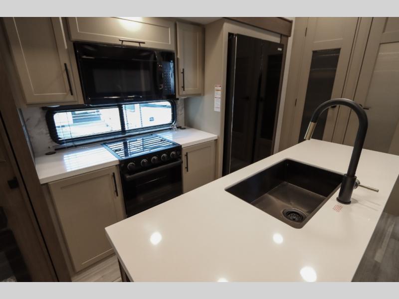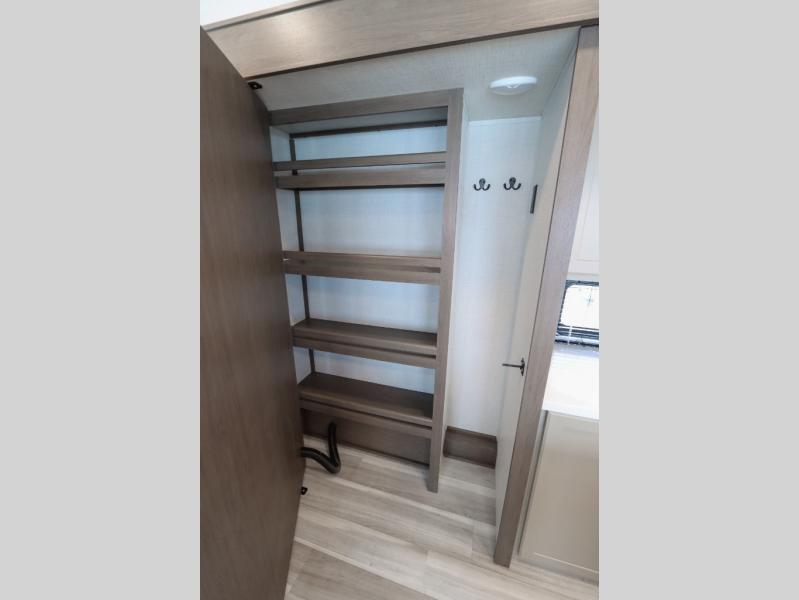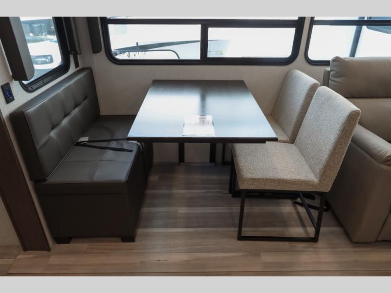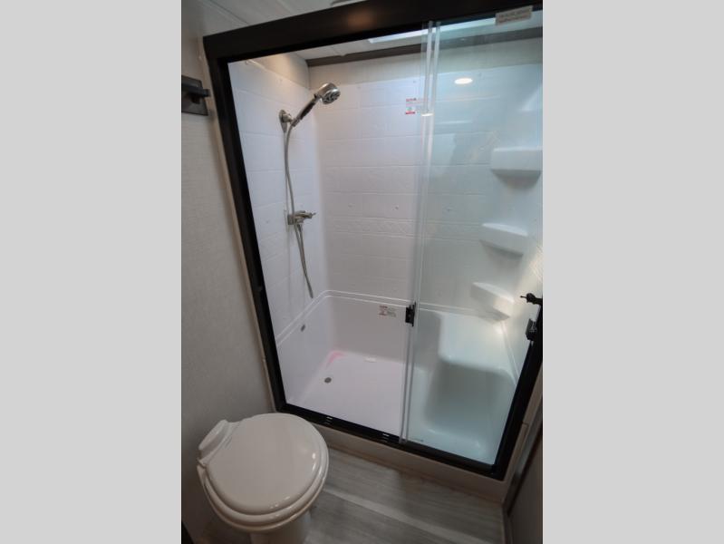 You will be so excited to take this Cougar fifth wheel out for the first time! Because of its secluded and fully stocked master suite at the front, this unit is perfect for a couple who wants to see the country or visit family. The master bathroom has a wonderful walk-in closet that has shoe storage, drawers, and preparations for a washer/dryer. There is also under-bed storage in the bedroom portion, and the queen bed slide gives you a little more space to get to the dresser and linen closet. The half bathroom is located out in the main living area so that your friends will have a place to go when they visit. Opposing slides keep this living area open for lounging comfortably on the tri-fold sleeper sofa and theater seating, and you can get everyone together for a board game at the free-standing dinette with an ottoman. There is also a pivoting entertainment door with a hidden pantry and cordless vacuum prep behind; how convenient!