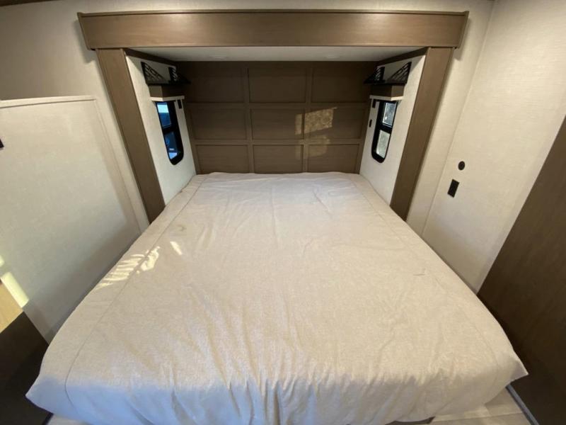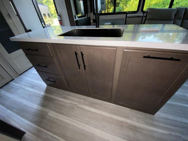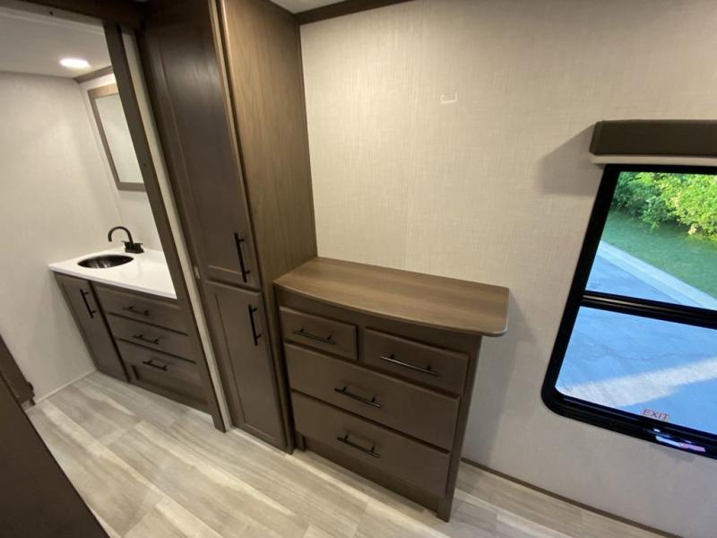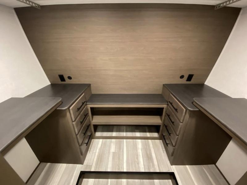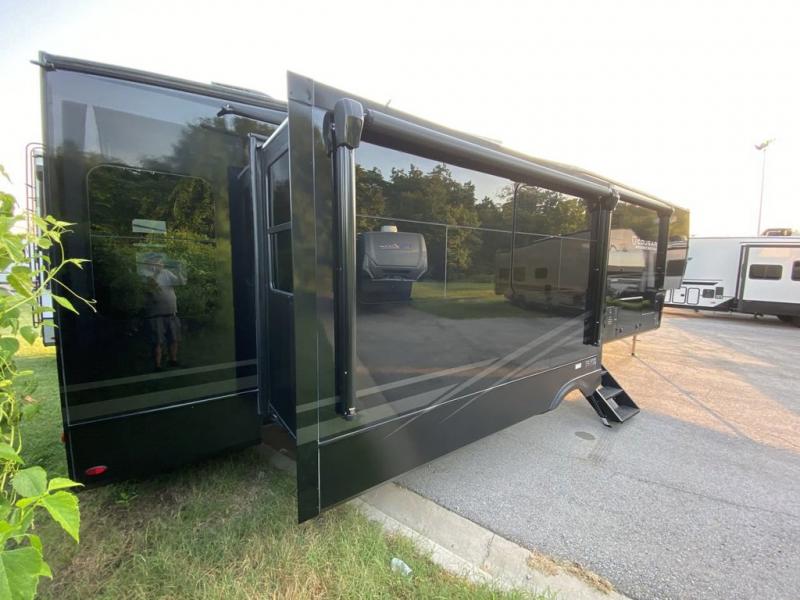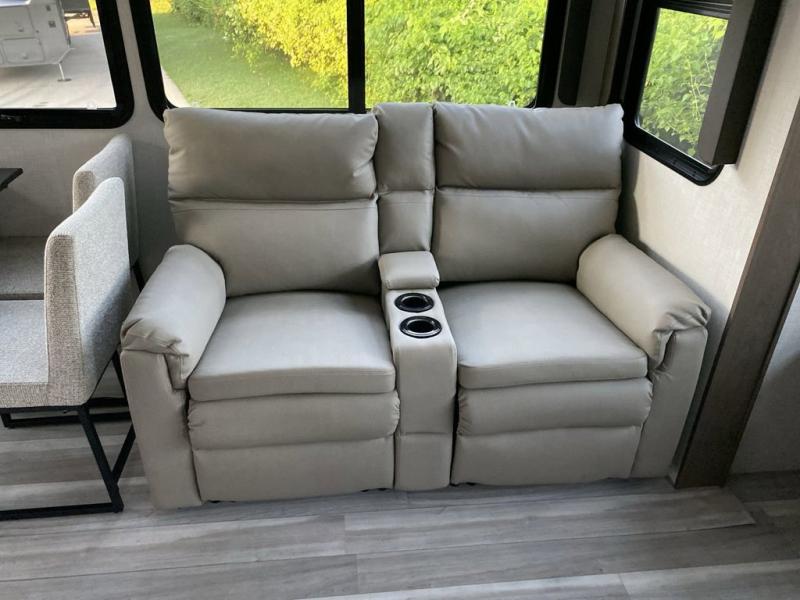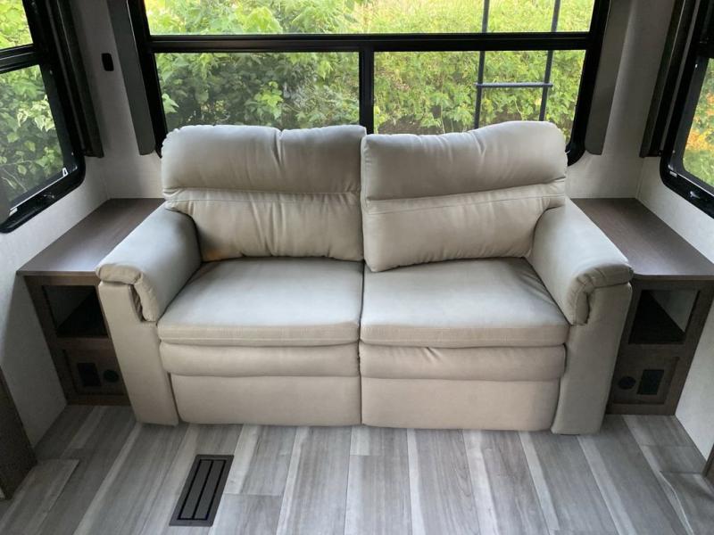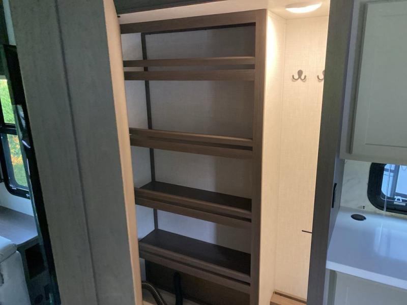 You will be so excited to take this Cougar fifth wheel out for the first time! Because of its secluded and fully stocked master suite at the front, this unit is perfect for a couple who wants to see the country or visit family. The master bathroom has a wonderful walk-in closet that has shoe storage, drawers, and preparations for a washer/dryer. There is also under-bed storage in the bedroom portion, and the queen bed slide gives you a little more space to get to the dresser and linen closet. The half bathroom is located out in the main living area so that your friends will have a place to go when they visit. Opposing slides keep this living area open for lounging comfortably on the tri-fold sleeper sofa and theater seating, and you can get everyone together for a board game at the free-standing dinette with an ottoman. There is also a pivoting entertainment door with a hidden pantry and cordless vacuum prep behind; how convenient!