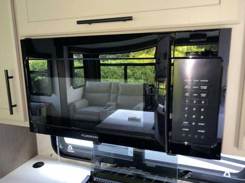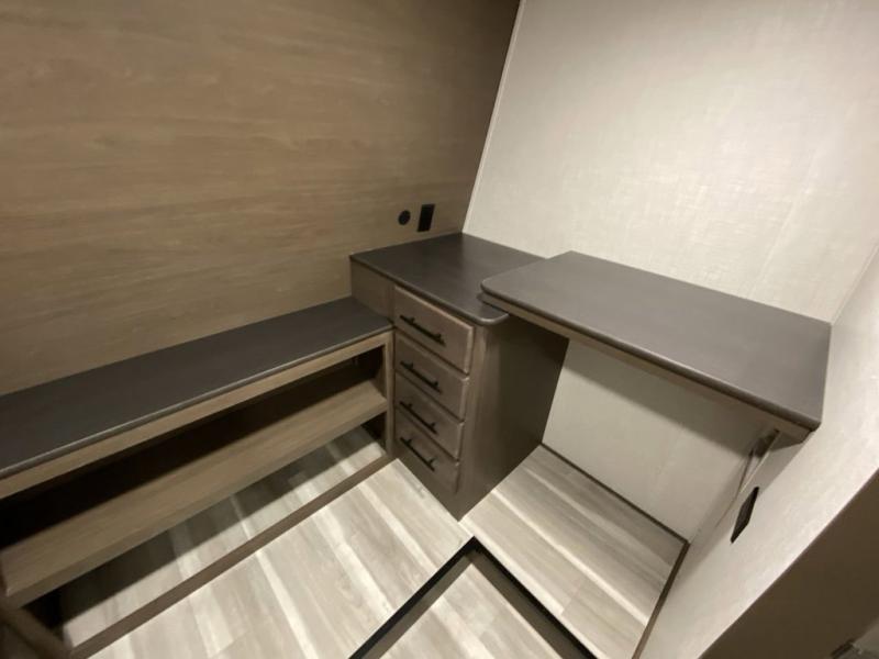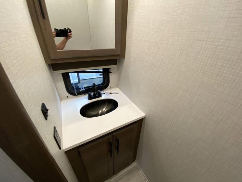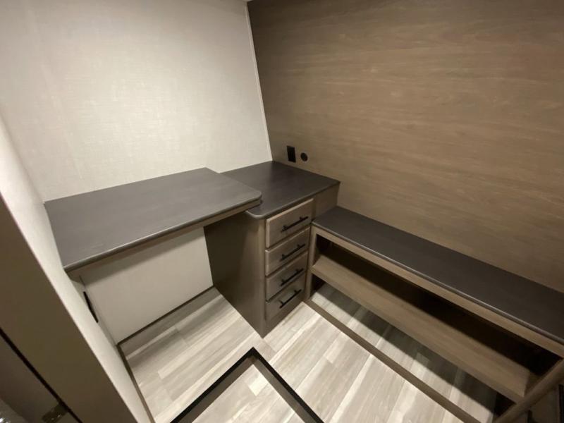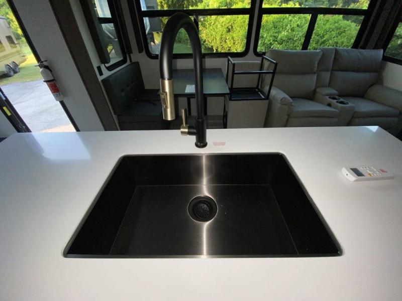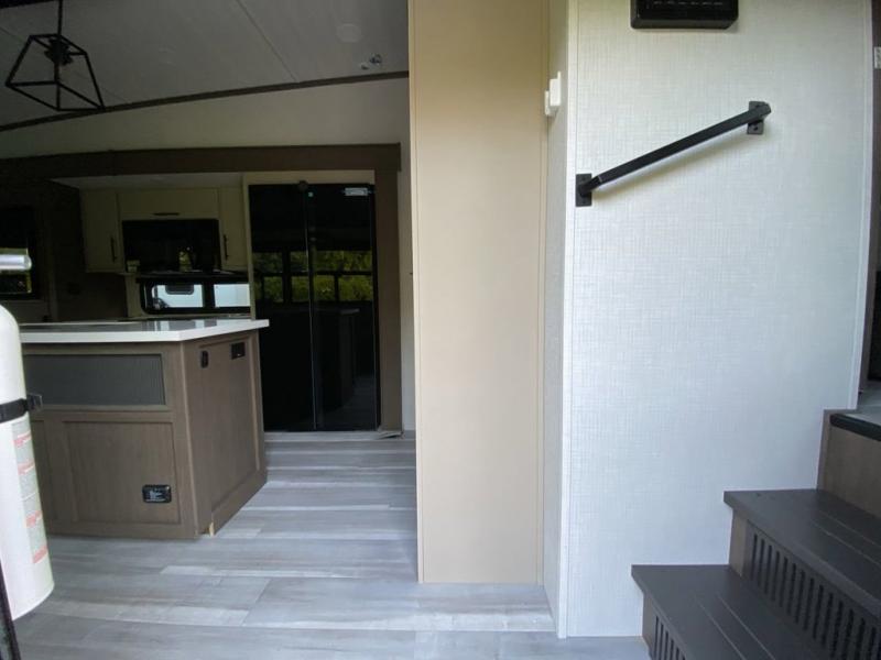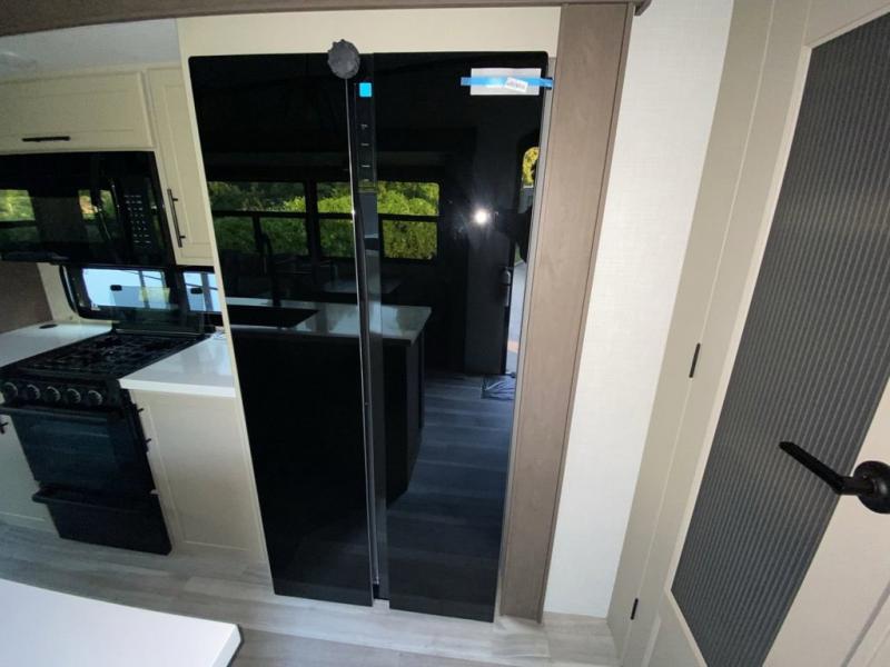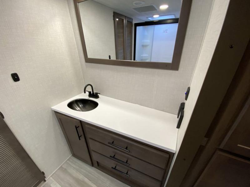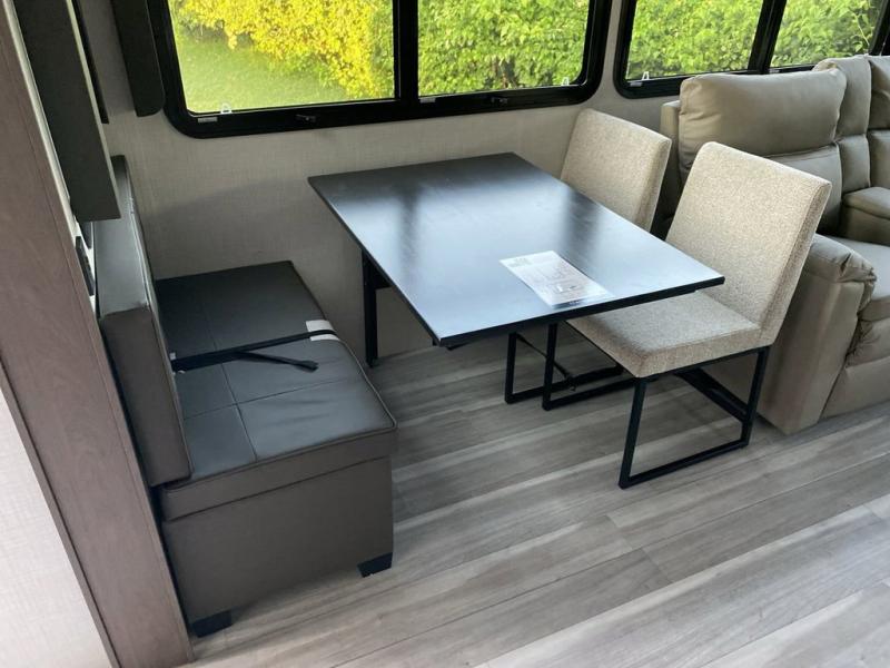 You will be so excited to take this Cougar fifth wheel out for the first time! Because of its secluded and fully stocked master suite at the front, this unit is perfect for a couple who wants to see the country or visit family. The master bathroom has a wonderful walk-in closet that has shoe storage, drawers, and preparations for a washer/dryer. There is also under-bed storage in the bedroom portion, and the queen bed slide gives you a little more space to get to the dresser and linen closet. The half bathroom is located out in the main living area so that your friends will have a place to go when they visit. Opposing slides keep this living area open for lounging comfortably on the tri-fold sleeper sofa and theater seating, and you can get everyone together for a board game at the free-standing dinette with an ottoman. There is also a pivoting entertainment door with a hidden pantry and cordless vacuum prep behind; how convenient!