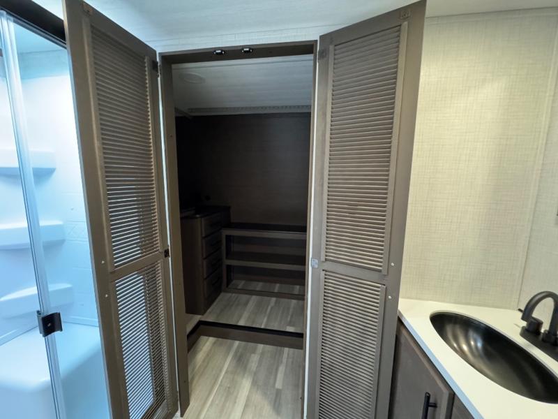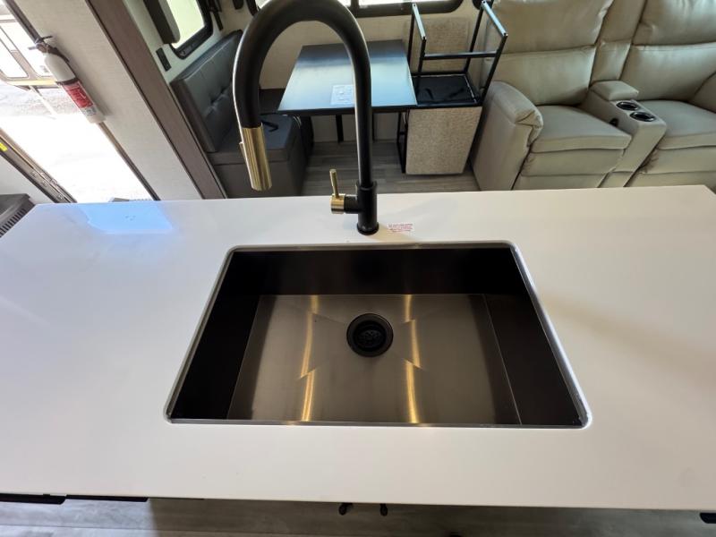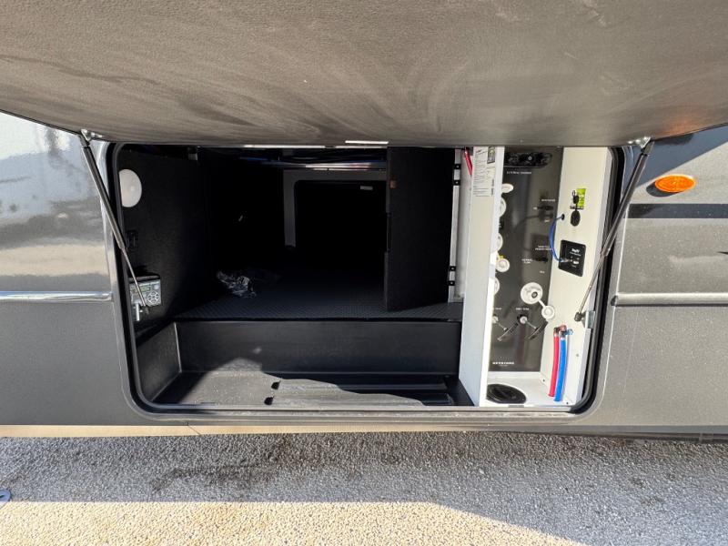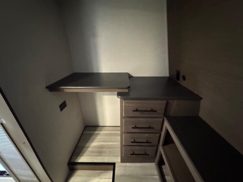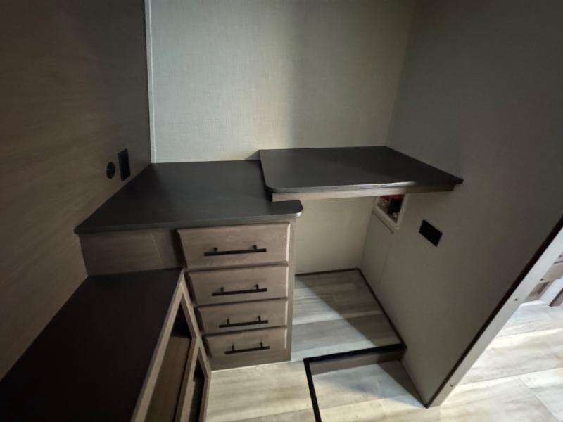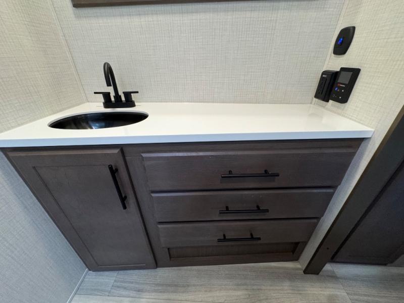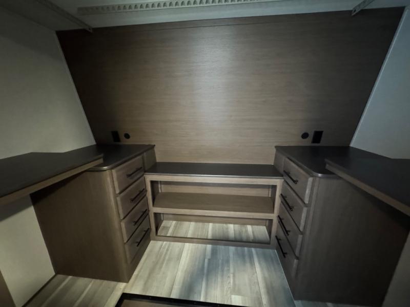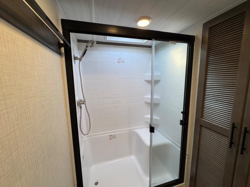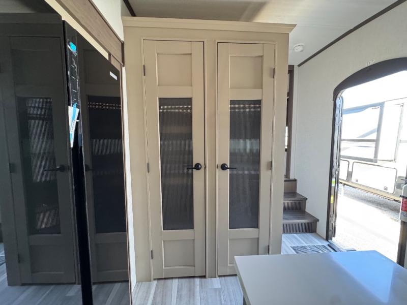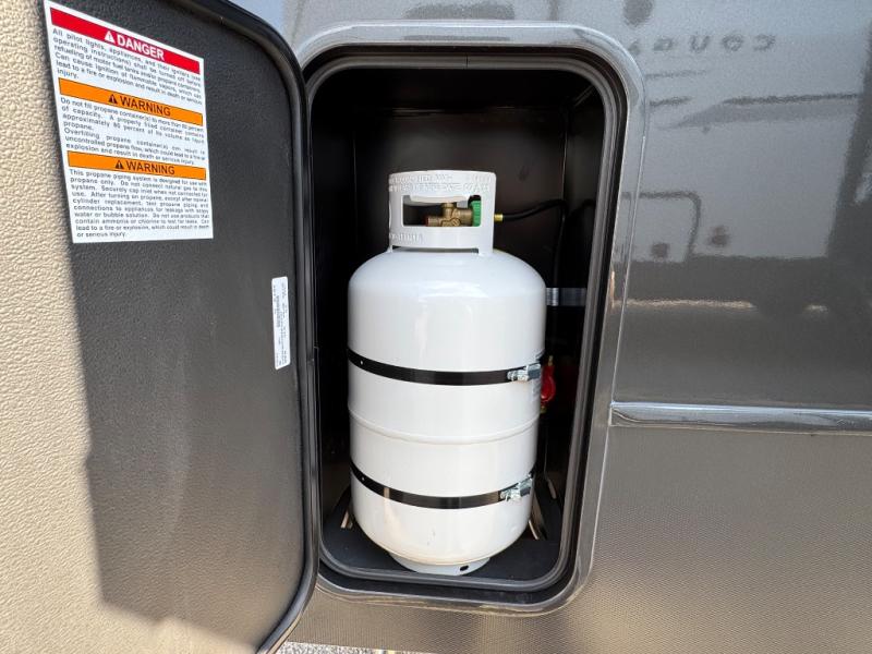 You will be so excited to take this Cougar fifth wheel out for the first time! Because of its secluded and fully stocked master suite at the front, this unit is perfect for a couple who wants to see the country or visit family. The master bathroom has a wonderful walk-in closet that has shoe storage, drawers, and preparations for a washer/dryer. There is also under-bed storage in the bedroom portion, and the queen bed slide gives you a little more space to get to the dresser and linen closet. The half bathroom is located out in the main living area so that your friends will have a place to go when they visit. Opposing slides keep this living area open for lounging comfortably on the tri-fold sleeper sofa and theater seating, and you can get everyone together for a board game at the booth dinette with storage drawers. There is also a pivoting entertainment door with a hidden pantry and cordless vacuum prep behind; how convenient!
