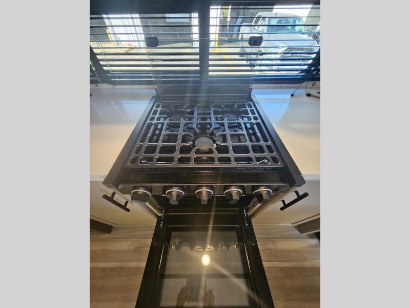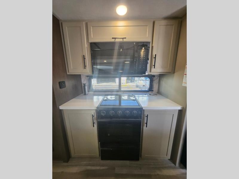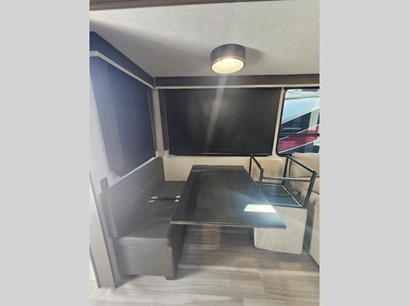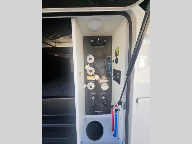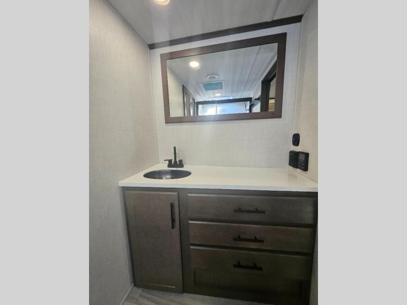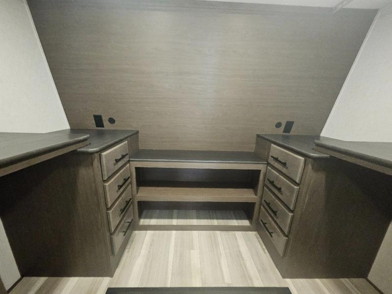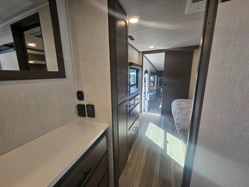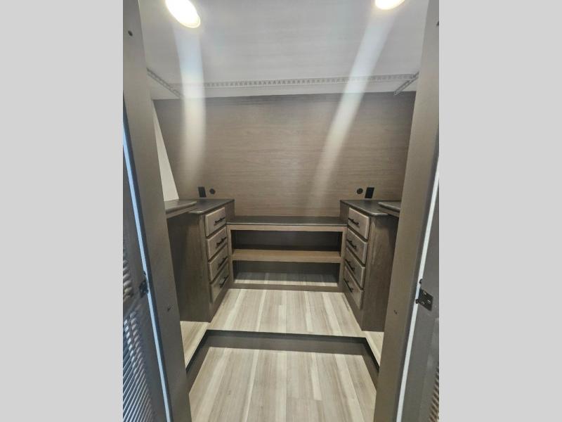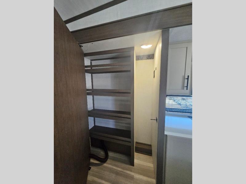 You will be so excited to take this Cougar fifth wheel out for the first time! Because of its secluded and fully stocked master suite at the front, this unit is perfect for a couple who wants to see the country or visit family. The master bathroom has a wonderful walk-in closet that has shoe storage, drawers, and preparations for a washer/dryer. There is also under-bed storage in the bedroom portion, and the queen bed slide gives you a little more space to get to the dresser and linen closet. The half bathroom is located out in the main living area so that your friends will have a place to go when they visit. Opposing slides keep this living area open for lounging comfortably on the tri-fold sleeper sofa and theater seating, and you can get everyone together for a board game at the booth dinette with storage drawers. There is also a pivoting entertainment door with a hidden pantry and cordless vacuum prep behind; how convenient!