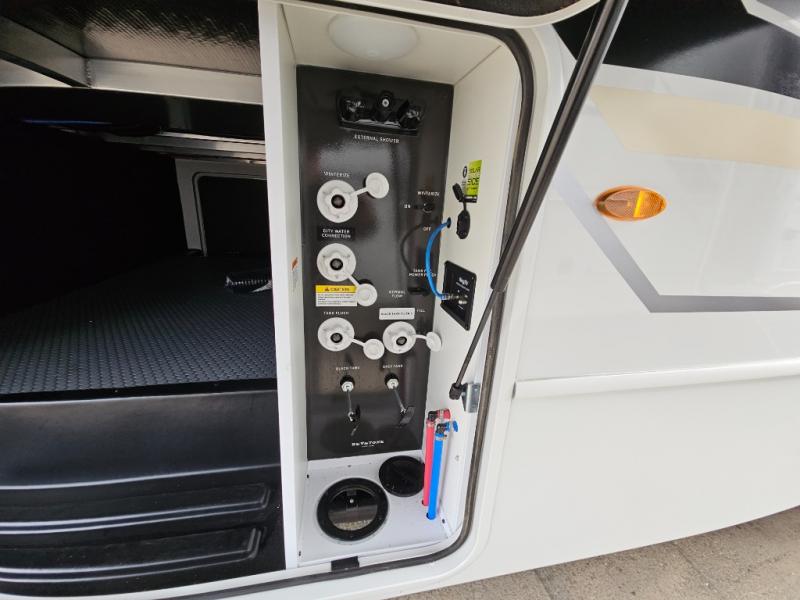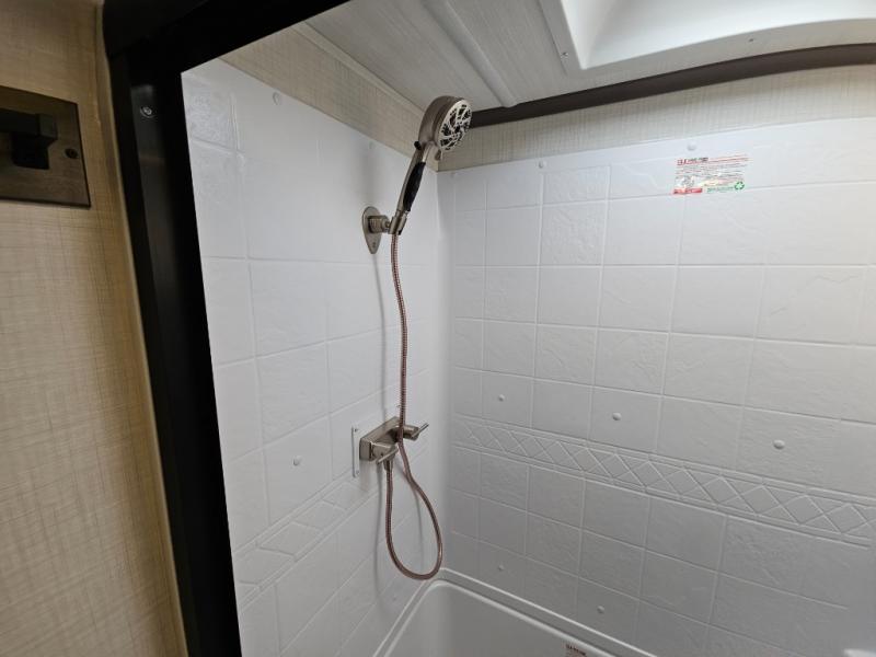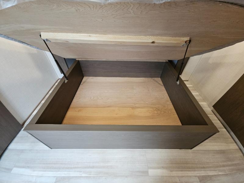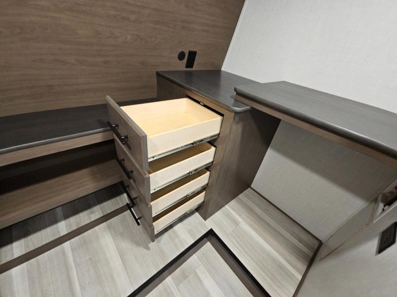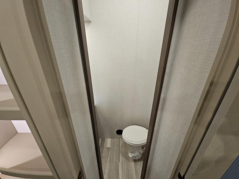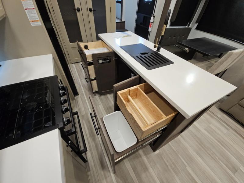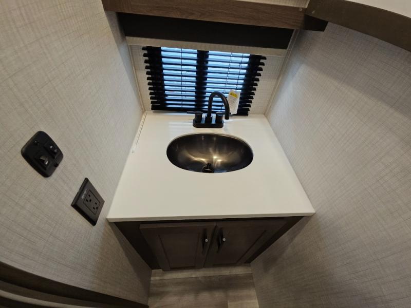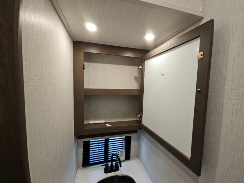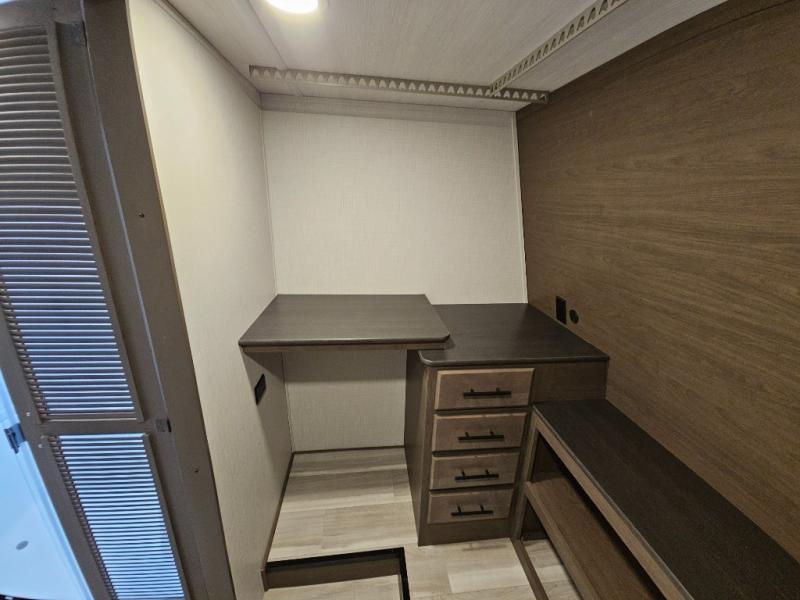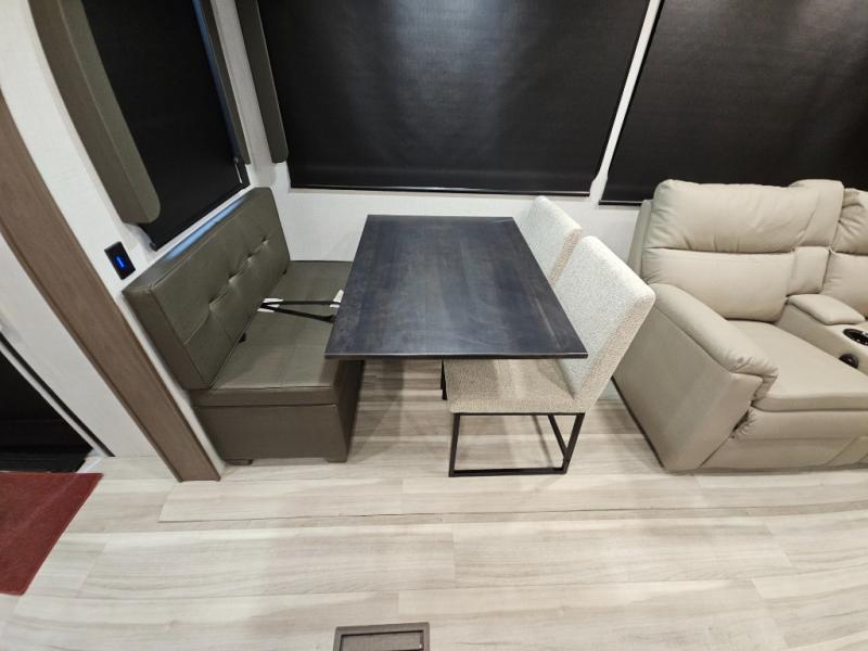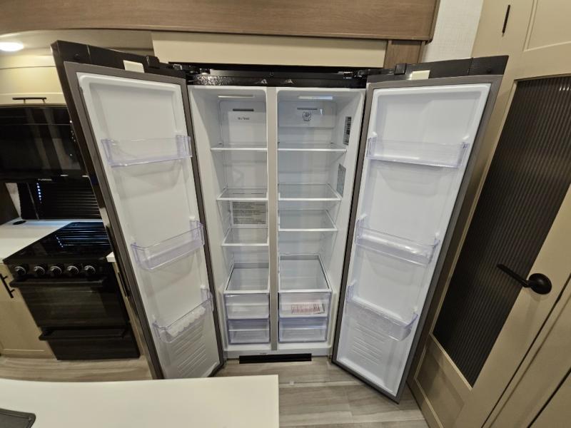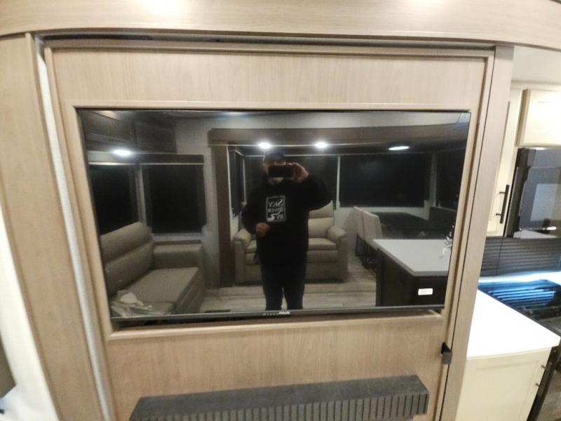 You will be so excited to take this Cougar fifth wheel out for the first time! Because of its secluded and fully stocked master suite at the front, this unit is perfect for a couple who wants to see the country or visit family. The master bathroom has a wonderful walk-in closet that has shoe storage, drawers, and preparations for a washer/dryer. There is also under-bed storage in the bedroom portion, and the queen bed slide gives you a little more space to get to the dresser and linen closet. The half bathroom is located out in the main living area so that your friends will have a place to go when they visit. Opposing slides keep this living area open for lounging comfortably on the tri-fold sleeper sofa and theater seating, and you can get everyone together for a board game at the booth dinette with storage drawers. There is also a pivoting entertainment door with a hidden pantry and cordless vacuum prep behind; how convenient!