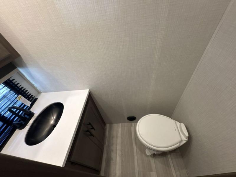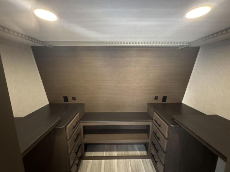 You will be so excited to take this Cougar fifth wheel out for the first time! Because of its secluded and fully stocked master suite at the front, this unit is perfect for a couple who wants to see the country or visit family. The master bathroom has a wonderful walk-in closet that has shoe storage, drawers, and preparations for a washer/dryer. There is also under-bed storage in the bedroom portion, and the queen bed slide gives you a little more space to get to the dresser and linen closet. The half bathroom is located out in the main living area so that your friends will have a place to go when they visit. Opposing slides keep this living area open for lounging comfortably on the tri-fold sleeper sofa and theater seating, and you can get everyone together for a board game at the booth dinette with storage drawers. There is also a pivoting entertainment door with a hidden pantry and cordless vacuum prep behind; how convenient!