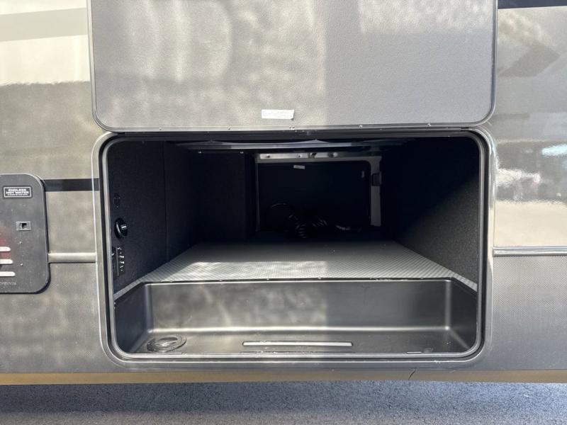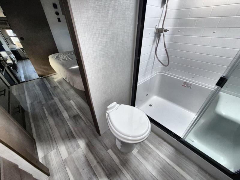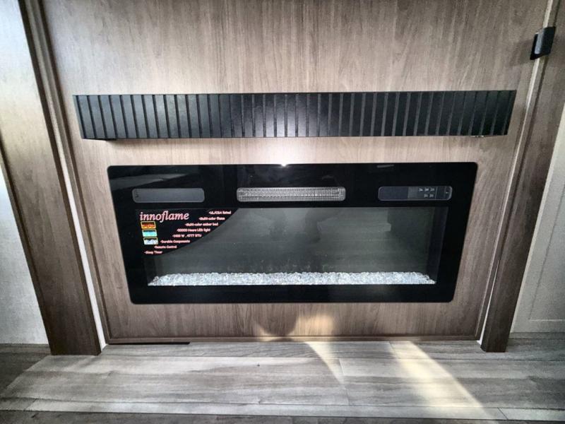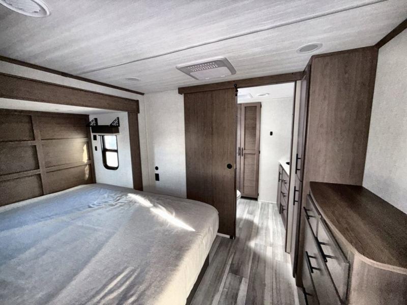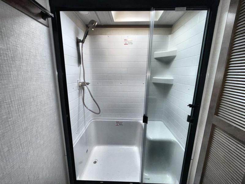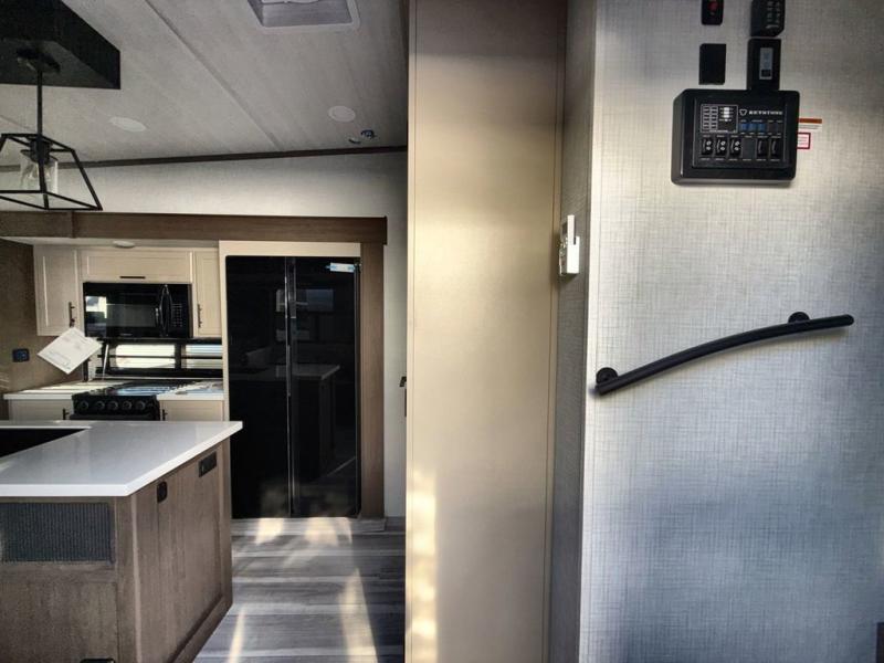 You will be so excited to take this Cougar fifth wheel out for the first time! Because of its secluded and fully stocked master suite at the front, this unit is perfect for a couple who wants to see the country or visit family. The master bathroom has a wonderful walk-in closet that has shoe storage, drawers, and preparations for a washer/dryer. There is also under-bed storage in the bedroom portion, and the queen bed slide gives you a little more space to get to the dresser and linen closet. The half bathroom is located out in the main living area so that your friends will have a place to go when they visit. Opposing slides keep this living area open for lounging comfortably on the tri-fold sleeper sofa and theater seating, and you can get everyone together for a board game at the booth dinette with storage drawers. There is also a pivoting entertainment door with a hidden pantry and cordless vacuum prep behind; how convenient!