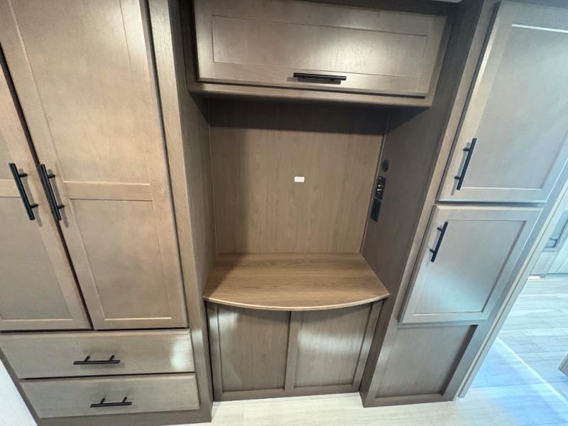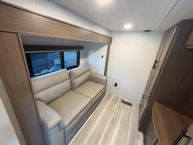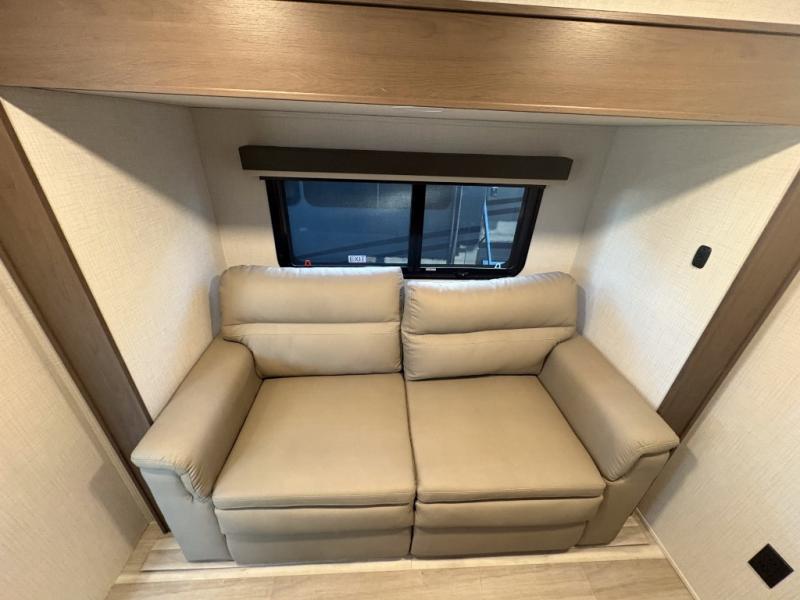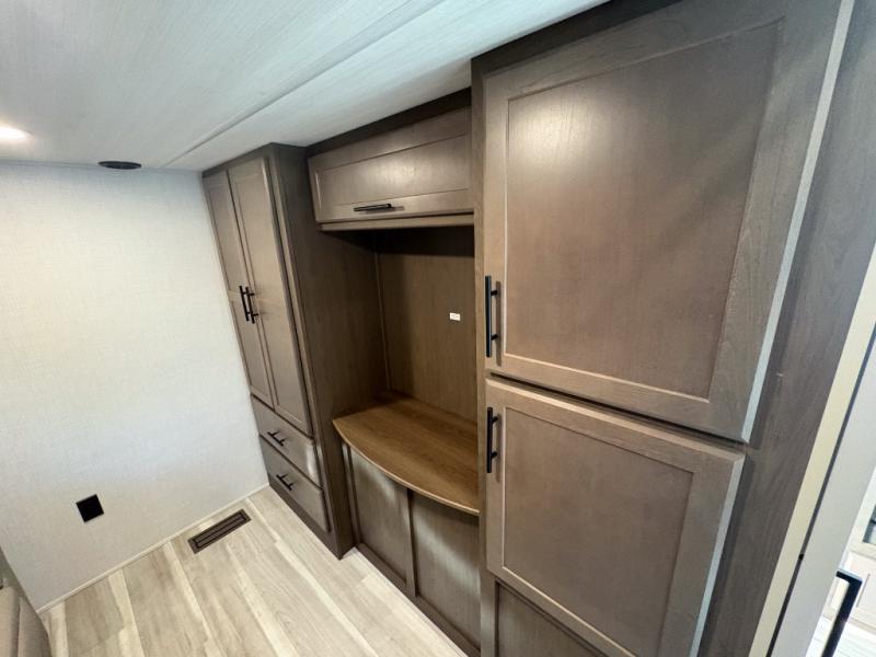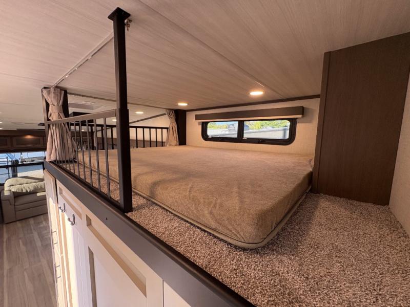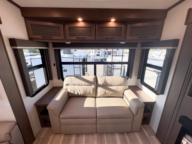 You'll love having an extra room that you can decide what to do with on this Cougar fifth wheel! There is a tri-fold sleeper sofa here, a desk plus two wardrobes for storage. Above this room is a loft which adds more sleeping space without taking up precious interior living space. And speaking of space, you'll find more of it in the main living area when you push out the opposing slides. A second tri-fold sleeper sofa sits in the living area, and there is also theater seating that you can rest on in front of the entertainment center with a hidden pantry and cordless vacuum prep behind. The full bathroom has a linen closet for your towels and washcloths, and there is also great storage in the front private bedroom with the under-bed storage, dresser with a sliding top, and a full-height wardrobe. Outside, you'll find two power awnings, an unobstructed pass-thru storage, and an outdoor kitchen prep area!