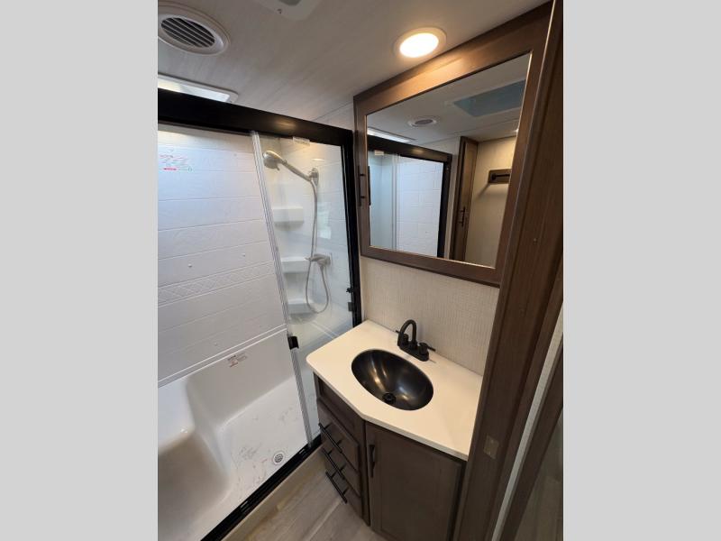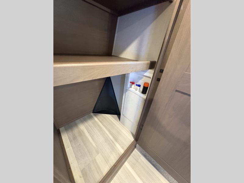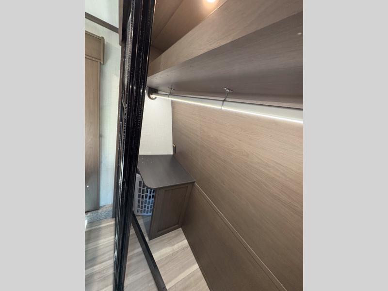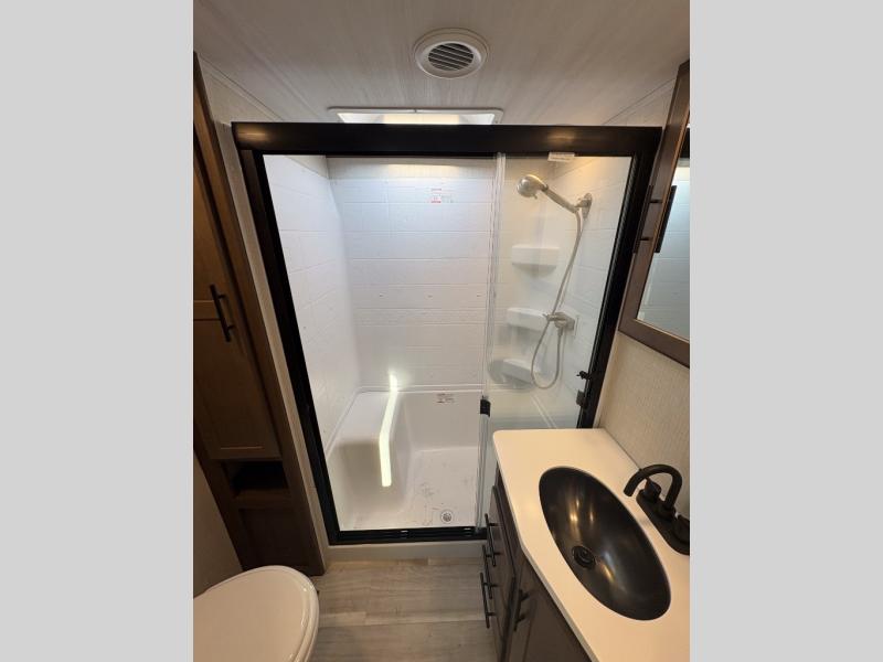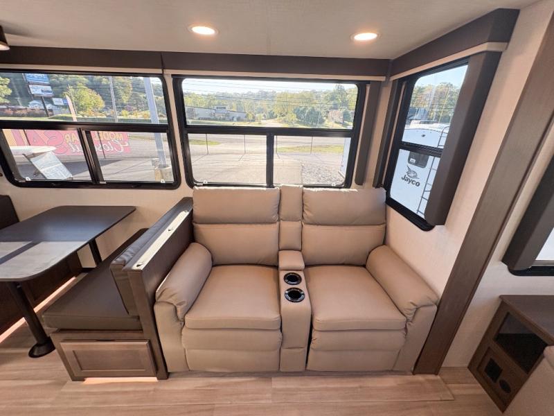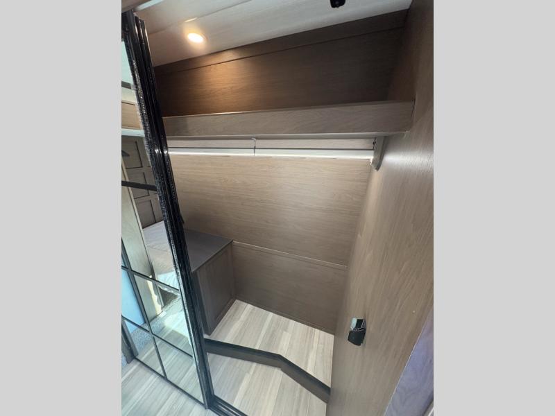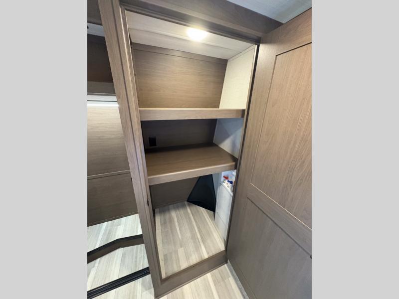 You'll love having an extra room that you can decide what to do with on this Cougar fifth wheel! There is a tri-fold sleeper sofa here, a desk plus two wardrobes for storage. Above this room is a loft which adds more sleeping space without taking up precious interior living space. And speaking of space, you'll find more of it in the main living area when you push out the opposing slides. A second tri-fold sleeper sofa sits in the living area, and there is also theater seating that you can rest on in front of the entertainment center with a hidden pantry and cordless vacuum prep behind. The full bathroom has a linen closet for your towels and washcloths, and there is also great storage in the front private bedroom with the under-bed storage, dresser with a sliding top, and a full-height wardrobe. Outside, you'll find two power awnings, an unobstructed pass-thru storage, and an outdoor kitchen prep area!